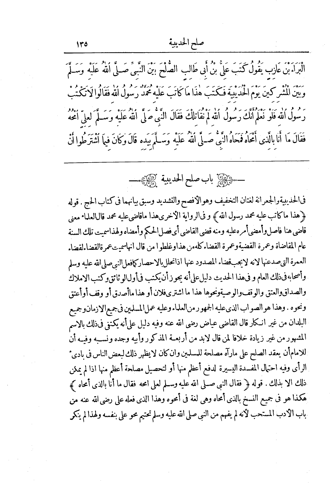 [1783] (هَذَا مَا كَاتَبَ عَلَيْهِ مُحَمَّدٌ رَسُولُ اللَّهِ) وَفِي الرِّوَايَةِ الْأُخْرَى هَذَا مَا قَاضَى عَلَيْهِ مُحَمَّدٌ قَالَ الْعُلَمَاءُ مَعْنَى قَاضَى هُنَا فَاصَلَ وَأَمْضَى أَمْرَهُ عَلَيْهِ وَمِنْهُ قَضَى الْقَاضِي أَيْ فَصَلَ الْحُكْمَ وَأَمْضَاهُ وَلِهَذَا سُمِّيَتْ تِلْكَ السَّنَةُ عَامَ الْمُقَاضَاةِ وَعُمْرَةَ الْقَضِيَّةِ وَعُمْرَةَ الْقَضَاءِ كُلُّهُ مِنْ هَذَا وَغَلَّطُوا مَنْ قَالَ إِنَّهَا سُمِّيَتْ عُمْرَةَ الْقَضَاءِ لِقَضَاءِ الْعُمْرَةِ التي صدعنها لِأَنَّهُ لَا يَجِبُ قَضَاءُ الْمَصْدُودِ عَنْهَا إِذَا تَحَلَّلَ بِالْإِحْصَارِ كَمَا فَعَلَ النَّبِيُّ صَلَّى اللَّهُ عَلَيْهِ وَسَلَّمَ وَأَصْحَابُهُ فِي ذَلِكَ الْعَامِ وَفِي هَذَا الْحَدِيثِ دَلِيلٌ عَلَى أَنَّهُ يَجُوزُ أَنْ يُكْتَبَ فِي أَوَّلِ الْوَثَائِقِ وَكُتُبِ الْإِمْلَاكِ وَالصَّدَاقِ وَالْعِتْقِ وَالْوَقْفِ وَالْوَصِيَّةِ وَنَحْوِهَا هَذَا مَا اشْتَرَى فُلَانٌ أَوْ هَذَا مَا أَصْدَقَ أَوْ وَقَفَ أَوْ أَعْتَقَ وَنَحْوَهُ وَهَذَا هُوَ الصَّوَابُ الَّذِي عَلَيْهِ الْجُمْهُورُ مِنَ الْعُلَمَاءِ وَعَلَيْهِ عَمَلُ الْمُسْلِمِينَ فِي جَمِيعِ الْأَزْمَانِ وَجَمِيعِ الْبُلْدَانِ مِنْ غَيْرِ إِنْكَارٍ قَالَ الْقَاضِي عِيَاضٌ رَضِيَ اللَّهُ عَنْهُ وَفِيهِ دَلِيلٌ عَلَى أَنَّهُ يُكْتَفَى فِي ذَلِكَ بالاسم الشهور من غير زيادة خلافا لمن قال لابد مِنْ أَرْبَعَةٍ الْمَذْكُورِ وَأَبِيهِ وَجَدِّهِ وَنَسَبِهِ وَفِيهِ أَنَّ لِلْإِمَامِ أَنْ يَعْقِدَ الصُّلْحَ عَلَى مَا رَآهُ مَصْلَحَةً لِلْمُسْلِمِينَ وَإِنْ كَانَ لَا يَظْهَرُ ذَلِكَ لِبَعْضِ النَّاسِ فِي بَادِئِ الرَّأْيِ وَفِيهِ احْتِمَالُ الْمَفْسَدَةِ الْيَسِيرَةِ لِدَفْعِ أَعْظَمَ مِنْهَا أَوْ لِتَحْصِيلِ مَصْلَحَةٍ أَعْظَمَ مِنْهَا إِذَا لَمْ يُمْكِنْ ذَلِكَ إِلَّا بِذَلِكَ قَوْلُهُ فَقَالَ النَّبِيُّ صَلَّى اللَّهُ عَلَيْهِ وَسَلَّمَ لِعَلِيٍّ امْحُهُ فَقَالَ مَا أَنَا بِالَّذِي أَمْحَاهُ هَكَذَا هُوَ فِي جَمِيعِ النُّسَخِ بِالَّذِي أَمْحَاهُ وَهِيَ لُغَةٌ فِي أَمْحُوهُ وَهَذَا الَّذِي فَعَلَهُ عَلِيٌّ رَضِيَ اللَّهُ عَنْهُ مِنْ بَابِ الْأَدَبِ الْمُسْتَحَبِّ لِأَنَّهُ لَمْ يَفْهَمْ مِنَ النَّبِيِّ صَلَّى اللَّهُ عَلَيْهِ وَسَلَّمَ تَحْتِيمَ مَحْوِ عَلِيٍّ بِنَفْسِهِ وَلِهَذَا لَمْ يُنْكِرْ)