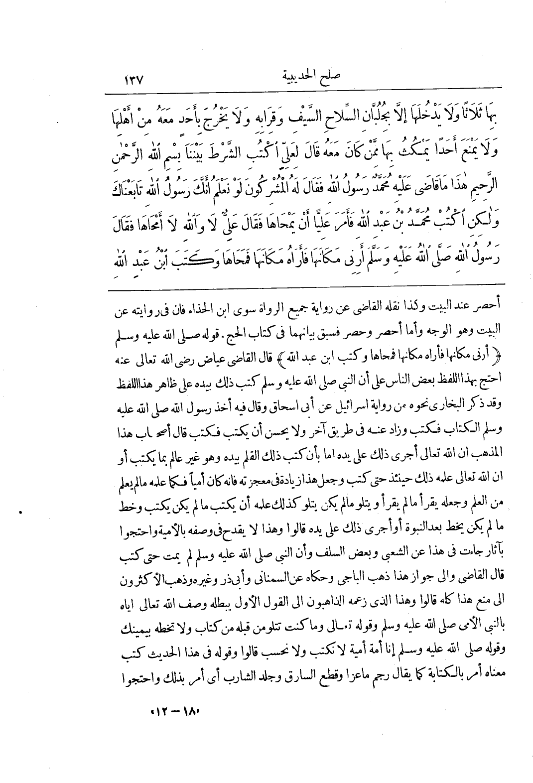 أُحْصِرَ عِنْدَ الْبَيْتِ وَكَذَا نَقَلَهُ الْقَاضِي عَنْ رواية جميع الرواة سوى بن الْحَذَّاءِ فَإِنَّ فِي رِوَايَتِهِ عَنِ الْبَيْتِ وَهُوَ الوجه وأما أحصر وَحُصِرَ فَسَبَقَ بَيَانُهُمَا فِي كِتَابِ الْحَجِّ قَوْلُهُ صَلَّى اللَّهُ عَلَيْهِ وَسَلَّمَ (أَرِنِي مَكَانَهَا فَأَرَاهُ مكانها فمحاها وكتب بن عَبْدِ اللَّهِ) قَالَ الْقَاضِي عِيَاضٌ رَضِيَ اللَّهُ تعالى عَنْهُ احْتَجَّ بِهَذَا اللَّفْظِ بَعْضُ النَّاسِ عَلَى أَنَّ النَّبِيَّ صَلَّى اللَّهُ عَلَيْهِ وَسَلَّمَ كتب ذَلِكَ بِيَدِهِ عَلَى ظَاهِرِ هَذَا اللَّفْظِ وَقَدْ ذَكَرَ الْبُخَارِيُّ نَحْوَهُ مِنْ رِوَايَةِ إِسْرَائِيلَ عَنْ أَبِي إِسْحَاقَ وَقَالَ فِيهِ أَخَذَ رَسُولُ اللَّهِ صَلَّى اللَّهُ عَلَيْهِ وَسَلَّمَ الْكِتَابَ فَكَتَبَ وَزَادَ عَنْهُ فِي طَرِيقٍ آخَرَ وَلَا يُحْسِنُ أَنْ يَكْتُبَ فَكَتَبَ قَالَ أَصْحَابُ هَذَا الْمَذْهَبِ إِنَّ اللَّهَ تَعَالَى أَجْرَى ذَلِكَ عَلَى يَدِهِ إِمَّا بِأَنْ كَتَبَ ذَلِكَ الْقَلَمُ بِيَدِهِ وَهُوَ غَيْرُ عَالِمٍ بِمَا يَكْتُبُ أَوْ أَنَّ اللَّهَ تَعَالَى عَلَّمَهُ ذَلِكَ حِينَئِذٍ حَتَّى كَتَبَ وَجَعَلَ هَذَا زيادة في معجزته فإنه كان أميا فكما علمه مالم يعلم من العلم وجعله يقرأ مالم يقرأ ويتلو مالم يكن يتلو كذلك علمه أن يكتب مالم يكن يكتب وخط مالم يكن يَخُطَّ بَعْدَ النُّبُوَّةِ أَوْ أَجْرَى ذَلِكَ عَلَى يَدِهِ قَالُوا وَهَذَا لَا يَقْدَحُ فِي وَصْفِهِ بِالْأُمِّيَّةِ وَاحْتَجُّوا بِآثَارٍ جَاءَتْ فِي هَذَا عَنِ الشعبي وبعض السلف وَأَنَّ النَّبِيَّ صَلَّى اللَّهُ عَلَيْهِ وَسَلَّمَ لَمْ يَمُتْ حَتَّى كَتَبَ قَالَ الْقَاضِي وَإِلَى جَوَازِ هَذَا ذَهَبَ الْبَاجِيُّ وَحَكَاهُ عَنِ السِّمَنَانِيِّ وَأَبِي ذَرٍّ وَغَيْرِهِ وَذَهَبَ الْأَكْثَرُونَ إِلَى مَنْعِ هَذَا كُلِّهِ قَالُوا وَهَذَا الَّذِي زَعَمَهُ الذَّاهِبُونَ إِلَى الْقَوْلِ الْأَوَّلِ يُبْطِلُهُ وَصْفُ اللَّهِ تَعَالَى إِيَّاهُ بِالنَّبِيِّ الْأُمِّيِّ صَلَّى اللَّهُ عَلَيْهِ وَسَلَّمَ وَقَوْلُهُ تَعَالَى وَمَا كُنْتَ تَتْلُو مِنْ قَبْلِهِ مِنْ كتاب ولا تخطه بيمينك وَقَوْلُهُ صَلَّى اللَّهُ عَلَيْهِ وَسَلَّمَ إِنَّا أُمَّةٌ أُمِّيَّةٌ لَا نَكْتُبُ وَلَا نَحْسِبُ قَالُوا وَقَوْلُهُ فِي هَذَا الْحَدِيثِ كَتَبَ مَعْنَاهُ أَمَرَ بِالْكِتَابَةِ كَمَا يُقَالُ رَجَمَ مَاعِزًا وَقَطَعَ السَّارِقَ وَجَلَدَ الشَّارِبَ أَيْ أَمَرَ بِذَلِكَ وَاحْتَجُّوا