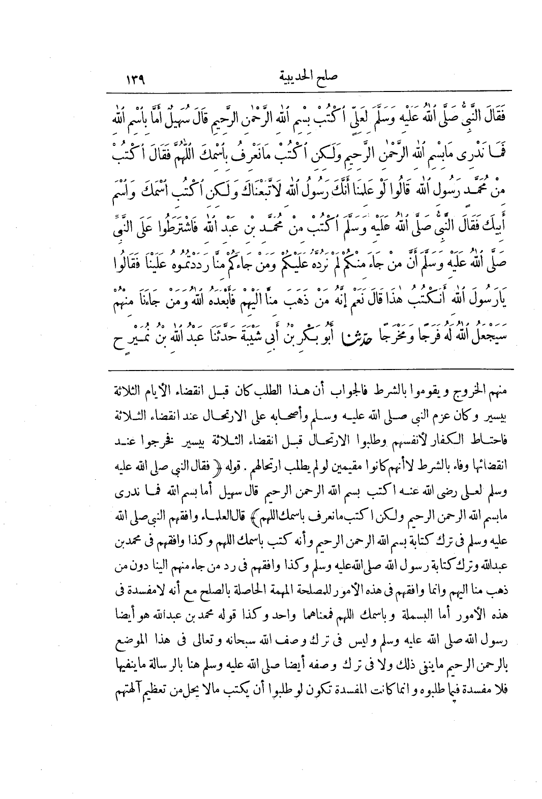 [1784] (فَقَالَ النَّبِيُّ صَلَّى اللَّهُ عَلَيْهِ وَسَلَّمَ لِعَلِيٍّ رَضِيَ اللَّهُ عَنْهُ اكْتُبْ بِسْمِ اللَّهِ الرَّحْمَنِ الرَّحِيمِ قَالَ سُهَيْلٌ أَمَّا بِسْمِ اللَّهِ فَمَا نَدْرِي مَا بِسْمِ اللَّهِ الرَّحْمَنِ الرَّحِيم ولكن اكتب ما نعرف بِاسْمِكَ اللَّهُمَّ) قَالَ الْعُلَمَاءُ وَافَقَهُمُ النَّبِيُّ صَلَّى اللَّهُ عَلَيْهِ وَسَلَّمَ فِي تَرْكِ كِتَابَةِ بِسْمِ اللَّهِ الرَّحْمَنِ الرَّحِيمِ وَأَنَّهُ كَتَبَ بِاسْمِكَ اللَّهُمَّ وَكَذَا وَافَقَهُمْ فِي مُحَمَّدِ بْنِ عَبْدِ اللَّهِ وَتَرَكَ كِتَابَةَ رَسُولِ اللَّهِ صَلَّى اللَّهُ عَلَيْهِ وَسَلَّمَ وَكَذَا وَافَقَهُمْ فِي رَدِّ مَنْ جَاءَ مِنْهُمْ إِلَيْنَا دُونَ مَنْ ذَهَبَ مِنَّا إِلَيْهِمْ وَإِنَّمَا وَافَقَهُمْ فِي هَذِهِ الْأُمُورِ لِلْمَصْلَحَةِ الْمُهِمَّةِ الْحَاصِلَةِ بِالصُّلْحِ مَعَ أَنَّهُ لَا مَفْسَدَةَ فِي هَذِهِ الْأُمُورِ أَمَّا الْبَسْمَلَةُ وَبِاسْمِكَ اللَّهُمَّ فَمَعْنَاهُمَا وَاحِدٌ وَكَذَا قَوْلُهُ مُحَمَّدُ بْنُ عَبْدِ اللَّهِ هُوَ أَيْضًا رَسُولِ اللَّهِ صَلَّى اللَّهُ عَلَيْهِ وَسَلَّمَ وَلَيْسَ فِي تَرْكِ وَصْفِ اللَّهِ سُبْحَانَهُ وَتَعَالَى فِي هَذَا الْمَوْضِعِ بِالرَّحْمَنِ الرَّحِيمِ مَا يَنْفِي ذَلِكَ وَلَا فِي تَرْكِ وَصْفِهِ أَيْضًا صَلَّى اللَّهُ عَلَيْهِ وَسَلَّمَ هُنَا بِالرِّسَالَةِ مَا يَنْفِيهَا فَلَا مَفْسَدَةَ فِيمَا طَلَبُوهُ وَإِنَّمَا كَانَتِ المفسدة تكون لو طلبوا أن يكتب مالا يَحِلُّ مِنْ تَعْظِيمِ آلِهَتِهِمْ