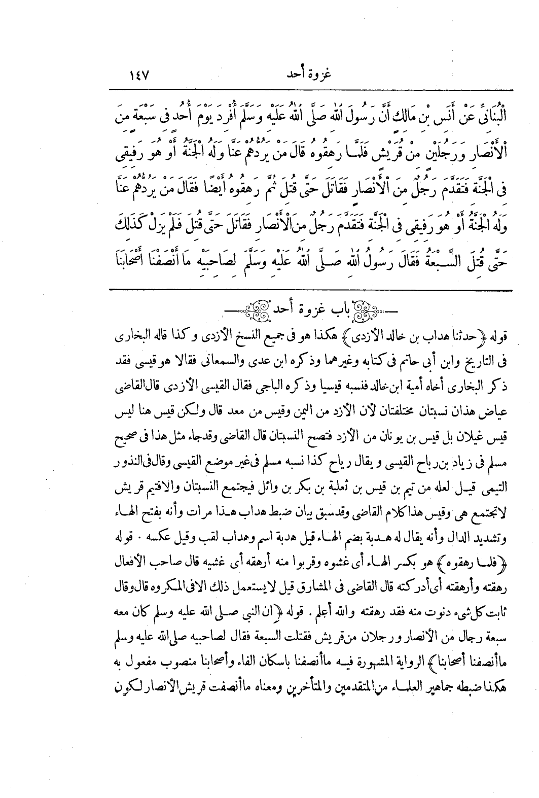 [1789] قَوْلُهُ (حَدَّثَنَا هَدَّابُ بْنُ خَالِدٍ الْأَزْدِيُّ) هَكَذَا هُوَ فِي جَمِيعِ النُّسَخِ الأزدي وكذا قاله البخاري في التاريخ وبن أبي حاتم في كتابه وغيرهما وذكره بن عَدِيٍّ وَالسَّمْعَانِيُّ فَقَالَا هُوَ قَيْسِيٌّ فَقَدْ ذَكَرَ الْبُخَارِيُّ أَخَاهُ أُمَيَّةَ بْنَ خَالِدٍ فَنَسَبَهُ قَيْسِيًّا وَذَكَرَهُ الْبَاجِيُّ فَقَالَ الْقَيْسِيُّ الْأَزْدِيُّ قَالَ الْقَاضِي عِيَاضٌ هَذَانِ نِسْبَتَانِ مُخْتَلِفَتَانِ لِأَنَّ الْأَزْدَ مِنَ الْيَمَنِ وَقَيْسَ مِنْ مَعَدٍّ قَالَ وَلَكِنْ قَيْسُ هُنَا لَيْسَ قَيْسَ غَيْلَانَ بَلْ قَيْسَ بْنَ يُونَانَ مِنَ الْأَزْدِ فَتَصِحُّ النِّسْبَتَانِ قَالَ الْقَاضِي وَقَدْ جَاءَ مِثْلُ هَذَا فِي صَحِيحِ مُسْلِمٍ فِي زِيَادِ بْنِ رَبَاحٍ الْقَيْسِيِّ وَيُقَالُ رِيَاحٌ كَذَا نَسَبَهُ مُسْلِمٌ فِي غَيْرِ مَوْضِعٍ الْقَيْسِيُّ وَقَالَ فِي النُّذُورِ التَّيْمِيُّ قِيلَ لَعَلَّهُ مِنْ تَيْمِ بْنِ قَيْسِ بْنِ ثَعْلَبَةَ بْنِ بَكْرِ بْنِ وَائِلٍ فَيَجْتَمِعُ النِّسْبَتَانِ وَإِلَّا فَتَيْمُ قُرَيْشٍ لَا تجْتَمِعُ هِيَ وَقَيْسٌ هَذَا كَلَامُ الْقَاضِي وَقَدْ سَبَقَ بَيَانُ ضَبْطِ هَدَّابٍ هَذَا مَرَّاتٍ وَأَنَّهُ بِفَتْحِ الْهَاءِ وَتَشْدِيدِ الدَّالِ وَأَنَّهُ يُقَالُ لَهُ هُدْبَةُ بِضَمِّ الْهَاءِ قِيلَ هُدْبَةُ اسْمٌ وَهَدَّابٌ لَقَبٌ وَقِيلَ عَكْسُهُ قَوْلُهُ (فَلَمَّا رَهِقُوهُ) هُوَ بِكَسْرِ الْهَاءِ أَيْ غَشُوهُ وَقَرُبُوا مِنْهُ أَرْهَقَهُ أَيْ غَشِيَهُ قَالَ صَاحِبُ الْأَفْعَالِ رَهِقْتُهُ وَأَرْهَقْتُهُ أَيْ أَدْرَكْتُهُ قَالَ الْقَاضِي فِي الْمَشَارِقِ قِيلَ لَا يُسْتَعْمَلُ ذَلِكَ إِلَّا فِي الْمَكْرُوهِ قَالَ وَقَالَ ثَابِتٌ كُلُّ شَيْءٍ دَنَوْتَ مِنْهُ فَقَدْ رَهِقْتَهُ وَاللَّهُ أَعْلَمُ قَوْلُهُ (أَنَّ النَّبِيَّ صَلَّى اللَّهُ عَلَيْهِ وَسَلَّمَ كَانَ مَعَهُ سَبْعَةُ رِجَالٍ مِنَ الْأَنْصَارِ وَرَجُلَانِ مِنْ قُرَيْشٍ فَقُتِلَتِ السَّبْعَةُ فَقَالَ لِصَاحِبَيْهِ صَلَّى اللَّهُ عَلَيْهِ وَسَلَّمَ مَا أَنْصَفْنَا أَصْحَابَنَا) الرِّوَايَةُ الْمَشْهُورَةُ فِيهِ مَا أنصفنا بإسكان الفاء وأصحابنا مَنْصُوبٌ مَفْعُولٌ بِهِ هَكَذَا ضَبَطَهُ جَمَاهِيرُ الْعُلَمَاءِ مِنَ الْمُتَقَدِّمِينَ وَالْمُتَأَخِّرِينَ وَمَعْنَاهُ مَا أَنْصَفَتْ قُرَيْشٌ الأنصار لكون)