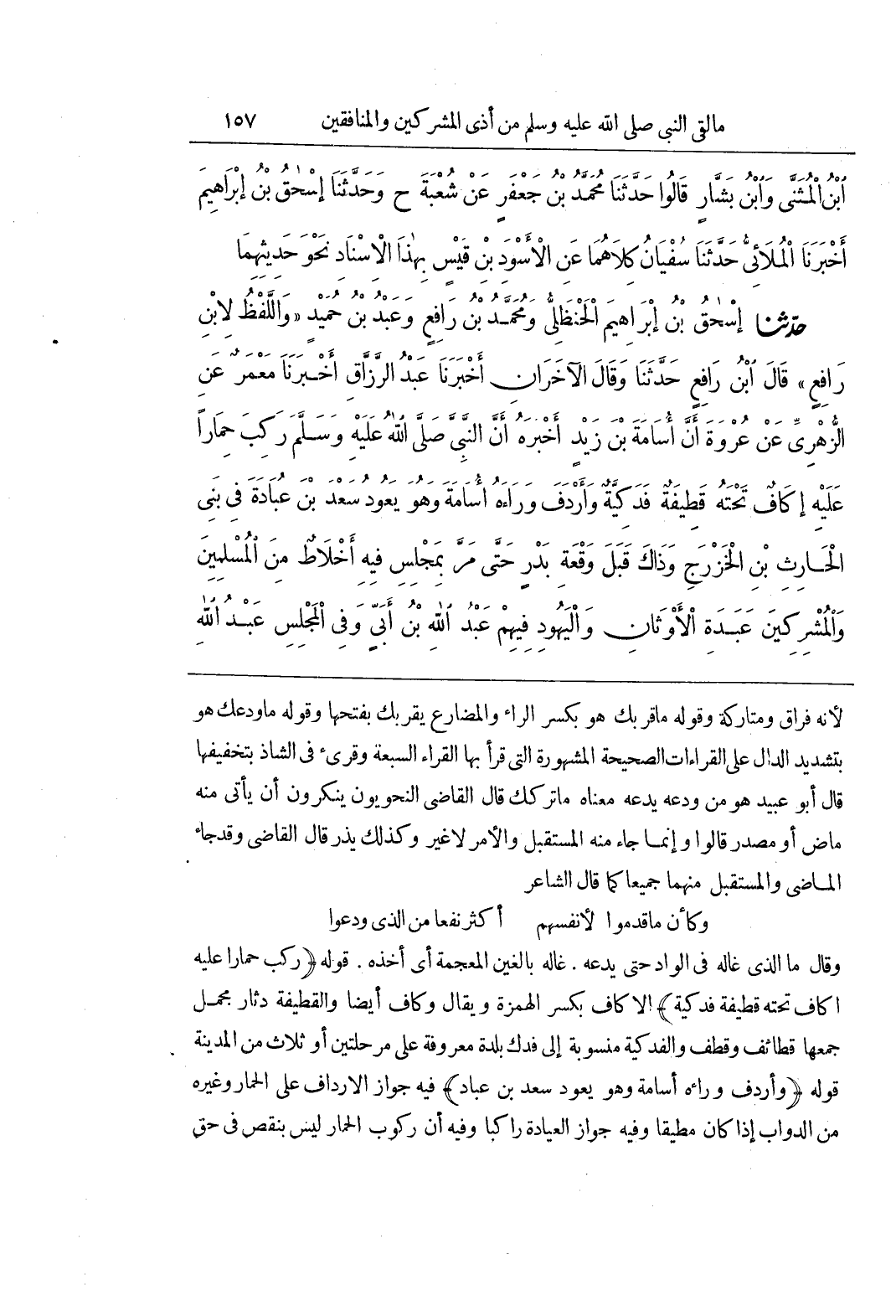 [1798] (رَكِبَ حِمَارًا عَلَيْهِ إِكَافٌ تَحْتَهُ قَطِيفَةٌ فدكية) إلا كاف بِكَسْرِ الْهَمْزَةِ وَيُقَالُ وِكَافٌ أَيْضًا وَالْقَطِيفَةُ دِثَارٌ مخمل جَمْعُهَا قَطَائِفُ وَقُطُفٌ وَالْفَدَكِيَّةُ مَنْسُوبَةٌ إِلَى فَدَكٍ بَلْدَةٍ مَعْرُوفَةٍ عَلَى مَرْحَلَتَيْنِ أَوْ ثَلَاثٍ مِنَ الْمَدِينَةِ قَوْلُهُ (وَأَرْدَفَ وَرَاءَهُ أُسَامَةَ وَهُوَ يَعُودُ سعد بن عباد) 1 فِيهِ جَوَازُ الْإِرْدَافِ عَلَى الْحِمَارِ وَغَيْرِهِ مِنَ الدَّوَابِّ إِذَا كَانَ مُطِيقًا وَفِيهِ 2 جَوَازُ الْعِيَادَةِ رَاكِبًا وَفِيهِ 3 أَنَّ رُكُوبَ الْحِمَارِ لَيْسَ بِنَقْصٍ في حق)