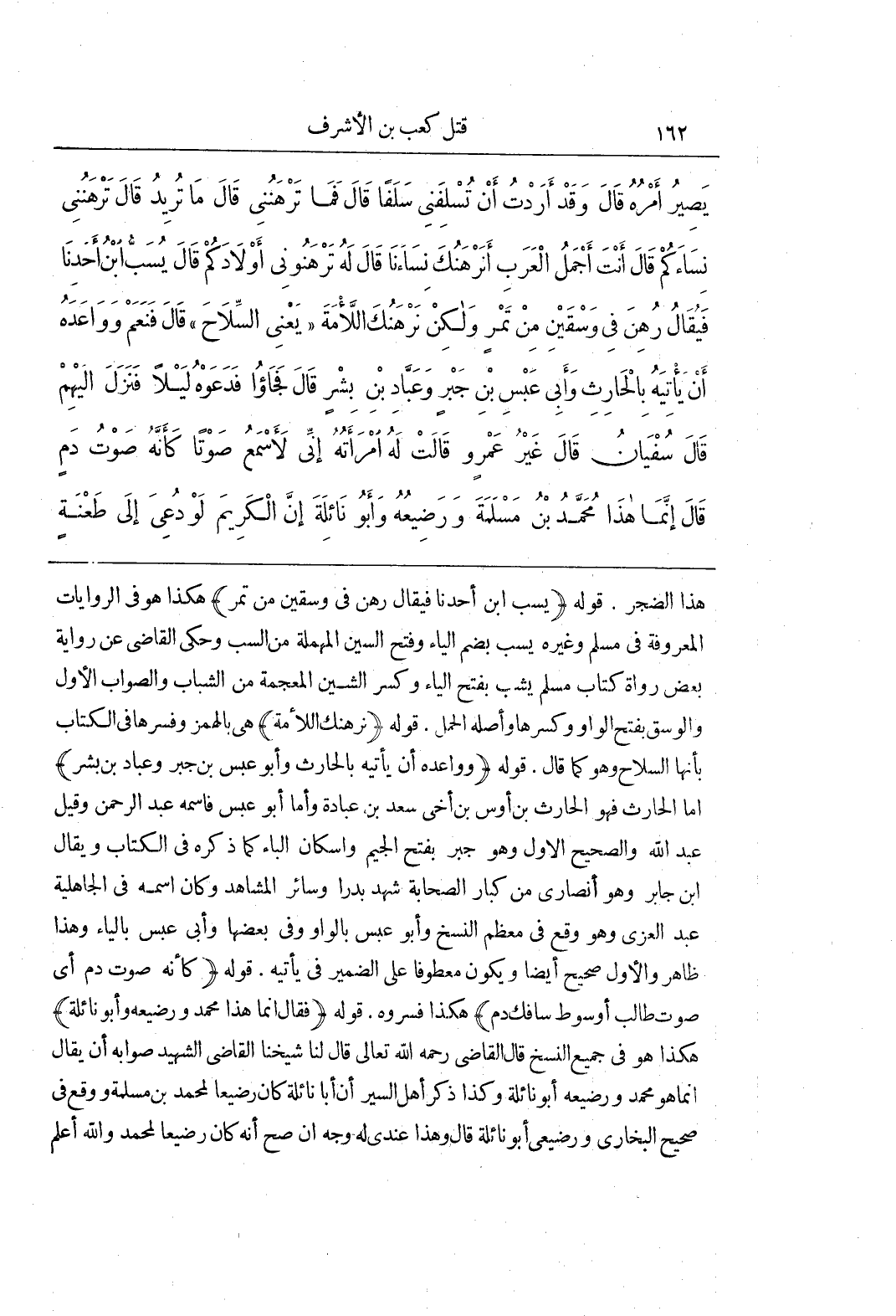 هذا الضجر قوله (يسب بن أَحَدِنَا فَيُقَالُ رُهِنَ فِي وَسْقَيْنِ مِنْ تَمْرٍ) هَكَذَا هُوَ فِي الرِّوَايَاتِ الْمَعْرُوفَةِ فِي مُسْلِمٍ وَغَيْرِهِ يُسَبُّ بِضَمِّ الْيَاءِ وَفَتْحِ السِّينِ الْمُهْمَلَةِ مِنَ السَّبِّ وَحَكَى الْقَاضِي عَنْ رِوَايَةِ بَعْضِ رواة كِتَابَ مُسْلِمٍ يَشِبُّ بِفَتْحِ الْيَاءِ وَكَسْرِ الشِّينِ المعجمة من الشباب والصواب الأول والوسق بِفَتْحِ الْوَاوِ وَكَسْرِهَا وَأَصْلُهُ الْحِمْلُ قَوْلُهُ (نَرْهَنُكَ اللأمة) هي بالهمز وَفَسَّرَهَا فِي الْكِتَابِ بِأَنَّهَا السِّلَاحُ وَهُوَ كَمَا قَالَ قَوْلُهُ (وَوَاعَدَهُ أَنْ يَأْتِيَهُ بِالْحَارِثِ وَأَبُو عَبْسِ بْنُ جَبْرٍ وَعَبَّادُ بْنُ بِشْرٍ) أَمَّا الحارث فهو الحارث بن أوس بن أَخِي سَعْدِ بْنِ عُبَادَةَ وَأَمَّا أَبُو عَبْسٍ فَاسْمُهُ عَبْدُ الرَّحْمَنِ وَقِيلَ عَبْدُ اللَّهِ وَالصَّحِيحُ الْأَوَّلُ وَهُوَ جَبْرٌ بِفَتْحِ الْجِيمِ وَإِسْكَانِ الْبَاءِ كما ذكره في الكتاب ويقال بن جَابِرٍ وَهُوَ أَنْصَارِيٌّ مِنْ كِبَارِ الصَّحَابَةِ شَهِدَ بَدْرًا وَسَائِرَ الْمَشَاهِدِ وَكَانَ اسْمُهُ فِي الْجَاهِلِيَّةِ عَبْدَ الْعُزَّى وَهُوَ وَقَعَ فِي مُعْظَمِ النُّسَخِ وَأَبُو عَبْسٍ بِالْوَاوِ وَفِي بَعْضِهَا وَأَبِي عِيسٍ بِالْيَاءِ وَهَذَا ظَاهِرٌ وَالْأَوَّلُ صَحِيحٌ أَيْضًا وَيَكُونُ مَعْطُوفًا عَلَى الضَّمِيرِ فِي يَأْتِيهِ قَوْلُهُ (كَأَنَّهُ صوت دم أي صوت طالب أو سوط سَافِكِ دَمٍ) هَكَذَا فَسَّرُوهُ قَوْلُهُ (فَقَالَ إِنَّمَا هَذَا مُحَمَّدٌ وَرَضِيعُهُ وَأَبُو نَائِلَةَ) هَكَذَا هُوَ فِي جَمِيعِ النُّسَخِ قَالَ الْقَاضِي رَحِمَهُ اللَّهُ تَعَالَى قَالَ لَنَا شَيْخُنَا الْقَاضِي الشَّهِيدُ صَوَابُهُ أَنْ يُقَالَ إِنَّمَا هُوَ مُحَمَّدٌ وَرَضِيعُهُ أَبُو نَائِلَةَ وَكَذَا ذَكَرَ أَهْلُ السِّيَرِ أَنَّ أَبَا نَائِلَةَ كَانَ رَضِيعًا لِمُحَمَّدِ بْنِ مَسْلَمَةَ وَوَقَعَ فِي صَحِيحِ الْبُخَارِيِّ وَرَضِيعِي أَبُو نَائِلَةَ قَالَ وَهَذَا عِنْدِي لَهُ وَجْهٌ إِنْ صَحَّ أَنَّهُ كَانَ رَضِيعًا لِمُحَمَّدٍ وَاللَّهُ أَعْلَمُ