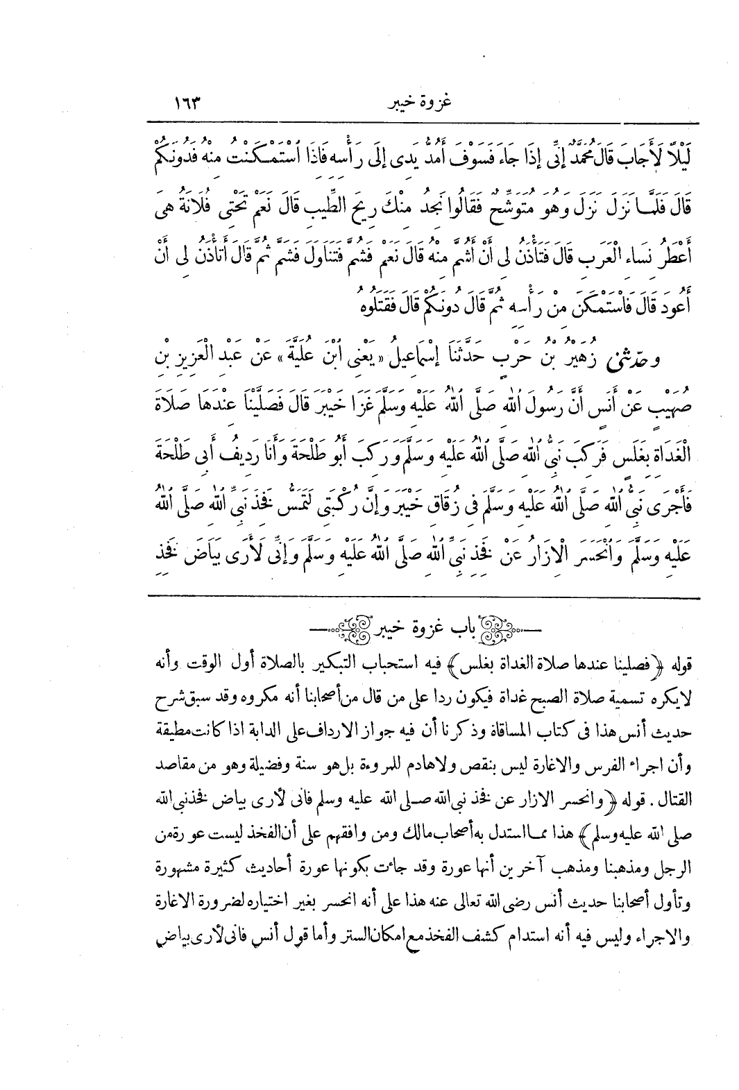 [1365] قوله (فصلينا عندها صلاة الْغَدَاةَ بِغَلَسٍ) فِيهِ اسْتِحْبَابُ التَّبْكِيرِ بِالصَّلَاةِ أَوَّلَ الْوَقْتِ وَأَنَّهُ لَا يُكْرَهُ تَسْمِيَةُ صَلَاةِ الصُّبْحِ غَدَاةً فَيَكُونُ رَدًّا عَلَى مَنْ قَالَ مِنْ أَصْحَابِنَا إِنَّهُ مَكْرُوهٌ وَقَدْ سَبَقَ شَرْحُ حَدِيثِ أَنَسٍ هَذَا فِي كِتَابِ الْمُسَاقَاةِ وَذَكَرْنَا أَنَّ فِيهِ جَوَازَ الْإِرْدَافِ عَلَى الدَّابَّةِ إِذَا كَانَتْ مُطِيقَةً وَأَنَّ إِجْرَاءَ الْفَرَسِ وَالْإِغَارَةَ لَيْسَ بِنَقْصٍ وَلَا هَادِمٍ لِلْمُرُوءَةِ بَلْ هُوَ سُنَّةٌ وَفَضِيلَةٌ وَهُوَ مِنْ مَقَاصِدِ الْقِتَالِ قَوْلُهُ (وَانْحَسَرَ الْإِزَارُ عَنْ فَخِذِ نَبِيِّ اللَّهِ صَلَّى اللَّهُ عَلَيْهِ وَسَلَّمَ فَإِنِّي لَأَرَى بَيَاضَ فَخِذِ نَبِيِّ اللَّهِ صَلَّى اللَّهُ عَلَيْهِ وَسَلَّمَ) هَذَا مِمَّا اسْتَدَلَّ بِهِ أَصْحَابُ مَالِكٍ وَمَنْ وَافَقَهُمْ عَلَى أَنَّ الْفَخِذَ لَيْسَتْ عَوْرَةً مِنَ الرَّجُلِ وَمَذْهَبُنَا وَمَذْهَبُ آخَرِينَ أَنَّهَا عَوْرَةٌ وَقَدْ جَاءَتْ بِكَوْنِهَا عَوْرَةً أَحَادِيثُ كَثِيرَةٌ مَشْهُورَةٌ وَتَأَوَّلَ أَصْحَابُنَا حَدِيثَ أَنَسٍ رَضِيَ اللَّهُ تَعَالَى عَنْهُ هَذَا عَلَى أَنَّهُ انْحَسَرَ بِغَيْرِ اخْتِيَارِهِ لِضَرُورَةِ الْإِغَارَةِ وَالْإِجْرَاءِ وَلَيْسَ فِيهِ أَنَّهُ اسْتَدَامَ كَشْفُ الْفَخِذِ مَعَ إِمْكَانِ السَّتْرِ وَأَمَّا قَوْلُ أَنَسٍ فَإِنِّي لَأَرَى بَيَاضَ)