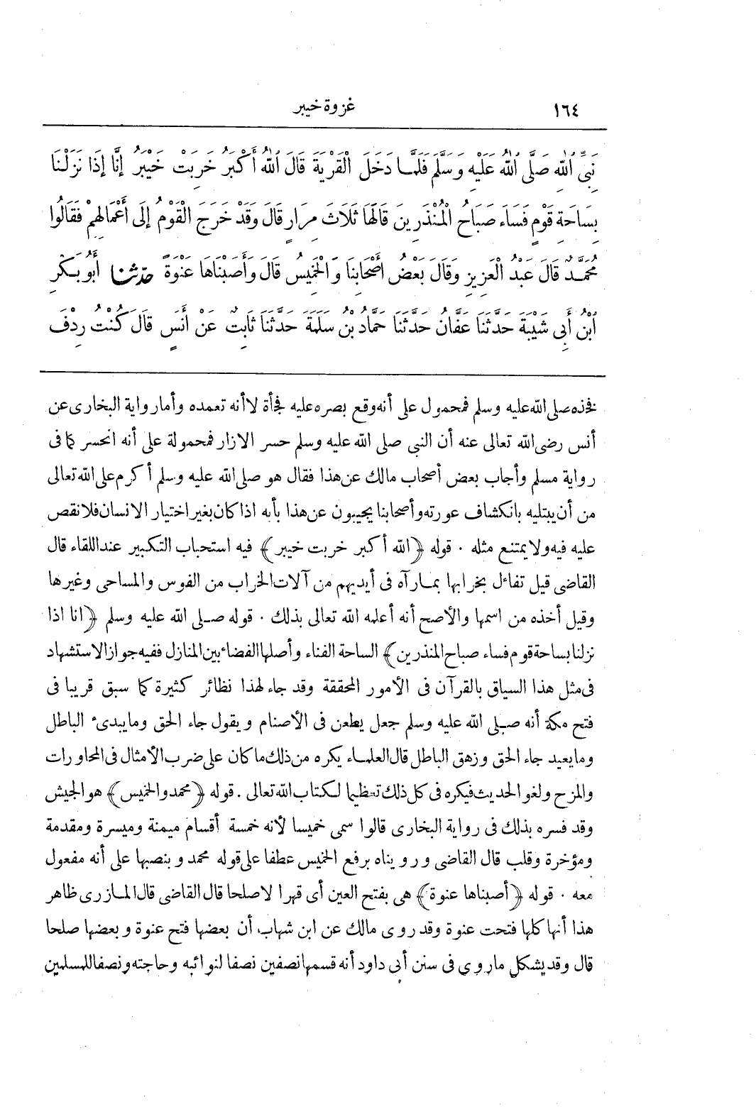 فَخِذِهِ صَلَّى اللَّهُ عَلَيْهِ وَسَلَّمَ فَمَحْمُولٌ عَلَى أَنَّهُ وَقَعَ بَصَرُهُ عَلَيْهِ فَجْأَةً لَا أَنَّهُ تَعَمَّدَهُ وَأَمَّا رِوَايَةُ الْبُخَارِيِّ عَنْ أَنَسٍ رَضِيَ اللَّهُ تَعَالَى عَنْهُ أَنَّ النَّبِيَّ صَلَّى اللَّهُ عَلَيْهِ وَسَلَّمَ حَسَرَ الْإِزَارَ فَمَحْمُولَةٌ عَلَى أَنَّهُ انْحَسَرَ كَمَا فِي رِوَايَةِ مُسْلِمٍ وَأَجَابَ بَعْضُ أَصْحَابِ مَالِكٍ عَنْ هَذَا فَقَالَ هُوَ صَلَّى اللَّهُ عَلَيْهِ وَسَلَّمَ أَكْرَمُ عَلَى اللَّهِ تَعَالَى مِنْ أَنْ يَبْتَلِيَهُ بِانْكِشَافِ عَوْرَتِهِ وَأَصْحَابُنَا يُجِيبُونَ عَنْ هَذَا بِأَنَّهُ إِذَا كَانَ بِغَيْرِ اخْتِيَارِ الْإِنْسَانِ فَلَا نَقْصَ عَلَيْهِ فِيهِ وَلَا يَمْتَنِعُ مِثْلُهُ قَوْلُهُ (اللَّهُ أَكْبَرُ خَرِبَتْ خَيْبَرُ) فِيهِ اسْتِحْبَابُ التَّكْبِيرِ عِنْدَ اللِّقَاءِ قَالَ الْقَاضِي قِيلَ تَفَاءَلَ بِخَرَابِهَا بِمَا رَآهُ فِي أَيْدِيهِمْ مِنْ آلَاتِ الْخَرَابِ مِنَ الْفُوسِ وَالْمَسَاحِي وَغَيْرِهَا وَقِيلَ أَخَذَهُ مِنَ اسْمِهَا وَالْأَصَحُّ أَنَّهُ أَعْلَمَهُ اللَّهُ تَعَالَى بِذَلِكَ قَوْلُهُ صَلَّى اللَّهُ عَلَيْهِ وَسَلَّمَ (إِنَّا إِذَا نَزَلْنَا بِسَاحَةِ قَوْمٍ فَسَاءَ صَبَاحُ الْمُنْذَرِينَ) السَّاحَةُ الْفِنَاءُ وَأَصْلُهَا الْفَضَاءُ بَيْنَ الْمَنَازِلِ فَفِيهِ جَوَازُ الِاسْتِشْهَادِ فِي مِثْلِ هَذَا السِّيَاقِ بِالْقُرْآنِ فِي الْأُمُورِ الْمُحَقَّقَةِ وَقَدْ جَاءَ لِهَذَا نَظَائِرُ كَثِيرَةٌ كَمَا سَبَقَ قَرِيبًا فِي فَتْحِ مَكَّةَ أَنَّهُ صَلَّى اللَّهُ عَلَيْهِ وَسَلَّمَ جَعَلَ يَطْعُنُ فِي الْأَصْنَامِ وَيَقُولُ جَاءَ الْحَقُّ وَمَا يُبْدِئُ الْبَاطِلُ وَمَا يُعِيدُ جَاءَ الْحَقُّ وَزَهَقَ الْبَاطِلُ قَالَ الْعُلَمَاءُ يُكْرَهُ مِنْ ذَلِكَ مَا كَانَ عَلَى ضَرْبِ الْأَمْثَالِ فِي الْمُحَاوَرَاتِ وَالْمَزْحِ وَلَغْوِ الْحَدِيثِ فَيُكْرَهُ فِي كُلِّ ذَلِكَ تَعْظِيمًا لِكِتَابِ اللَّهِ تَعَالَى قَوْلُهُ (مُحَمَّدٌ وَالْخَمِيسُ) هُوَ الْجَيْشُ وَقَدْ فَسَّرَهُ بِذَلِكَ فِي رِوَايَةِ الْبُخَارِيِّ قَالُوا سُمِّيَ خَمِيسًا لِأَنَّهُ خَمْسَةُ أَقْسَامٍ مَيْمَنَةٌ وَمَيْسَرَةٌ وَمُقَدِّمَةٌ وَمُؤَخِّرَةٌ وَقَلْبٌ قَالَ الْقَاضِي وَرُوِّينَاهُ بِرَفْعِ الْخَمِيسُ عَطْفًا عَلَى قَوْلِهِ مُحَمَّدٌ وَبِنَصَبِهَا عَلَى أَنَّهُ مَفْعُولٌ مَعَهُ قَوْلُهُ (أَصَبْنَاهَا عَنْوَةً) هِيَ بِفَتْحِ الْعَيْنِ أَيْ قَهْرًا لَا صُلْحًا قَالَ الْقَاضِي قَالَ الْمَازِرِيُّ ظَاهِرُ هَذَا أَنَّهَا كُلَّهَا فُتِحَتْ عَنْوَةً وَقَدْ رَوَى مَالِكٌ عَنِ بن شِهَابٍ أَنَّ بَعْضَهَا فُتِحَ عَنْوَةً وَبَعْضَهَا صُلْحًا قَالَ وَقَدْ يُشْكِلُ مَا رُوِيَ فِي سُنَنِ أَبِي دَاوُدَ أَنَّهُ قَسَمَهَا نِصْفَيْنِ نِصْفًا لِنَوَائِبِهِ وَحَاجَتِهِ وَنِصْفًا لِلْمُسْلِمِينَ