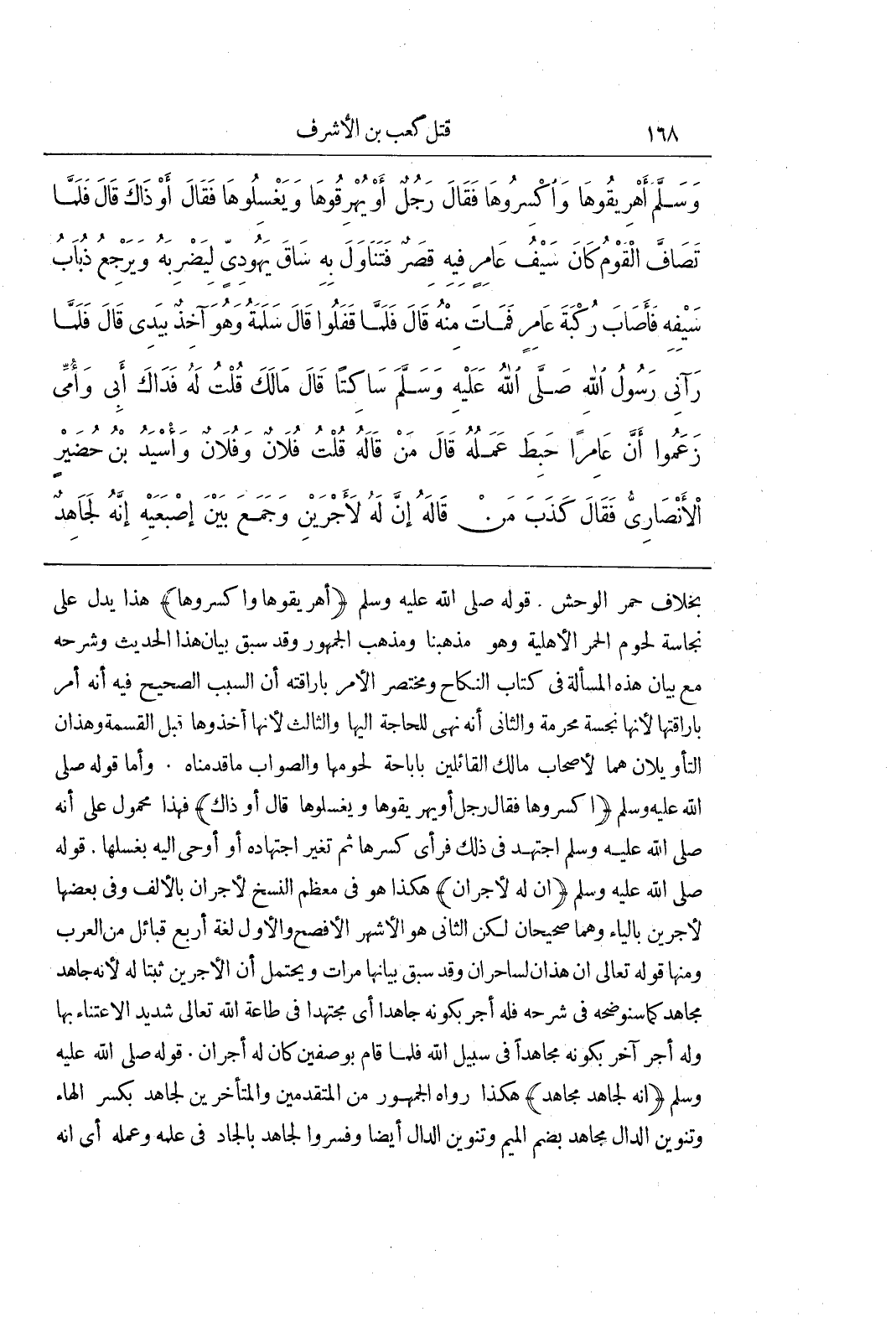 بِخِلَافِ حُمُرِ الْوَحْشِ قَوْلُهُ صَلَّى اللَّهُ عَلَيْهِ وَسَلَّمَ (أَهْرِيقُوهَا وَاكْسِرُوهَا) هَذَا يَدُلُّ عَلَى نَجَاسَةِ لُحُومِ الْحُمُرِ الْأَهْلِيَّةِ وَهُوَ مَذْهَبُنَا وَمَذْهَبُ الْجُمْهُورِ وَقَدْ سَبَقَ بَيَانُ هَذَا الْحَدِيثِ وَشَرْحُهُ مَعَ بَيَانِ هَذِهِ الْمَسْأَلَةِ فِي كِتَابِ النِّكَاحِ وَمُخْتَصَرُ الْأَمْرِ بِإِرَاقَتِهِ أَنَّ السَّبَبَ الصَّحِيحَ فِيهِ أَنَّهُ أَمَرَ بِإِرَاقَتِهَا لِأَنَّهَا نَجِسَةٌ مُحَرَّمَةٌ وَالثَّانِي أَنَّهُ نَهَى لِلْحَاجَةِ إِلَيْهَا وَالثَّالِثُ لِأَنَّهَا أَخَذُوهَا قَبْلَ الْقِسْمَةِ وَهَذَانِ التَّأْوِيلَانِ هُمَا لِأَصْحَابِ مَالِكٍ الْقَائِلِينَ بِإِبَاحَةِ لُحُومِهَا وَالصَّوَابُ مَا قَدَّمْنَاهُ وَأَمَّا قَوْلُهُ صَلَّى اللَّهُ عَلَيْهِ وَسَلَّمَ (اكْسِرُوهَا فَقَالَ رَجُلٌ أَوْ يُهْرِيقُوهَا وَيَغْسِلُوهَا قَالَ أَوْ ذَاكَ) فَهَذَا مَحْمُولٌ عَلَى أَنَّهُ صَلَّى اللَّهُ عَلَيْهِ وَسَلَّمَ اجْتَهَدَ فِي ذَلِكَ فَرَأَى كَسْرَهَا ثُمَّ تَغَيَّرَ اجْتِهَادُهُ أَوْ أُوحِيَ إِلَيْهِ بِغَسْلِهَا قَوْلُهُ صَلَّى اللَّهُ عَلَيْهِ وَسَلَّمَ (إِنَّ لَهُ لَأَجْرَانِ) هَكَذَا هُوَ فِي مُعْظَمِ النُّسَخِ لَأَجْرَانِ بِالْأَلِفِ وَفِي بَعْضِهَا لَأَجْرَيْنِ بِالْيَاءِ وَهُمَا صَحِيحَانِ لَكِنَّ الثَّانِيَ هُوَ الْأَشْهَرُ الْأَفْصَحُ وَالْأَوَّلُ لُغَةُ أَرْبَعِ قَبَائِلَ من العرب ومنها قوله تعالى إن هذان لساحران وَقَدْ سَبَقَ بَيَانُهَا مَرَّاتٍ وَيَحْتَمِلُ أَنَّ الْأَجْرَيْنِ ثَبَتَا لَهُ لِأَنَّهُ جَاهَدَ مُجَاهِدٌ كَمَا سَنُوَضِّحُهُ فِي شَرْحِهِ فَلَهُ أَجْرٌ بِكَوْنِهِ جَاهِدًا أَيْ مُجْتَهِدًا فِي طَاعَةِ اللَّهِ تَعَالَى شَدِيدَ الِاعْتِنَاءِ بِهَا وَلَهُ أَجْرٌ آخَرُ بِكَوْنِهِ مُجَاهِدًا فِي سَبِيلِ اللَّهِ فَلَمَّا قَامَ بِوَصْفَيْنِ كَانَ لَهُ أَجْرَانِ قَوْلُهُ صَلَّى اللَّهُ عَلَيْهِ وَسَلَّمَ (إِنَّهُ لَجَاهِدٌ مُجَاهِدٌ) هَكَذَا رَوَاهُ الْجُمْهُورُ مِنَ الْمُتَقَدِّمِينَ وَالْمُتَأَخِّرِينَ لَجَاهِدٌ بِكَسْرِ الْهَاءِ وَتَنْوِينِ الدَّالِ مُجَاهِدٌ بِضَمِّ الْمِيمِ وَتَنْوِينِ الدَّالِ أَيْضًا وَفَسَّرُوا لَجَاهِدٌ بِالْجَادِّ فِي عِلْمِهِ وَعَمَلِهِ أَيْ إِنَّهُ