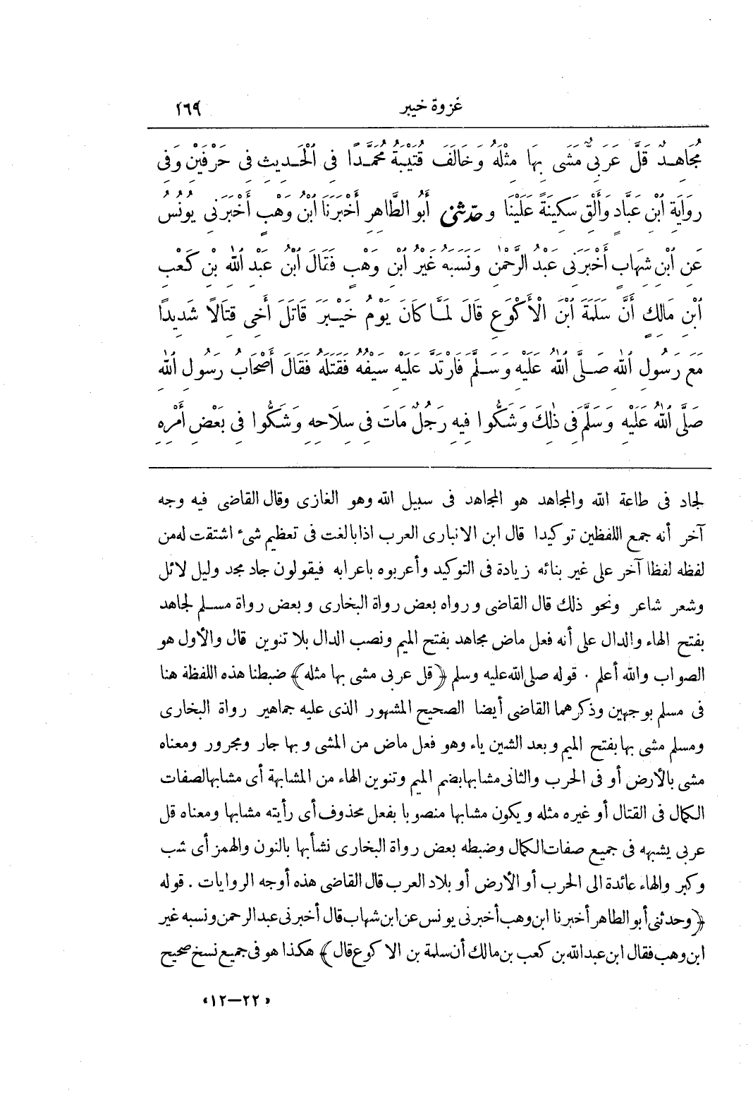 لَجَادٌّ فِي طَاعَةِ اللَّهِ وَالْمُجَاهِدُ فِي سَبِيلِ اللَّهِ وَهُوَ الْغَازِي وَقَالَ الْقَاضِي فِيهِ وَجْهٌ آخر أنه جمع اللفظين توكيدا قال بن الْأَنْبَارِيِّ الْعَرَبُ إِذَا بَالَغَتْ فِي تَعْظِيمِ شَيْءٍ اشْتَقَّتْ لَهُ مِنْ لَفْظِهِ لَفْظًا آخَرَ عَلَى غَيْرِ بِنَائِهِ زِيَادَةً فِي التَّوْكِيدِ وَأَعْرَبُوهُ بِإِعْرَابِهِ فَيَقُولُونَ جَادٌّ مُجِدٌّ وَلَيْلٌ لَائِلٌ وَشِعْرٌ شَاعِرٌ وَنَحْوَ ذَلِكَ قَالَ الْقَاضِي وَرَوَاهُ بَعْضُ رُوَاةِ الْبُخَارِيِّ وَبَعْضُ رُوَاةِ مُسْلِمٍ لَجَاهَدَ بِفَتْحِ الْهَاءِ وَالدَّالِ عَلَى أَنَّهُ فِعْلٌ مَاضٍ مَجَاهِدَ بِفَتْحِ الْمِيمِ وَنَصْبِ الدَّالِ بِلَا تَنْوِينٍ قَالَ وَالْأَوَّلُ هُوَ الصَّوَابِ وَاللَّهُ أَعْلَمُ قَوْلُهُ صَلَّى اللَّهُ عَلَيْهِ وَسَلَّمَ (قَلَّ عَرَبِيٌّ مَشَى بِهَا مِثْلَهُ) ضَبَطْنَا هَذِهِ اللَّفْظَةَ هُنَا فِي مُسْلِمٍ بِوَجْهَيْنِ وَذَكَرَهُمَا الْقَاضِي أَيْضًا الصَّحِيحُ الْمَشْهُورُ الَّذِي عَلَيْهِ جماهير رواة البخاري ومسلم مشى بها بفتح الميم وَبَعْدَ الشِّينِ يَاءٌ وَهُوَ فِعْلٌ مَاضٍ مِنَ المشى وبها جَارٌّ وَمَجْرُورٌ وَمَعْنَاهُ مَشَى بِالْأَرْضِ أَوْ فِي الْحَرْبِ وَالثَّانِي مُشَابِهًا بِضَمِّ الْمِيمِ وَتَنْوِينِ الْهَاءِ مِنَ الْمُشَابَهَةِ أَيْ مُشَابِهًا لِصِفَاتِ الْكَمَالِ فِي الْقِتَالِ أَوْ غَيْرِهِ مِثْلَهُ وَيَكُونُ مُشَابِهًا مَنْصُوبًا بِفِعْلٍ مَحْذُوفٍ أَيْ رَأَيْتُهُ مُشَابِهًا وَمَعْنَاهُ قَلَّ عَرَبِيٌّ يُشْبِهُهُ فِي جَمِيعِ صِفَاتِ الْكَمَالِ وَضَبَطَهُ بعض رواة البخاري نشأ بها بِالنُّونِ وَالْهَمْزِ أَيْ شَبَّ وَكَبِرَ وَالْهَاءُ عَائِدَةٌ إِلَى الْحَرْبِ أَوِ الْأَرْضِ أَوْ بِلَادِ الْعَرَبِ قَالَ الْقَاضِي هَذِهِ أَوْجُهُ الرِّوَايَاتِ قَوْلُهُ (وَحَدَّثَنِي أبو الطاهر أخبرنا بن وهب أخبرني يونس عن بن شِهَابٍ قَالَ أَخْبَرَنِي عَبْدُ الرَّحْمَنِ وَنَسَبَهُ غَيْرُ بن وهب فقال بن عَبْدِ اللَّهِ بْنِ كَعْبِ بْنِ مَالِكٍ أَنَّ سَلَمَةَ بْنَ الْأَكْوَعِ قَالَ) هَكَذَا هُوَ فِي جَمِيعِ نُسَخِ صَحِيحِ