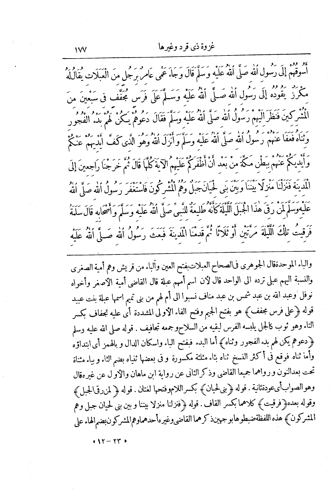 وَالْبَاءِ الْمُوَحَّدَةِ قَالَ الْجَوْهَرِيُّ فِي الصِّحَاحِ الْعَبَلَاتُ بِفَتْحِ الْعَيْنِ وَالْبَاءِ مِنْ قُرَيْشٍ وَهُمْ أُمَيَّةُ الصُّغْرَى وَالنِّسْبَةُ إِلَيْهِمْ عَبَلِيٌّ تَرُدُّهُ إِلَى الْوَاحِدِ قَالَ لِأَنَّ اسْمَ أُمِّهِمْ عَبْلَةٌ قَالَ الْقَاضِي أُمَيَّةُ الْأَصْغَرُ وَأَخَوَاهُ نَوْفَلٌ وَعَبْدُ اللَّهِ بْنُ عبد شَمْسِ بْنِ عَبْدِ مَنَافٍ نُسِبُوا إِلَى أُمٍّ لَهُمْ مِنْ بَنِي تَمِيمٍ اسْمُهَا عَبْلَةُ بِنْتُ عُبَيْدٍ قَوْلُهُ (عَلَى فَرَسٍ مُجَفَّفٍ) هُوَ بِفَتْحِ الْجِيمِ وَفَتْحِ الْفَاءِ الْأُولَى الْمُشَدَّدَةِ أَيْ عَلَيْهِ تِجْفَافٌ بِكَسْرِ التَّاءِ وَهُوَ ثَوْبٌ كَالْجُلِّ يَلْبَسُهُ الْفَرَسُ لِيَقِيَهُ مِنَ السِّلَاحِ وَجَمْعُهُ تَجَافِيفُ قَوْلُهُ صَلَّى اللَّهُ عَلَيْهِ وَسَلَّمَ (دَعُوهُمْ يَكُنْ لَهُمْ بَدْءُ الْفُجُورِ وَثِنَاهُ) أَمَّا الْبَدْءُ فَبِفَتْحِ الْبَاءِ وَإِسْكَانِ الدَّالِ وَبِالْهَمْزِ أَيِ ابْتِدَاؤُهُ وَأَمَّا ثِنَاهُ فوقع في أكثر النسخ ثناه بثاء مُثَلَّثَةٌ مَكْسُورَةٌ وَفِي بَعْضِهَا ثُنْيَاهُ بِضَمِّ الثَّاءِ وَبِيَاءٍ مُثَنَّاةٍ تَحْتُ بَعْدَ النُّونِ وَرَوَاهُمَا جَمِيعًا القاضي وذكر الثاني عن رواية بن مَاهَانَ وَالْأَوَّلُ عَنْ غَيْرِهِ قَالَ وَهُوَ الصَّوَابُ أَيْ عَوْدَةٌ ثَانِيَةٌ قَوْلُهُ (بَنِي لِحْيَانَ) بِكَسْرِ اللَّامِ وَفَتْحِهَا لُغَتَانِ قَوْلُهُ (لِمَنْ رَقِيَ الْجَبَلَ وَقَوْلُهُ بَعْدَهُ (فَرَقِيتُ) كِلَاهُمَا بِكَسْرِ الْقَافِ قَوْلُهُ (فَنَزَلْنَا مَنْزِلًا بَيْنَنَا وَبَيْنَ بَنِي لِحْيَانَ جَبَلٌ وَهُمُ الْمُشْرِكُونَ) هَذِهِ اللَّفْظَةُ ضَبَطُوهَا بِوَجْهَيْنِ ذَكَرَهُمَا الْقَاضِي وَغَيْرُهُ أَحَدُهُمَا وَهُمُ الْمُشْرِكُونَ بِضَمِّ الْهَاءِ على