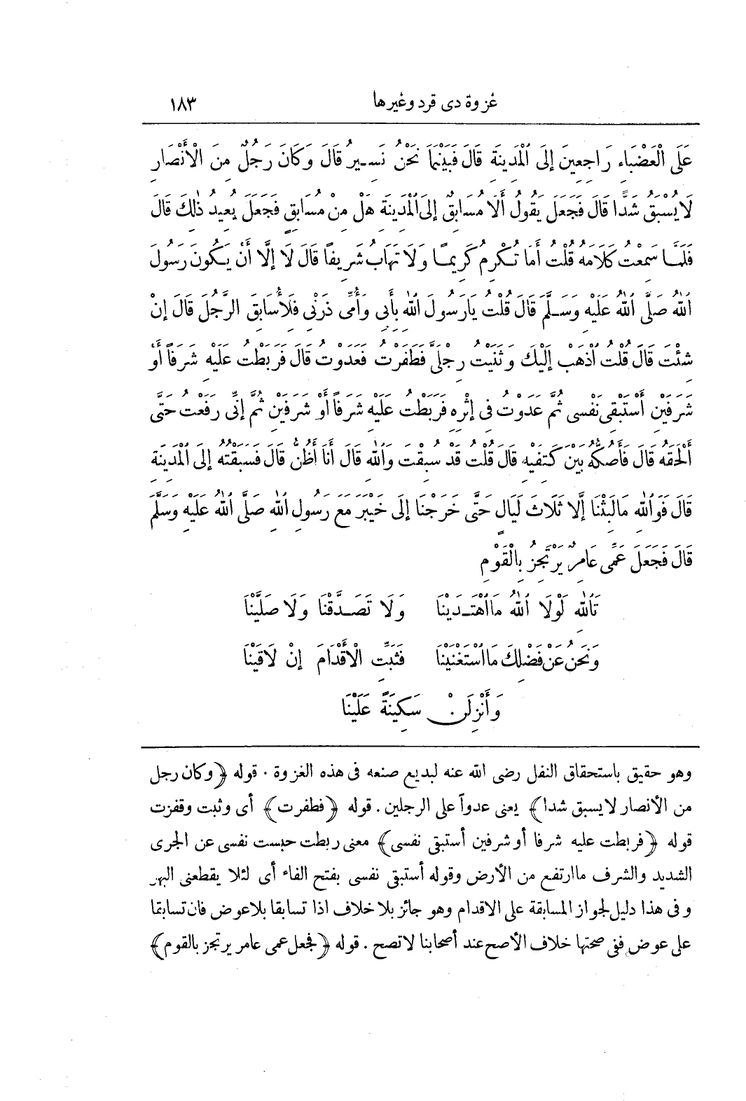وَهُوَ حَقِيقٌ بِاسْتِحْقَاقِ النَّفْلِ رَضِيَ اللَّهُ عَنْهُ لبديع صنعه في هذه الغزوة قوله (وَكَانَ رَجُلٌ مِنَ الْأَنْصَارِ لَا يُسْبَقُ شَدًّا) يَعْنِي عَدْوًا عَلَى الرِّجْلَيْنِ قَوْلُهُ (فَطَفَرْتُ) أَيْ وَثَبْتُ وَقَفَزْتُ قَوْلُهُ (فَرَبَطْتُ عَلَيْهِ شَرَفًا أَوْ شَرَفَيْنِ أَسْتَبْقِي نَفَسِي) مَعْنَى رَبَطْتُ حَبَسْتُ نَفْسِي عَنِ الْجَرْيِ الشَّدِيدِ وَالشَّرَفُ مَا ارْتَفَعَ مِنَ الْأَرْضِ وَقَوْلُهُ أَسْتَبْقِي نَفَسِي بِفَتْحِ الْفَاءِ أَيْ لِئَلَّا يَقْطَعَنِي الْبَهْرُ وَفِي هَذَا دَلِيلٌ لِجَوَازِ الْمُسَابَقَةِ عَلَى الْأَقْدَامِ وَهُوَ جَائِزٌ بِلَا خِلَافٍ إِذَا تَسَابَقَا بِلَا عِوَضٍ فَإِنْ تَسَابَقَا عَلَى عِوَضٍ فَفِي صِحَّتِهَا خِلَافٌ الْأَصَحُّ عِنْدَ أَصْحَابِنَا لَا تَصِحُّ قَوْلُهُ (فَجَعَلَ عَمِّي عَامِرٌ يَرْتَجِزُ بالقوم