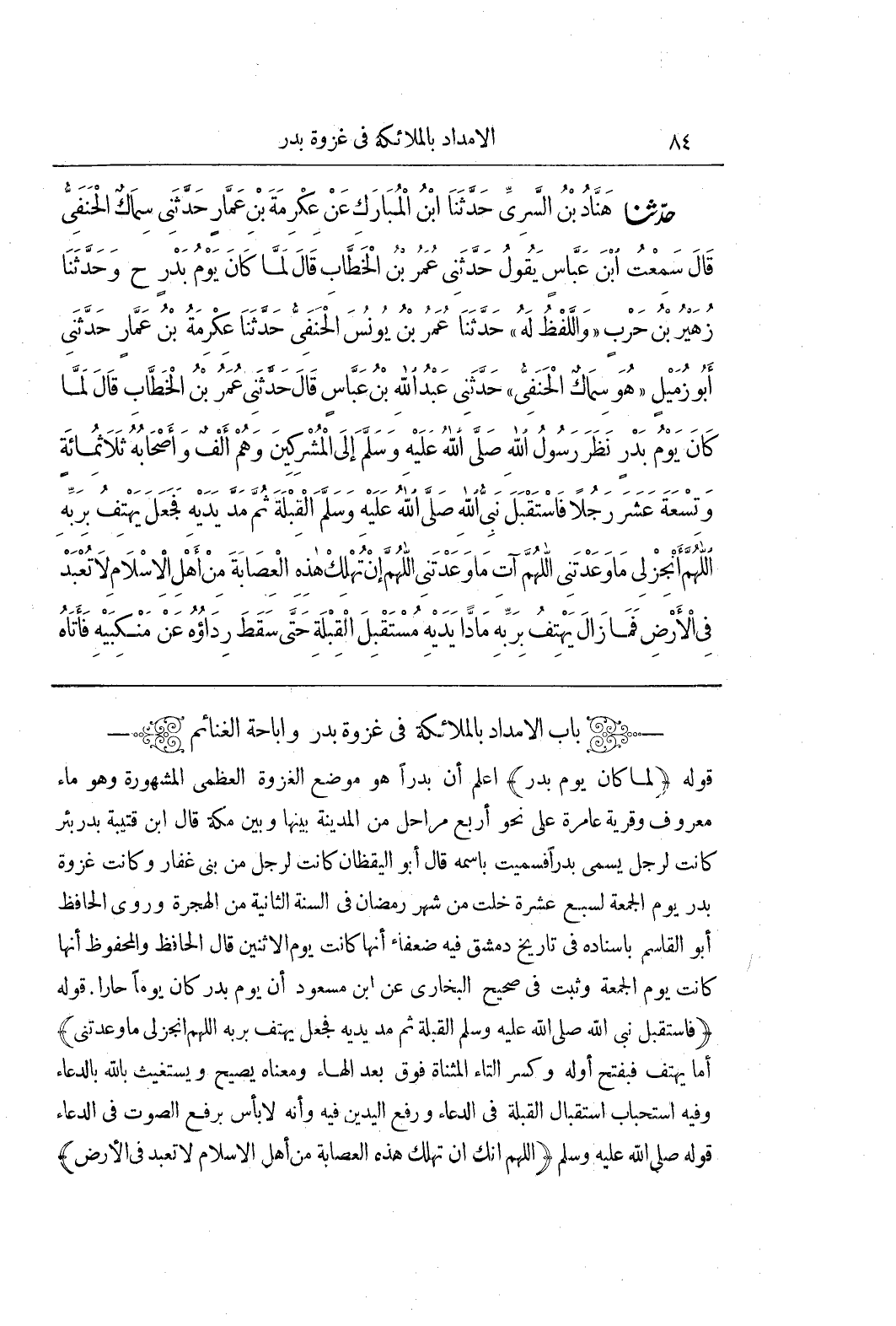 (بَاب الْإِمْدَادِ بِالْمَلَائِكَةِ فِي غَزْوَةِ بَدْرٍ وَإِبَاحَةِ الْغَنَائِمِ قَوْلُهُ