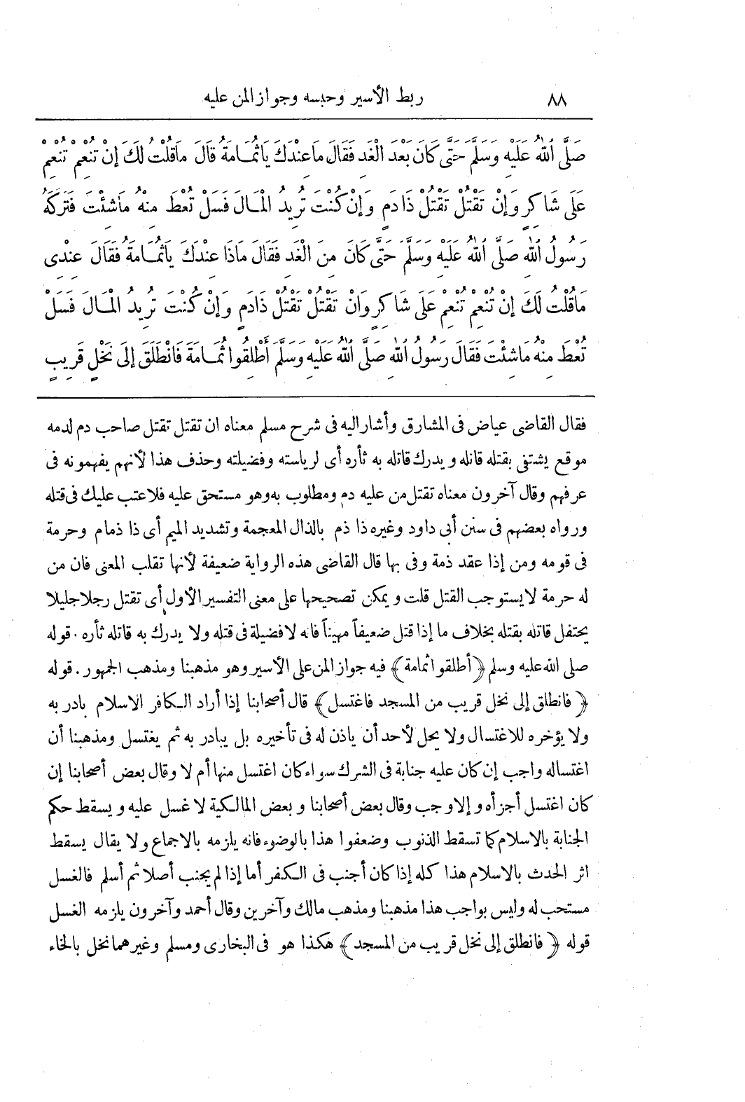 فَقَالَ الْقَاضِي عِيَاضٌ فِي الْمَشَارِقِ وَأَشَارَ إِلَيْهِ فِي شَرْحِ مُسْلِمٍ مَعْنَاهُ إِنْ تَقْتُلْ تَقْتُلْ صاحب دم لدمه موقع يشتفى بقتله قَاتِلَهُ وَيُدْرِكُ قَاتِلُهُ بِهِ ثَأْرَهُ أَيْ لِرِيَاسَتِهِ وَفَضِيلَتِهِ وَحُذِفَ هَذَا لِأَنَّهُمْ يَفْهَمُونَهُ فِي عُرْفِهِمْ وَقَالَ آخَرُونَ مَعْنَاهُ تَقْتُلُ مَنْ عَلَيْهِ دَمٌ وَمَطْلُوبٌ بِهِ وَهُوَ مُسْتَحَقٌّ عَلَيْهِ فَلَا عَتَبَ عَلَيْكَ فِي قَتْلِهِ وَرَوَاهُ بَعْضُهُمْ فِي سُنَنِ أَبِي دَاوُدَ وَغَيْرِهِ ذَا ذَمٍّ بِالذَّالِ الْمُعْجَمَةِ وَتَشْدِيدِ الْمِيمِ أَيْ ذَا ذِمَامٍ وَحُرْمَةٍ فِي قَوْمِهِ وَمَنْ إِذَا عَقَدَ ذِمَّةً وَفَّى بِهَا قَالَ الْقَاضِي هَذِهِ الرِّوَايَةُ ضَعِيفَةٌ لِأَنَّهَا تَقْلِبُ الْمَعْنَى فَإِنَّ مَنْ لَهُ حُرْمَةٌ لَا يَسْتَوْجِبُ الْقَتْلَ قُلْتُ وَيُمْكِنُ تَصْحِيحُهَا عَلَى مَعْنَى التَّفْسِيرِ الْأَوَّلِ أَيْ تَقْتُلُ رَجُلًا جَلِيلًا يَحْتَفِلُ قَاتِلُهُ بِقَتْلِهِ بِخِلَافِ مَا إِذَا قَتَلَ ضَعِيفًا مَهِينًا فَإِنَّهُ لَا فَضِيلَةَ فِي قَتْلِهِ وَلَا يُدْرِكُ بِهِ قَاتِلُهُ ثَأْرَهُ قَوْلُهُ صَلَّى اللَّهُ عَلَيْهِ وَسَلَّمَ (أَطْلِقُوا ثُمَامَةَ) فِيهِ جَوَازُ الْمَنِّ عَلَى الْأَسِيرِ وَهُوَ مَذْهَبُنَا وَمَذْهَبُ الْجُمْهُورِ قَوْلُهُ (فَانْطَلَقَ إِلَى نَخْلٍ قَرِيبٍ مِنَ الْمَسْجِدِ فَاغْتَسَلَ) قَالَ أَصْحَابُنَا إِذَا أَرَادَ الْكَافِرُ الْإِسْلَامَ بَادَرَ بِهِ وَلَا يُؤَخِّرُهُ لِلِاغْتِسَالِ وَلَا يَحِلُّ لِأَحَدٍ أَنْ يَأْذَنَ لَهُ فِي تَأْخِيرِهِ بَلْ يُبَادِرُ بِهِ ثُمَّ يَغْتَسِلُ وَمَذْهَبُنَا أَنَّ اغْتِسَالَهُ وَاجِبٌ إِنْ كَانَ عَلَيْهِ جَنَابَةٌ فِي الشِّرْكِ سَوَاءٌ كَانَ اغْتَسَلَ مِنْهَا أَمْ لَا وَقَالَ بَعْضُ أَصْحَابِنَا إِنْ كَانَ اغْتَسَلَ أَجْزَأَهُ وَإِلَّا وَجَبَ وَقَالَ بَعْضُ أَصْحَابِنَا وَبَعْضُ الْمَالِكِيَّةِ لَا غُسْلَ عَلَيْهِ ويَسْقُطُ حُكْمُ الْجَنَابَةِ بِالْإِسْلَامِ كَمَا تَسْقُطُ الذُّنُوبُ وَضَعَّفُوا هَذَا بِالْوُضُوءِ فَإِنَّهُ يَلْزَمُهُ بِالْإِجْمَاعِ وَلَا يُقَالُ يَسْقُطُ أَثَرُ الْحَدَثِ بِالْإِسْلَامِ هَذَا كُلُّهُ إِذَا كَانَ أَجْنَبَ فِي الْكُفْرِ أَمَّا إِذَا لَمْ يُجْنِبْ أَصْلًا ثُمَّ أَسْلَمَ فَالْغُسْلُ مُسْتَحَبٌّ لَهُ وَلَيْسَ بِوَاجِبٍ هَذَا مَذْهَبُنَا وَمَذْهَبُ مَالِكٍ وَآخَرِينَ وَقَالَ أَحْمَدُ وَآخَرُونَ يَلْزَمُهُ الْغُسْلُ قَوْلُهُ (فَانْطَلَقَ إِلَى نَخْلٍ قَرِيبٍ مِنَ الْمَسْجِدِ) هَكَذَا هُوَ فِي الْبُخَارِيِّ وَمُسْلِمٍ وَغَيْرِهِمَا نَخْلٌ بِالْخَاءِ
