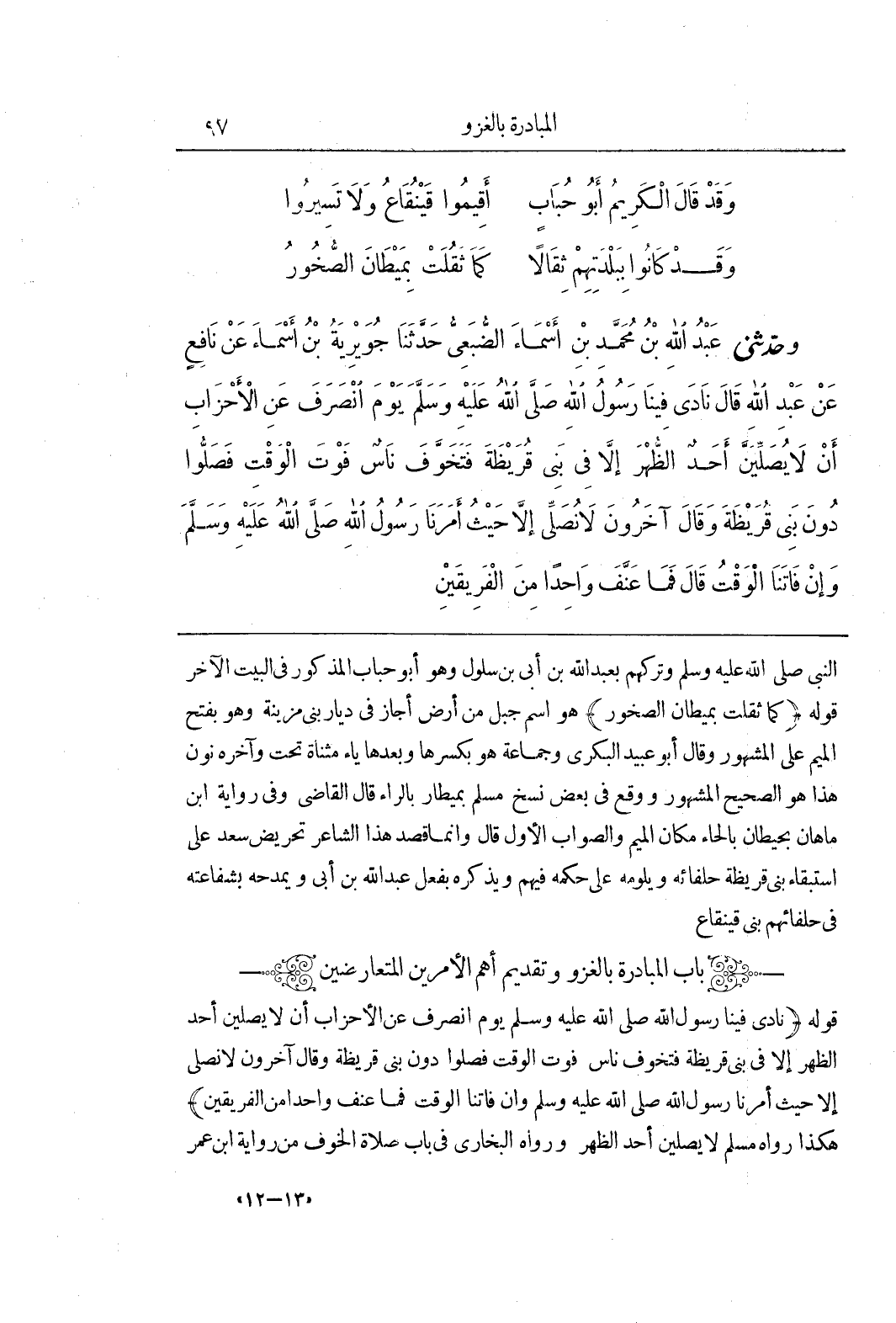[1770] (نَادَى فِينَا رَسُولُ اللَّهِ صَلَّى اللَّهُ عَلَيْهِ وَسَلَّمَ يَوْمَ انْصَرَفَ عَنِ الْأَحْزَابِ أَنْ لَا يُصَلِّيَنَّ أَحَدٌ الظُّهْرَ إِلَّا فِي بَنِي قُرَيْظَةَ فَتَخَوَّفَ نَاسٌ فَوْتَ الْوَقْتِ فَصَلَّوْا دُونَ بَنِي قُرَيْظَةَ وَقَالَ آخَرُونَ لَا نُصَلِّي إِلَّا حَيْثُ أَمَرَنَا رَسُولُ اللَّهِ صَلَّى اللَّهُ عَلَيْهِ وَسَلَّمَ وَإِنْ فَاتَنَا الْوَقْتُ فَمَا عَنَّفَ وَاحِدًا مِنَ الْفَرِيقَيْنِ) هَكَذَا رَوَاهُ مُسْلِمٌ لَا يُصَلِّيَنَّ أَحَدٌ الظُّهْرَ وَرَوَاهُ الْبُخَارِيُّ فِي بَابِ صَلَاةِ الخوف من رواية بن عمر)