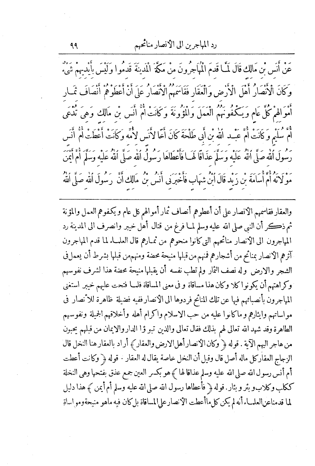 وَالْعَقَارِ فَقَاسَمَهُمُ الْأَنْصَارُ عَلَى أَنْ أَعْطَوْهُمْ أَنْصَافَ ثمار أموالهم كل عام ويكفوهم العمل والمؤنة ثُمَّ ذَكَرَ أَنَّ النَّبِيَّ صَلَّى اللَّهُ عَلَيْهِ وَسَلَّمَ لَمَّا فَرَغَ مِنْ قِتَالِ أَهْلِ خَيْبَرَ وَانْصَرَفَ إِلَى الْمَدِينَةِ رَدَّ الْمُهَاجِرُونَ إِلَى الْأَنْصَارِ مَنَائِحَهُمُ الَّتِي كَانُوا مَنَحُوهُمْ مِنْ ثِمَارِهِمْ قَالَ الْعُلَمَاءُ لَمَّا قَدِمَ الْمُهَاجِرُونَ آثَرَهُمُ الْأَنْصَارُ بِمَنَائِحَ مِنْ أَشْجَارِهِمْ فَمِنْهُمْ مَنْ قَبِلَهَا مَنِيحَةً مَحْضَةً وَمِنْهُمْ مَنْ قَبِلَهَا بِشَرْطِ أَنْ يَعْمَلَ فِي الشَّجَرِ وَالْأَرْضِ وَلَهُ نِصْفُ الثِّمَارِ وَلَمْ تَطِبْ نَفْسُهُ أَنْ يَقْبَلَهَا مَنِيحَةً مَحْضَةً هَذَا لِشَرَفِ نُفُوسِهِمْ وَكَرَاهَتِهِمْ أَنْ يَكُونُوا كَلًّا وَكَانَ هَذَا مُسَاقَاةً وَفِي مَعْنَى الْمُسَاقَاةِ فَلَمَّا فُتِحَتْ عَلَيْهِمْ خَيْبَرُ اسْتَغْنَى الْمُهَاجِرُونَ بِأَنْصِبَائِهِمْ فِيهَا عَنْ تِلْكَ الْمَنَائِحِ فَرَدُّوهَا إِلَى الْأَنْصَارِ فَفِيهِ فَضِيلَةٌ ظَاهِرَةٌ لِلْأَنْصَارِ فِي مُوَاسَاتِهِمْ وَإِيثَارِهِمْ وَمَا كَانُوا عَلَيْهِ مِنْ حُبِّ الْإِسْلَامِ وَإِكْرَامِ أَهْلِهِ وَأَخْلَاقِهِمُ الْجَمِيلَةِ وَنُفُوسِهِمُ الطَّاهِرَةِ وَقَدْ شَهِدَ اللَّهُ تَعَالَى لَهُمْ بِذَلِكَ فَقَالَ تَعَالَى وَالَّذِينَ تَبَوَّءُوا الدَّارَ وَالْإِيمَانَ من قبلهم يحبون من هاجر إليهم الْآيَةَ قَوْلُهُ (وَكَانَ الْأَنْصَارُ أَهْلَ الْأَرْضِ وَالْعَقَارِ) أَرَادَ بِالْعَقَارِ هُنَا النَّخْلَ قَالَ الزَّجَّاجُ الْعَقَارُ كل ماله أَصْلٌ قَالَ وَقِيلَ إِنَّ النَّخْلَ خَاصَّةً يُقَالُ لَهُ الْعَقَارُ قَوْلُهُ (وَكَانَتْ أَعْطَتْ أُمُّ أَنَسٍ رسول الله صلى الله عليه وسلم عذاقا لها) هو بكسر العين جمع عذق بفتحها وهي النخلة ككلب وكلاب وبئر وبئار قوله (فأعطاها رَسُولِ اللَّهِ صَلَّى اللَّهُ عَلَيْهِ وَسَلَّمَ أَمْ أَيْمَنَ) هَذَا دَلِيلٌ لِمَا قَدَّمْنَا عَنِ الْعُلَمَاءِ أَنَّهُ لَمْ يَكُنْ كُلُّ مَا أَعْطَتِ الْأَنْصَارُ عَلَى الْمُسَاقَاةِ بَلْ كَانَ فِيهِ مَا هُوَ منيحة ومواساة