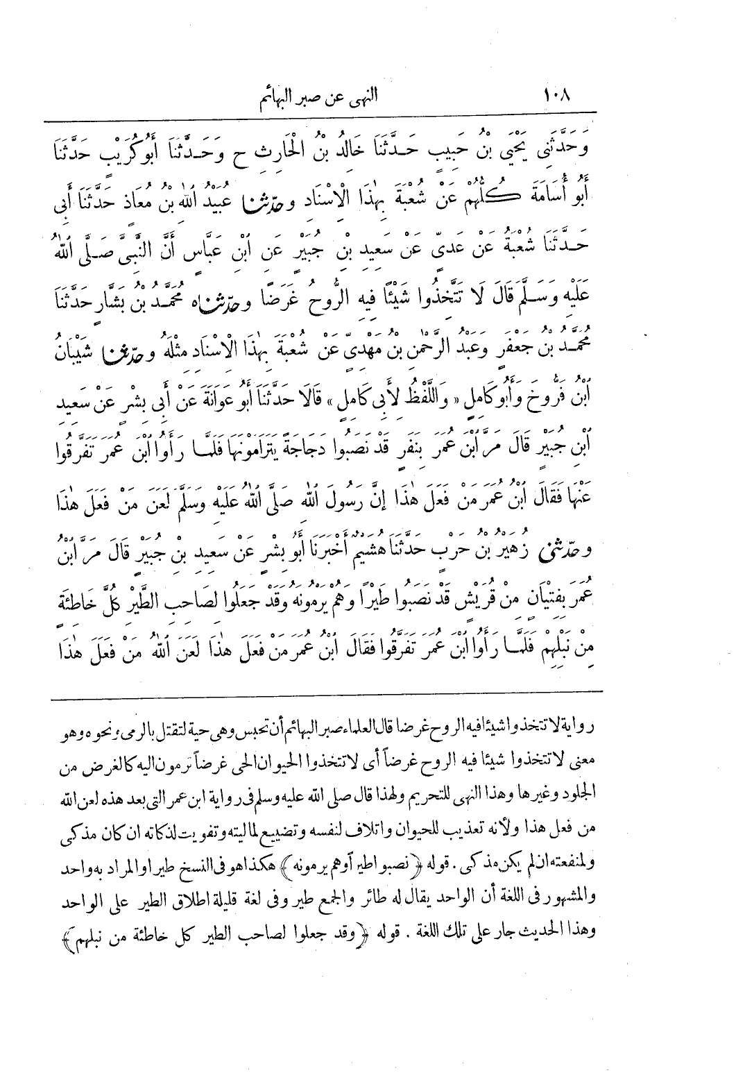 [1957] رِوَايَةٍ لَا تَتَّخِذُوا شَيْئًا فِيهِ الرُّوحُ غَرَضًا قَالَ الْعُلَمَاءُ صَبْرُ الْبَهَائِمِ أَنْ تُحْبَسَ وَهِيَ حَيَّةٌ لِتُقْتَلَ بِالرَّمْيِ وَنَحْوِهِ وَهُوَ مَعْنَى لَا تَتَّخِذُوا شَيْئًا فِيهِ الرُّوحُ غَرَضًا أَيْ لَا تَتَّخِذُوا الْحَيَوَانَ الْحَيَّ غَرَضًا تَرْمُونَ إِلَيْهِ كَالْغَرَضِ مِنَ الْجُلُودِ وَغَيْرِهَا وَهَذَا النَّهْيُ لِلتَّحْرِيمِ وَلِهَذَا قَالَ صَلَّى اللَّهُ عَلَيْهِ وَسَلَّمَ فِي