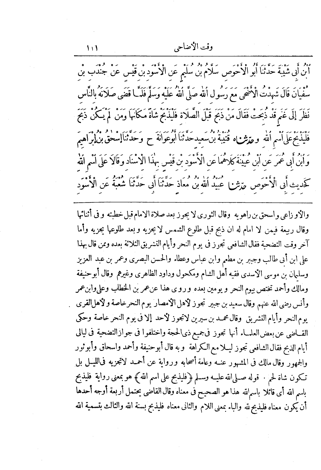 والأوزاعى واسحق بْنِ رَاهَوَيْهِ وَقَالَ الثَّوْرِيُّ لَا يَجُوزُ بَعْدَ صَلَاةِ الْإِمَامِ قَبْلَ خُطْبَتِهِ وَفِي أَثْنَائِهَا وَقَالَ رَبِيعَةُ فِيمَنْ لَا إِمَامَ لَهُ إِنْ ذَبَحَ قَبْلَ طُلُوعِ الشَّمْسِ لَا يُجْزِيهِ وَبَعْدَ طُلُوعِهَا يُجْزِيهِ وَأَمَّا آخِرُ وَقْتِ التَّضْحِيَةِ فَقَالَ الشَّافِعِيُّ تَجُوزُ فِي يَوْمِ النَّحْرِ وَأَيَّامِ التَّشْرِيقِ الثَّلَاثَةِ بَعْدَهُ وَمِمَّنْ قَالَ بِهَذَا عَلِيُّ بْنُ أَبِي طالب وجبير بن مطعم وبن عَبَّاسٍ وَعَطَاءٌ وَالْحَسَنُ الْبَصْرِيُّ وَعُمَرُ بْنُ عَبْدِ الْعَزِيزِ وَسُلَيْمَانُ بْنُ مُوسَى الْأَسَدِيُّ فَقِيهُ أَهْلِ الشَّامِ وَمَكْحُولٌ وَدَاوُدُ الظَّاهِرِيُّ وَغَيْرُهُمْ وَقَالَ أَبُو حَنِيفَةَ وَمَالِكٌ وَأَحْمَدُ تَخْتَصُّ بِيَوْمِ النَّحْرِ وَيَوْمَيْنِ بَعْدَهُ وَرُوِيَ هَذَا عَنْ عُمَرَ بْنِ الْخَطَّابِ وعلى وبن عُمَرَ وَأَنَسٍ رَضِيَ اللَّهُ عَنْهُمْ وَقَالَ سَعِيدُ بْنُ جُبَيْرٍ تَجُوزُ لِأَهْلِ الْأَمْصَارِ يَوْمَ النَّحْرِ خَاصَّةً وَلِأَهْلِ الْقُرَى يَوْمَ النَّحْرِ وَأَيَّامَ التَّشْرِيقِ وَقَالَ مُحَمَّدُ بْنُ سِيرِينَ لَا تَجُوزُ لِأَحَدٍ إِلَّا فِي يَوْمِ النَّحْرِ خَاصَّةً وَحَكَى الْقَاضِي عَنْ بَعْضِ الْعُلَمَاءِ أَنَّهَا تَجُوزُ فِي جَمِيعِ ذِي الْحِجَّةِ وَاخْتَلَفُوا فِي جَوَازِ التَّضْحِيَةِ فِي لَيَالِي أَيَّامِ الذَّبْحِ فَقَالَ الشَّافِعِيُّ تَجُوزُ لَيْلًا مَعَ الْكَرَاهَةِ وَبِهِ قَالَ أَبُو حَنِيفَةَ وَأَحْمَدُ وَإِسْحَاقُ وَأَبُو ثَوْرٍ وَالْجُمْهُورُ وَقَالَ مَالِكٌ فِي الْمَشْهُورِ عَنْهُ وَعَامَّةُ أَصْحَابِهِ وَرِوَايَةً عَنْ أَحْمَدَ لَا تُجْزِيهِ فِي اللَّيْلِ بَلْ تَكُونُ شَاةَ لَحْمٍ قَوْلُهُ صَلَّى اللَّهُ عَلَيْهِ وَسَلَّمَ (فَلْيَذْبَحْ عَلَى اسْمِ اللَّهِ) هُوَ بِمَعْنَى رِوَايَةِ فَلْيَذْبَحْ بِاسْمِ اللَّهِ أَيْ قَائِلًا بِاسْمِ اللَّهِ هَذَا هُوَ الصَّحِيحُ فِي مَعْنَاهُ وَقَالَ الْقَاضِي يَحْتَمِلُ أربعة أوجه أحدها أَنْ يَكُونَ مَعْنَاهُ فَلْيَذْبَحْ لِلَّهِ وَالْبَاءُ بِمَعْنَى اللَّامِ وَالثَّانِي مَعْنَاهُ فَلْيَذْبَحْ بِسُنَّةِ اللَّهِ وَالثَّالِثُ بتسمية الله
