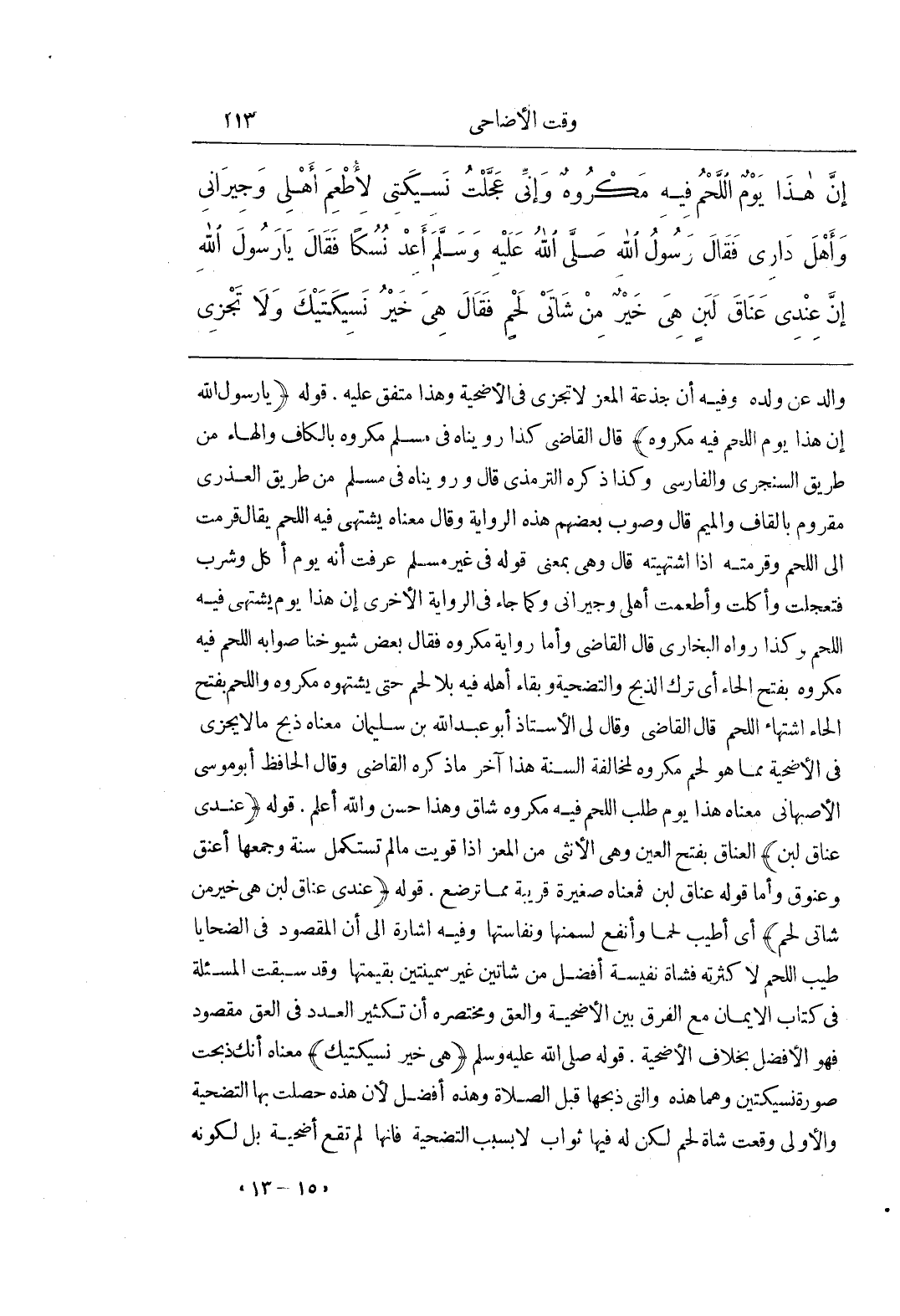 والد عن ولده وَفِيهِ أَنَّ جَذَعَةَ الْمَعْزِ لَا تَجْزِي فِي الأضحية وهذا متفق عليه قوله (يارسول اللَّهِ إِنَّ هَذَا يَوْمٌ اللَّحْمُ فِيهِ مَكْرُوهٌ) قَالَ الْقَاضِي كَذَا رَوَيْنَاهُ فِي مُسْلِمٍ مَكْرُوهٌ بِالْكَافِ وَالْهَاءِ مِنْ طَرِيقِ السِّنْجَرِيِّ وَالْفَارِسِيِّ وَكَذَا ذَكَرَهُ التِّرْمِذِيُّ قَالَ رَوَيْنَاهُ فِي مُسْلِمٍ مِنْ طَرِيقِ الْعُذْرِيِّ مَقْرُومٌ بِالْقَافِ وَالْمِيمِ قَالَ وَصَوَّبَ بَعْضُهُمْ هَذِهِ الرِّوَايَةَ وَقَالَ مَعْنَاهُ يُشْتَهَى فِيهِ اللَّحْمُ يُقَالُ قَرِمْتُ إِلَى اللَّحْمِ وَقَرِمْتُهُ إِذَا اشْتَهَيْتُهُ قَالَ وَهِيَ بِمَعْنَى قَوْلِهِ فِي غَيْرِ مُسْلِمٍ عَرَفْتُ أَنَّهُ يَوْمُ أَكْلٍ وَشُرْبٍ فَتَعَجَّلْتُ وَأَكَلْتُ وَأَطْعَمْتُ أَهْلِي وَجِيرَانِي وَكَمَا جَاءَ فِي الرِّوَايَةِ الْأُخْرَى إِنَّ هَذَا يَوْمٌ يُشْتَهَى فِيهِ اللَّحْمُ وَكَذَا رَوَاهُ الْبُخَارِيُّ قَالَ الْقَاضِي وَأَمَّا رِوَايَةُ مَكْرُوهٌ فَقَالَ بَعْضُ شُيُوخِنَا صَوَابُهُ اللَّحَمُ فِيهِ مَكْرُوهٌ بِفَتْحِ الْحَاءِ أَيْ تَرْكُ الذَّبْحِ وَالتَّضْحِيَةِ وَبَقَاءُ أَهْلِهِ فِيهِ بِلَا لَحْمٍ حَتَّى يَشْتَهُوهُ مَكْرُوهٌ وَاللَّحَمُ بِفَتْحِ الْحَاءِ اشْتِهَاءُ اللَّحْمِ قَالَ الْقَاضِي وَقَالَ لِيَ الْأُسْتَاذُ أَبُو عَبْدِ اللَّهِ بْنُ سُلَيْمَانَ مَعْنَاهُ ذَبْحُ مَا لَا يَجْزِي فِي الْأُضْحِيَّةِ مِمَّا هُوَ لَحْمٌ مَكْرُوهٌ لِمُخَالَفَةِ السُّنَّةِ هَذَا آخِرُ مَا ذَكَرَهُ الْقَاضِي وَقَالَ الْحَافِظُ أَبُو مُوسَى الْأَصْبَهَانِيُّ مَعْنَاهُ هَذَا يَوْمٌ طَلَبُ اللَّحَمِ فِيهِ مَكْرُوهٌ شَاقٌّ وَهَذَا حَسَنٌ وَاللَّهُ أَعْلَمُ قَوْلُهُ (عِنْدِي عَنَاقَ لَبَنٍ) الْعَنَاقُ بِفَتْحِ الْعَيْنِ وَهِيَ الْأُنْثَى مِنَ الْمَعْزِ إِذَا قَوِيَتْ مَا لَمْ تَسْتَكْمِلْ سَنَةً وَجَمْعُهَا أَعْنُقٌ وَعُنُوقٌ وَأَمَّا قَوْلُهُ عَنَاقَ لَبَنٍ فَمَعْنَاهُ صَغِيرَةٌ قَرِيبَةٌ مِمَّا تَرْضَعُ قَوْلُهُ (عِنْدِي عَنَاقَ لَبَنٍ هِيَ خَيْرٌ مِنْ شَاتَيْ لَحْمٍ) أَيْ أَطْيَبُ لَحْمًا وَأَنْفَعُ لِسِمَنِهَا وَنَفَاسَتِهَا وَفِيهِ إِشَارَةٌ إِلَى أَنَّ الْمَقْصُودَ فِي الضَّحَايَا طِيبُ اللَّحْمِ لَا كَثْرَتُهُ فَشَاةٌ نَفِيسَةٌ أَفْضَلُ مِنْ شَاتَيْنِ غَيْرِ سَمِينَتَيْنِ بِقِيمَتِهَا وَقَدْ سَبَقَتِ الْمَسْأَلَةُ فِي كِتَابِ الْإِيمَانِ مَعَ الْفَرْقِ بَيْنَ الْأُضْحِيَّةِ وَالْعَقِّ وَمُخْتَصَرُهُ أَنَّ تَكْثِيرَ الْعَدَدِ فِي الْعَقِّ مَقْصُودٌ فَهُوَ الْأَفْضَلُ بِخِلَافِ الْأُضْحِيَّةِ قَوْلُهُ صَلَّى اللَّهُ عَلَيْهِ وَسَلَّمَ (هِيَ خَيْرُ نَسِيكَتَيْكَ) مَعْنَاهُ أَنَّكَ ذَبَحْتَ صُورَةً نَسِيكَتَيْنِ وَهُمَا هَذِهِ وَالَّتِي ذَبَحَهَا قَبْلَ الصَّلَاةِ وَهَذِهِ أَفْضَلُ لِأَنَّ هَذِهِ حَصَلَتْ بِهَا التَّضْحِيَةُ وَالْأُولَى وَقَعَتْ شَاةَ لَحْمٍ لَكِنْ لَهُ فِيهَا ثَوَابٌ لَا بِسَبَبِ التَّضْحِيَةِ فَإِنَّهَا لَمْ تَقَعْ أُضْحِيَّةً بَلْ لِكَوْنِهِ