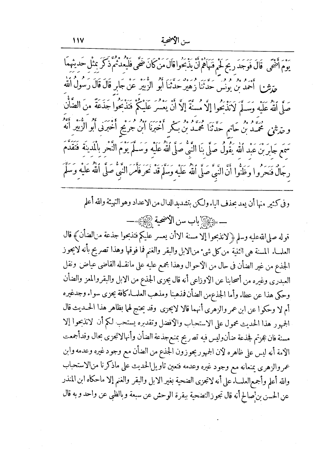 [1963] قَوْلُهُ صَلَّى الله عليه وسلم (لا تذبحوا إلامسنة إِلَّا أَنْ يَعْسُرَ عَلَيْكُمْ فَتَذْبَحُوا جَذَعَةً مِنَ الضَّأْنِ) قَالَ الْعُلَمَاءُ الْمُسِنَّةُ هِيَ الثَّنِيَّةُ مِنْ كل شئ مِنَ الْإِبِلِ وَالْبَقَرِ وَالْغَنَمِ فَمَا فَوْقَهَا وَهَذَا تَصْرِيحٌ بِأَنَّهُ لَا يَجُوزُ الْجَذَعُ مِنْ غَيْرِ الضَّأْنِ فِي حَالٍ مِنَ الْأَحْوَالِ وَهَذَا مُجْمَعٌ عَلَيْهِ عَلَى مَا نَقَلَهُ الْقَاضِي عِيَاضٌ وَنَقَلَ الْعَبْدَرِيُّ وَغَيْرُهُ مِنْ أَصْحَابِنَا عَنِ الْأَوْزَاعِيِّ أَنَّهُ قَالَ يُجْزِي الْجَذَعُ مِنَ الْإِبِلِ وَالْبَقَرِ وَالْمَعْزِ وَالضَّأْنِ وَحُكِيَ هَذَا عَنْ عَطَاءٍ وَأَمَّا الْجَذَعُ مِنَ الضَّأْنِ فَمَذْهَبُنَا وَمَذْهَبُ الْعُلَمَاءِ كَافَّةً يُجْزِي سواء وجد غيره أم لاوحكوا عن بن عمر والزهرى أنهما قالا لايجزى وَقَدْ يُحْتَجُّ لَهُمَا بِظَاهِرِ هَذَا الْحَدِيثِ قَالَ الْجُمْهُورُ هَذَا الْحَدِيثُ مَحْمُولٌ عَلَى الِاسْتِحْبَابِ وَالْأَفْضَلِ وتقديره يستحب لكم أن لاتذبحوا إِلَّا مُسِنَّةً فَإِنْ عَجَزْتُمْ فَجَذَعَةَ ضَأْنٍ وَلَيْسَ فِيهِ تَصْرِيحٌ بِمَنْعِ جَذَعَةِ الضَّأْنِ وَأَنَّهَا لَا تُجْزِي بِحَالٍ وَقَدْ أَجْمَعَتِ الْأُمَّةُ أَنَّهُ لَيْسَ عَلَى ظَاهِرِهِ لِأَنَّ الْجُمْهُورَ يُجَوِّزُونَ الْجَذَعَ مِنَ الضأن مع وجود غيره وعدمه وبن عُمَرَ وَالزُّهْرِيُّ يَمْنَعَانِهِ مَعَ وُجُودِ غَيْرِهِ وَعَدَمِهِ فَتَعَيَّنَ تَأْوِيلُ الْحَدِيثِ عَلَى مَا ذَكَرْنَا مِنَ الِاسْتِحْبَابِ وَاللَّهُ أَعْلَمُ وَأَجْمَعَ الْعُلَمَاءُ عَلَى أَنَّهُ لَا تُجْزِي الضَّحِيَّةُ بِغَيْرِ الْإِبِلِ وَالْبَقَرِ وَالْغَنَمِ إلا ما حكاه بن الْمُنْذِرِ عَنِ الْحَسَنِ بْنِ صَالِحٍ أَنَّهُ قَالَ تَجُوزُ التَّضْحِيَةُ بِبَقَرَةِ الْوَحْشِ عَنْ سَبْعَةٍ وَبِالظَّبْيِ عَنْ وَاحِدٍ وَبِهِ قَالَ