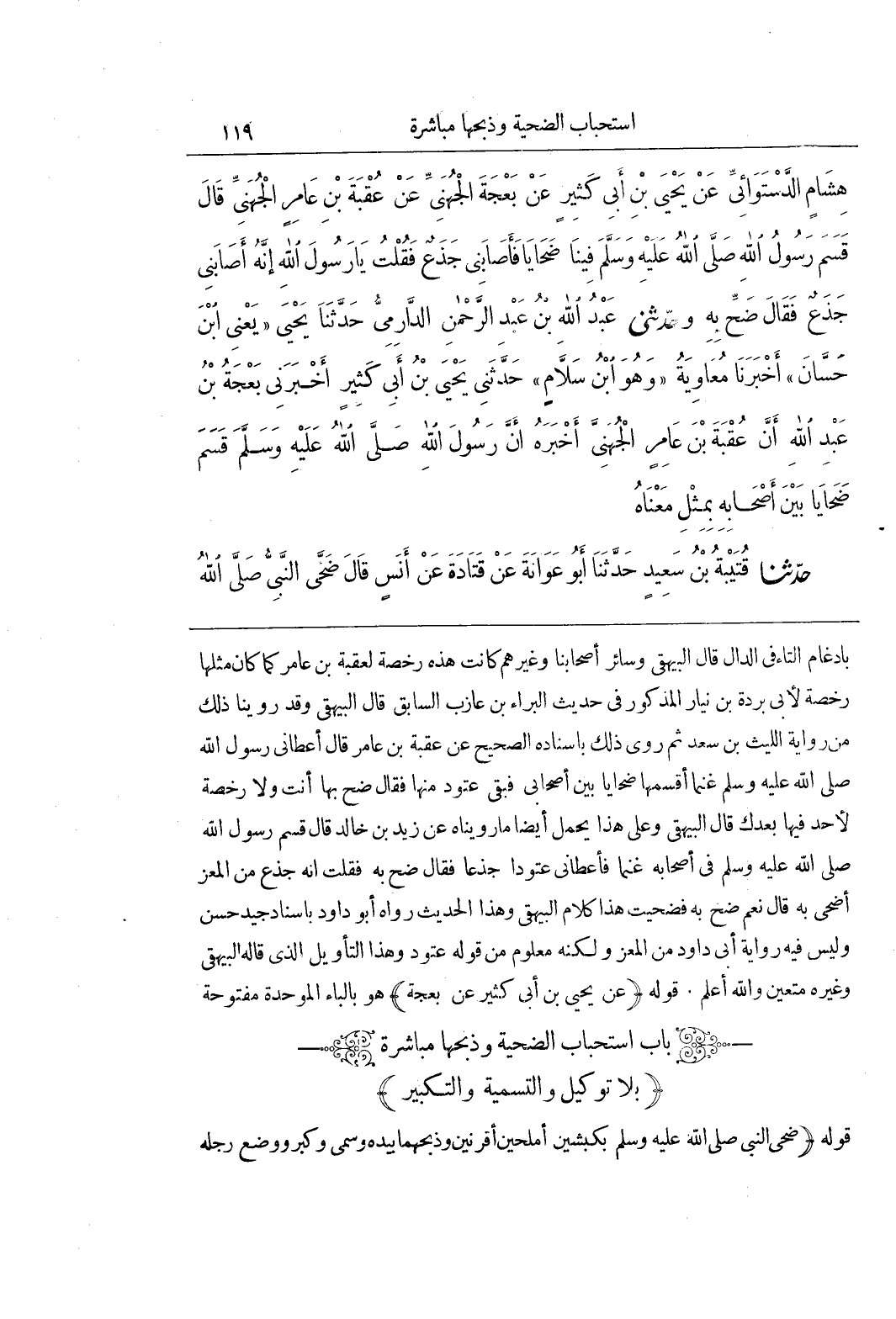 (باب استحباب الضحية وذبحها مباشرة بلا توكيل والتسمية والتكبير)