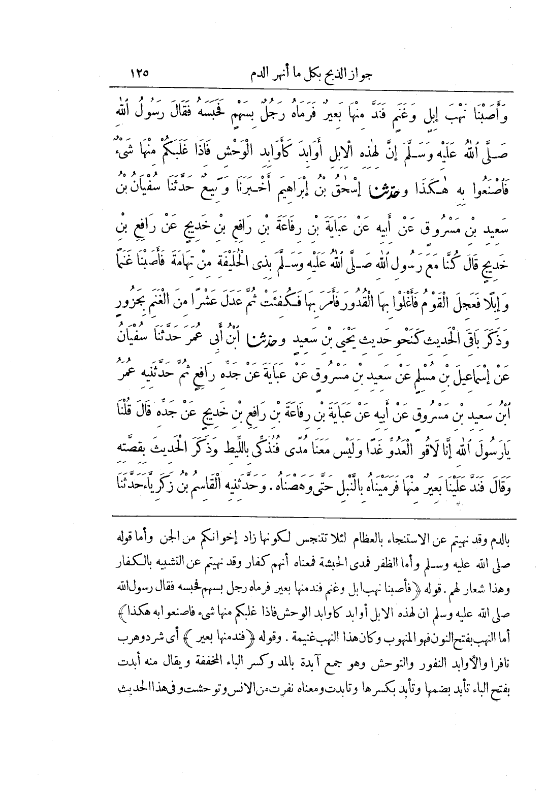 بِالدَّمِ وَقَدْ نُهِيتُمْ عَنِ الِاسْتِنْجَاءِ بِالْعِظَامِ لِئَلَّا تَنْجُسَ لِكَوْنِهَا زَادَ إِخْوَانِكُمْ مِنَ الْجِنِّ وَأَمَّا قَوْلُهُ صَلَّى اللَّهُ عَلَيْهِ وَسَلَّمَ وَأَمَّا الظُّفُرُ فَمُدَى الْحَبَشَةِ فَمَعْنَاهُ أَنَّهُمْ كُفَّارٌ وَقَدْ نُهِيتُمْ عن التشبيه بِالْكُفَّارِ وَهَذَا شِعَارٌ لَهُمْ قَوْلُهُ (فَأَصَبْنَا نَهْبَ ابل وغنم فندمنها بعير فرماهرجل بِسَهْمٍ فَحَبَسَهُ فَقَالَ رَسُولُ اللَّهِ صَلَّى اللَّهُ عَلَيْهِ وَسَلَّمَ إِنَّ لِهَذِهِ الْإِبِلِ أَوَابِدَ كَأَوَابِدِ الْوَحْشِ فَإِذَا غَلَبَكُمْ مِنْهَا شَيْءٌ فَاصْنَعُوا بِهِ هَكَذَا) أَمَّا النَّهْبُ بِفَتْحِ النُّونِ فَهُوَ الْمَنْهُوبُ وكان هذا النهب غنيمة وقوله (فندمنها بَعِيرٌ) أَيْ شَرَدَ وَهَرَبَ نَافِرًا وَالْأَوَابِدُ النُّفُورُ وَالتَّوَحُّشُ وَهُوَ جَمْعُ آبِدَةٍ بِالْمَدِّ وَكَسْرِ الْبَاءِ الْمُخَفَّفَةِ وَيُقَالُ مِنْهُ أَبَدَتْ بِفَتْحِ الْبَاءِ تَأْبُدُ بِضَمِّهَا وَتَأْبِدُ بِكَسْرِهَا وَتَأَبَّدَتْ وَمَعْنَاهُ نَفَرَتْ مِنَ الْإِنْسِ وَتَوَحَّشَتْ وَفِي هَذَا الْحَدِيثِ