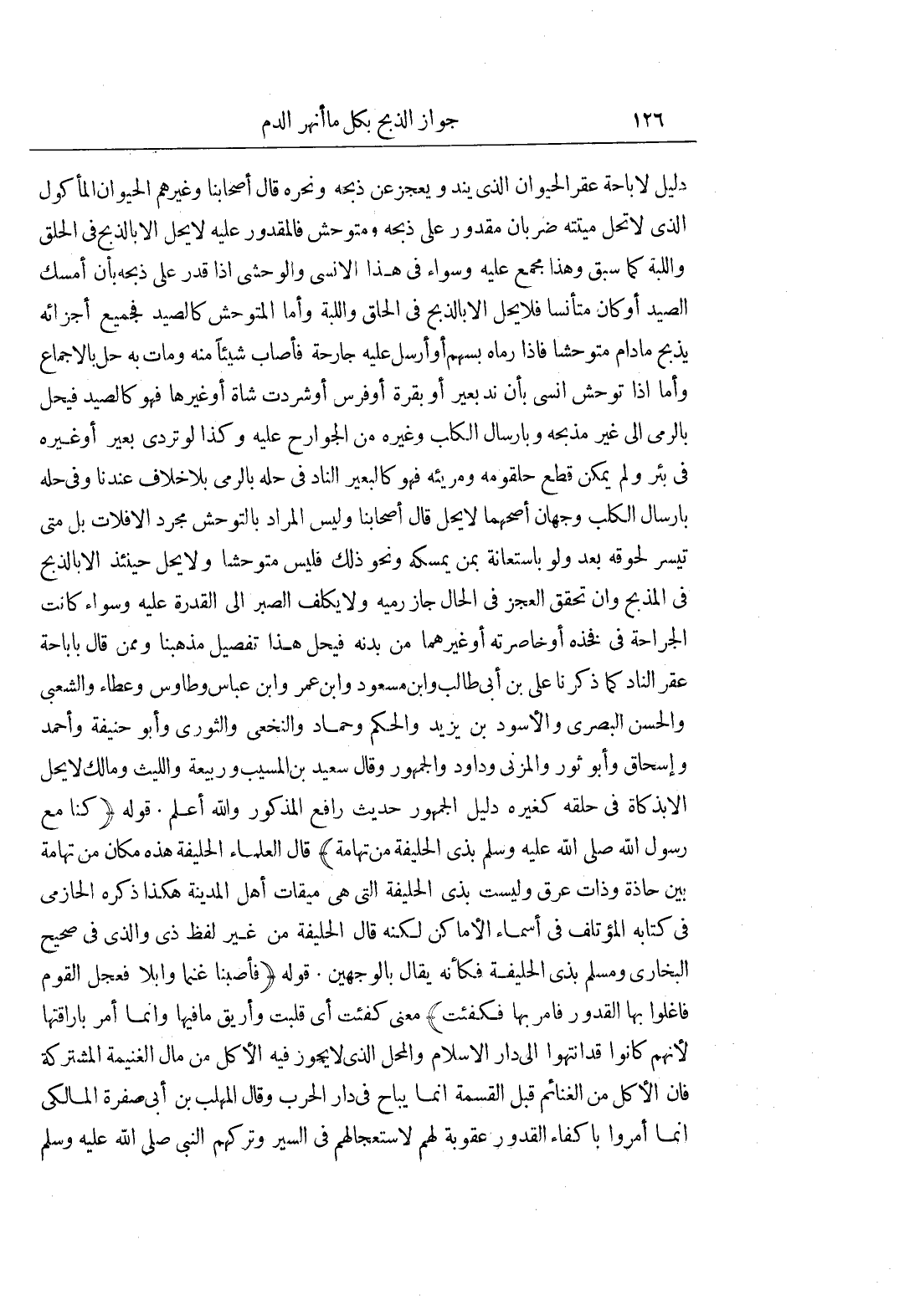 دَلِيلٌ لِإِبَاحَةِ عَقْرِ الْحَيَوَانِ الَّذِي يَنِدُّ وَيُعْجَزُ عن ذبحه ونحره قال أصحابنا وغيرهم الحيوانالمأكول الذى لاتحل مَيْتَتُهُ ضَرْبَانِ مَقْدُورٌ عَلَى ذَبْحِهِ وَمُتَوَحِّشٌ فَالْمَقْدُورُ عَلَيْهِ لَا يَحِلُّ إِلَّا بِالذَّبْحِ فِي الْحَلْقِ وَاللَّبَةِ كَمَا سَبَقَ وَهَذَا مُجْمَعٌ عَلَيْهِ وَسَوَاءٌ فِي هَذَا الْإِنْسِيِّ وَالْوَحْشِيِّ إِذَا قَدَرَ عَلَى ذَبْحِهِ بِأَنْ أَمْسَكَ الصَّيْدَ أَوْ كَانَ مُتَأَنِّسًا فَلَا يَحِلُّ إِلَّا بِالذَّبْحِ فِي الْحَلْقِ وَاللَّبَةِ وأما المتوحش كالصيد فجميع أجزائه يذبح مادام مُتَوَحِّشًا فَإِذَا رَمَاهُ بِسَهْمٍ أَوْ أَرْسَلَ عَلَيْهِ جَارِحَةً فَأَصَابَ شَيْئًا مِنْهُ وَمَاتَ بِهِ حَلَّ بِالْإِجْمَاعِ وَأَمَّا إِذَا تَوَحَّشَ إِنْسِيٌّ بِأَنَ نَدَّ بعير أو بقرة أو فرس أوشردت شَاةٌ أَوْ غَيْرُهَا فَهُوَ كَالصَّيْدِ فَيَحِلُّ بِالرَّمْيِ إِلَى غَيْرِ مَذْبَحِهِ وَبِإِرْسَالِ الْكَلْبِ وَغَيْرِهِ مِنَ الجوارح عليه وكذا لوتردى بعير أوغيره فِي بِئْرٍ وَلَمْ يُمْكِنْ قَطْعُ حُلْقُومِهِ وَمَرِيئِهِ فهو كالبعير الناد فى حله بالرمى بلاخلاف عِنْدَنَا وَفِي حِلِّهِ بِإِرْسَالِ الْكَلْبِ وَجْهَانِ أَصَحُّهُمَا لايحل قَالَ أَصْحَابُنَا وَلَيْسَ الْمُرَادُ بِالتَّوَحُّشِ مُجَرَّدَ الْإِفْلَاتِ بل متى تيسر لحوقه بعد ولوباستعانة بمن يمسكه ونحوذلك فليس متوحشا ولايحل حينئذ الابالذبح فِي الْمَذْبَحِ وَإِنْ تَحَقَّقَ الْعَجْزُ فِي الْحَالِ جاز رميه ولايكلف الصَّبْرَ إِلَى الْقُدْرَةِ عَلَيْهِ وَسَوَاءٌ كَانَتِ الْجِرَاحَةُ فِي فَخِذِهِ أَوْ خَاصِرَتِهِ أَوْ غَيْرِهِمَا مِنْ بَدَنِهِ فَيَحِلُّ هَذَا تَفْصِيلُ مَذْهَبِنَا وَمِمَّنْ قَالَ بِإِبَاحَةِ عَقْرِ النَّادِّ كَمَا ذَكَرْنَا عَلِيُّ بْنُ أبى طالب وبن مسعود وبن عمر وبن عَبَّاسٍ وَطَاوُسٌ وَعَطَاءٌ وَالشَّعْبِيُّ وَالْحَسَنُ الْبَصْرِيُّ وَالْأَسْوَدُ بْنُ يَزِيدَ وَالْحَكَمُ وَحَمَّادٌ وَالنَّخَعِيُّ وَالثَّوْرِيُّ وَأَبُو حنيفة وأحمد وإسحاقوأبو ثور والمزنى وداود والجمهوروقال سَعِيدُ بْنُ الْمُسَيِّبِ وَرَبِيعَةُ وَاللَّيْثُ وَمَالِكٌ لَا يَحِلُّ إِلَّا بِذَكَاةٍ فِي حَلْقِهِ كَغَيْرِهِ دَلِيلُ الْجُمْهُورِ حَدِيثُ رَافِعٍ الْمَذْكُورُ وَاللَّهُ أَعْلَمُ قَوْلُهُ (كُنَّا مَعَ رَسُولِ اللَّهِ صَلَّى اللَّهُ عَلَيْهِ وَسَلَّمَ بِذِي الْحُلَيْفَةِ مِنْ تِهَامَةَ) قَالَ الْعُلَمَاءُ الْحُلَيْفَةُ هَذِهِ مَكَانٌ مِنْ تِهَامَةَ بَيْنَ حَاذَّةَ وَذَاتِ عِرْقٍ وَلَيْسَتْ بِذِي الْحُلَيْفَةِ الَّتِي هِيَ مِيقَاتُ أَهْلِ الْمَدِينَةِ هَكَذَا ذَكَرَهُ الْحَازِمِيُّ فِي كِتَابِهِ الْمُؤْتَلِفُ فِي أَسْمَاءِ الْأَمَاكِنِ لَكِنَّهُ قَالَ الْحُلَيْفَةُ مِنْ غَيْرِ لَفْظِ ذِي وَالَّذِي فِي صَحِيحِ الْبُخَارِيِّ وَمُسْلِمٍ بِذِي الْحُلَيْفَةِ فَكَأَنَّهُ يُقَالُ بِالْوَجْهَيْنِ قَوْلُهُ (فَأَصَبْنَا غَنَمًا وَإِبِلًا فَعَجِلَ الْقَوْمُ فَأَغْلَوْا بِهَا الْقُدُورَ فَأَمَرَ بِهَا فَكُفِئَتْ) مَعْنَى كُفِئَتْ أَيْ قُلِبَتْ وَأُرِيقَ مَا فِيهَا وَإِنَّمَا أَمَرَ بِإِرَاقَتِهَا لِأَنَّهُمْ كَانُوا قَدِ انْتَهَوْا إِلَى دار الاسلام والمحل الذى لايجوز فِيهِ الْأَكْلُ مِنْ مَالِ الْغَنِيمَةِ الْمُشْتَرَكَةِ فَإِنَّ الْأَكْلَ مِنَ الْغَنَائِمِ قَبْلَ الْقِسْمَةِ إِنَّمَا يُبَاحُ فِي دَارِ الْحَرْبِ وَقَالَ الْمُهَلَّبُ بْنُ أَبِي صُفْرَةَ الْمَالِكِيُّ إِنَّمَا أُمِرُوا بِإِكْفَاءِ الْقُدُورِ عُقُوبَةً لَهُمْ لِاسْتِعْجَالِهِمْ فِي السَّيْرِ وَتَرْكِهِمُ النَّبِيَّ صَلَّى اللَّهُ عَلَيْهِ وَسَلَّمَ