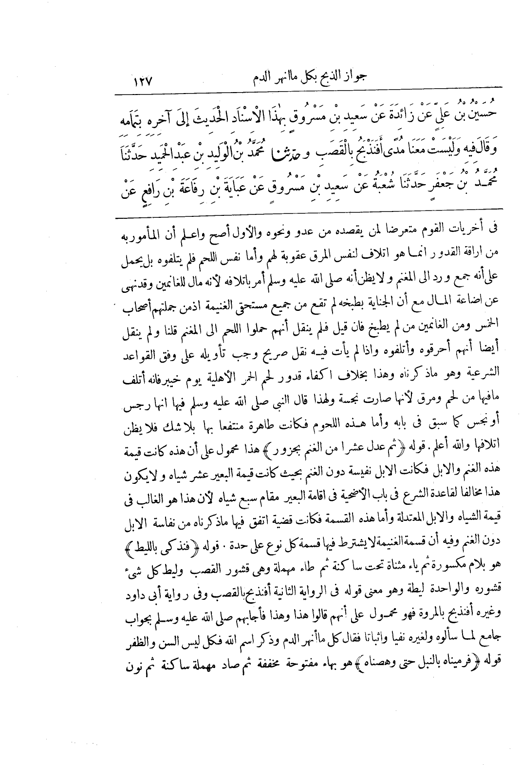 فِي أُخْرَيَاتِ الْقَوْمِ مُتَعَرِّضًا لِمَنْ يَقْصِدُهُ مِنْ عَدُوٍّ وَنَحْوِهِ وَالْأَوَّلُ أَصَحُّ وَاعْلَمْ أَنَّ الْمَأْمُورَ بِهِ مِنْ إِرَاقَةِ الْقُدُورِ إِنَّمَا هُوَ إِتْلَافٌ لِنَفْسِ الْمَرَقِ عُقُوبَةً لَهُمْ وَأَمَّا نَفْسُ اللَّحْمِ فَلَمْ يُتْلِفُوهُ بَلْ يُحْمَلُ عَلَى أَنَّهُ جُمِعَ ورد إلى المغنم ولايظن أَنَّهُ صَلَّى اللَّهُ عَلَيْهِ وَسَلَّمَ أَمَرَ بِإِتْلَافِهِ لِأَنَّهُ مَالٌ لِلْغَانِمِينَ وَقَدْ نَهَى عَنْ إِضَاعَةِ الْمَالِ مَعَ أَنَّ الْجِنَايَةَ بِطَبْخِهِ لَمْ تَقَعْ من جميع مستحقى الغنيمة اذمن جُمْلَتِهِمْ أَصْحَابُ الْخُمُسِ وَمِنَ الْغَانِمِينَ مَنْ لَمْ يَطْبُخْ فَإِنْ قِيلَ فَلَمْ يُنْقَلْ أَنَّهُمْ حَمَلُوا اللَّحْمَ إِلَى الْمَغْنَمِ قُلْنَا وَلَمْ يُنْقَلْ أَيْضًا أَنَّهُمْ أَحْرَقُوهُ وَأَتْلَفُوهُ وَإِذَا لَمْ يَأْتِ فِيهِ نَقْلٌ صَرِيحٌ وَجَبَ تَأْوِيلُهُ عَلَى وَفْقِ الْقَوَاعِدِ الشَّرْعِيَّةِ وَهُوَ مَا ذَكَرْنَاهُ وَهَذَا بِخِلَافِ إِكْفَاءِ قُدُورِ لَحْمِ الْحُمُرِ الْأَهْلِيَّةِ يَوْمَ خَيْبَرَ فَإِنَّهُ أَتْلَفَ مَا فِيهَا مِنْ لَحْمٍ وَمَرَقٍ لِأَنَّهَا صَارَتْ نَجِسَةً وَلِهَذَا قَالَ النَّبِيُّ صَلَّى اللَّهُ عَلَيْهِ وَسَلَّمَ فِيهَا إِنَّهَا رِجْسٌ أَوْ نَجَسٌ كَمَا سَبَقَ فِي بَابِهِ وَأَمَّا هَذِهِ اللُّحُومُ فكانت طاهرة منتفعا بها بلاشك فلايظن إِتْلَافُهَا وَاللَّهُ أَعْلَمُ قَوْلُهُ (ثُمَّ عَدَلَ عَشْرًا مِنَ الْغَنَمِ بِجَزُورٍ) هَذَا مَحْمُولٌ عَلَى أَنَّ هَذِهِ كَانَتْ قِيمَةَ هَذِهِ الْغَنَمِ وَالْإِبِلِ فَكَانَتِ الْإِبِلُ نَفِيسَةً دُونَ الْغَنَمِ بِحَيْثُ كَانَتْ قِيمَةُ البعير عشر شياه ولايكون هذا مخالفالقاعدة الشَّرْعِ فِي بَابِ الْأُضْحِيَّةِ فِي إِقَامَةِ الْبَعِيرِ مَقَامَ سَبْعِ شِيَاهٍ لِأَنَّ هَذَا هُوَ الْغَالِبُ فِي قِيمَةِ الشِّيَاهِ وَالْإِبِلِ الْمُعْتَدِلَةِ وَأَمَّا هَذِهِ القسمة فكانت قضية اتفق فيها ماذكرناه مِنْ نَفَاسَةِ الْإِبِلِ دُونَ الْغَنَمِ وَفِيهِ أَنَّ قسمة الغنيمة لايشترط فِيهَا قِسْمَةُ كُلِّ نَوْعٍ عَلَى حِدَةٍ قَوْلُهُ (فَنُذَكِّي بِاللِّيطِ) هُوَ بِلَامٍ مَكْسُورَةٍ ثُمَّ يَاءٍ مُثَنَّاةٍ تَحْتُ سَاكِنَةٍ ثُمَّ طَاءٍ مُهْمَلَةٍ وَهِيَ قُشُورُ الْقَصَبِ وَلِيطُ كُلِّ شَيْءٍ قُشُورُهُ وَالْوَاحِدَةُ لِيطَةٌ وَهُوَ مَعْنَى قَوْلِهِ فِي الرِّوَايَةِ الثَّانِيَةِ أَفَنَذْبَحُ بِالْقَصَبِ وَفِي رِوَايَةِ أَبِي دَاوُدَ وَغَيْرِهِ أَفَنَذْبَحُ بِالْمَرْوَةِ فَهُوَ مَحْمُولٌ عَلَى أَنَّهُمْ قَالُوا هَذَا وَهَذَا فَأَجَابَهُمْ صَلَّى اللَّهُ عَلَيْهِ وَسَلَّمَ بِجَوَابٍ جَامِعٍ لِمَا سَأَلُوهُ وَلِغَيْرِهِ نَفْيًا وَإِثْبَاتًا فقال كل ماأنهر الدَّمَ وَذُكِرَ اسْمُ اللَّهِ فَكُلْ لَيْسَ السِّنَّ وَالظُّفُرَ قَوْلُهُ (فَرَمَيْنَاهُ بِالنَّبْلِ حَتَّى وَهَصْنَاهُ) هُوَ بِهَاءٍ مَفْتُوحَةٍ مُخَفَّفَةٍ ثُمَّ صَادٍ مُهْمَلَةٍ سَاكِنَةٍ ثم نون