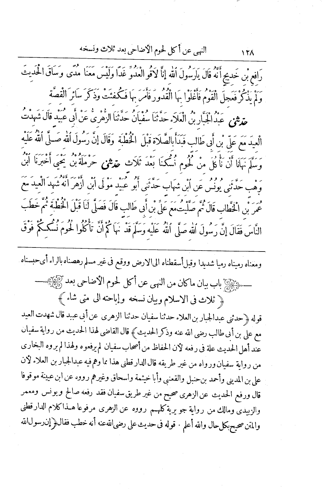 [1969] قَوْلُهُ (حَدَّثَنِي عَبْدُ الْجَبَّارِ بْنُ الْعَلَاءِ حَدَّثَنَا سُفْيَانُ حَدَّثَنَا الزُّهْرِيُّ عَنْ أَبِي عُبَيْدٍ قَالَ شَهِدْتُ الْعِيدَ مَعَ عَلِيِّ بْنِ أَبِي طَالِبٍ رَضِيَ اللَّهُ عَنْهُ وَذَكَرَ الْحَدِيثَ) قَالَ الْقَاضِي لِهَذَا الْحَدِيثِ مِنْ رِوَايَةِ سُفْيَانَ عِنْدَ أَهْلِ الْحَدِيثِ عِلَّةٌ فِي رَفْعِهِ لِأَنَّ الْحُفَّاظَ مِنْ أَصْحَابِ سُفْيَانَ لَمْ يَرْفَعُوهُ وَلِهَذَا لَمْ يَرْوِهِ الْبُخَارِيُّ مِنْ رِوَايَةِ سُفْيَانَ وَرَوَاهُ مِنْ غَيْرِ طَرِيقِهِ قَالَ الدَّارَقُطْنِيُّ هَذَا مِمَّا وَهِمَ فِيهِ عَبْدُ الْجَبَّارِ بْنُ الْعَلَاءِ لِأَنَّ عَلِيَّ بْنَ الْمَدِينِيِّ وَأَحْمَدَ بْنَ حَنْبَلٍ وَالْقَعْنَبِيَّ وَأَبَا خَيْثَمَةَ واسحاق وغيرهم رووه عن بن عُيَيْنَةَ مَوْقُوفًا قَالَ وَرَفْعُ الْحَدِيثِ عَنِ الزُّهْرِيِّ صَحِيحٌ مِنْ غَيْرِ طَرِيقِ سُفْيَانَ فَقَدْ رَفَعَهُ صَالِحٌ وَيُونُسُ وَمَعْمَرٌ وَالزُّبَيْدِيُّ وَمَالِكٌ مِنْ رِوَايَةِ جُوَيْرِيَةَ كُلُّهُمْ رَوَوْهُ عَنِ الزُّهْرِيِّ مَرْفُوعًا هَذَا كَلَامُ الدَّارَقُطْنِيِّ وَالْمَتْنُ صَحِيحٌ بِكُلِّ حَالٍ وَاللَّهُ أَعْلَمُ قَوْلُهُ فِي حَدِيثِ عَلِيٍّ رَضِيَ اللَّهُ عَنْهُ أَنَّهُ خَطَبَ فَقَالَ (إِنَّ رَسُولَ اللَّهِ
