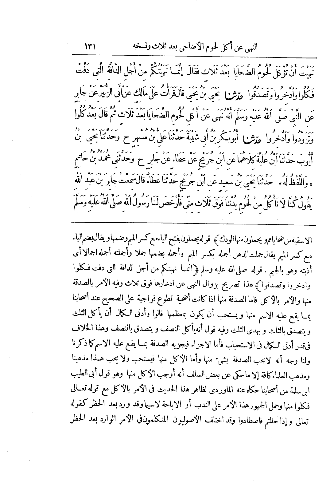 الْأَسْقِيَةَ مِنْ ضَحَايَاهُمْ وَيَجْمُلُونَ مِنْهَا الْوَدَكَ) قَوْلُهُ يَجْمُلُونَ بِفَتْحِ الْيَاءِ مَعَ كَسْرِ الْمِيمِ وَضَمِّهَا وَيُقَالُ بِضَمِّ الْيَاءِ مَعَ كَسْرِ الْمِيمِ يُقَالُ جَمَلْتُ الدُّهْنَ أُجْمِلُهُ بِكَسْرِ الْمِيمِ وَأَجْمُلُهُ بِضَمِّهَا جَمْلًا وَأَجْمَلْتُهُ إِجْمَالًا أَيْ أَذَبْتُهُ وَهُوَ بِالْجِيمِ قَوْلُهُ صَلَّى اللَّهُ عَلَيْهِ وَسَلَّمَ (إِنَّمَا نَهَيْتُكُمْ مِنْ أَجْلِ الدَّافَّةِ الَّتِي دَفَّتْ فَكُلُوا وَادَّخِرُوا وَتَصَدَّقُوا) هَذَا تَصْرِيحٌ بِزَوَالِ النَّهْيِ عَنِ ادِّخَارِهَا فَوْقَ ثَلَاثٍ وَفِيهِ الْأَمْرُ بِالصَّدَقَةِ مِنْهَا وَالْأَمْرُ بِالْأَكْلِ فَأَمَّا الصَّدَقَةُ مِنْهَا إِذَا كَانَتْ أُضْحِيَّةَ تَطَوُّعٍ فَوَاجِبَةٌ عَلَى الصَّحِيحِ عِنْدَ أَصْحَابِنَا بِمَا يَقَعُ عَلَيْهِ الِاسْمُ مِنْهَا وَيُسْتَحَبُّ أَنْ يَكُونَ بِمُعْظَمِهَا قَالُوا وَأَدْنَى الْكَمَالِ أَنْ يَأْكُلَ الثُّلُثَ وَيَتَصَدَّقَ بِالثُّلُثِ وَيُهْدِي الثُّلُثَ وَفِيهِ قَوْلٌ أَنَّهُ يَأْكُلُ النِّصْفَ وَيَتَصَدَّقُ بِالنِّصْفِ وَهَذَا الْخِلَافُ فِي قَدْرِ أَدْنَى الْكَمَالِ فِي الِاسْتِحْبَابِ فَأَمَّا الْإِجْزَاءُ فيجزيه الصدقة بما يقع عليه الاسم كماذكرنا ولنا وجه أنه لاتجب الصدقة بشيء منها وأماالأكل منها فيستحب ولايجب هذا مذهبنا ومذهب العلماء كافة إلاما حُكِيَ عَنْ بَعْضِ السَّلَفِ أَنَّهُ أَوْجَبَ الْأَكْلَ منها وهو قول أبى الطيب بن سلمة من أصحابنا حكاه عنه الماوردىلظاهر هَذَا الْحَدِيثِ فِي الْأَمْرِ بِالْأَكْلِ مَعَ قَوْلِهِ تعالى فكلوا منها وَحَمَلَ الْجُمْهُورُ هَذَا الْأَمْرَ عَلَى النَّدْبِ أَوِ الْإِبَاحَةِ لَا سِيَّمَا وَقَدْ وَرَدَ بَعْدَ الْحَظْرِ كقوله تعالى وإذا حللتم فاصطادوا وَقَدِ اخْتَلَفَ الْأُصُولِيُّونَ الْمُتَكَلِّمُونَ فِي الْأَمْرِ الْوَارِدِ بعد الحظر