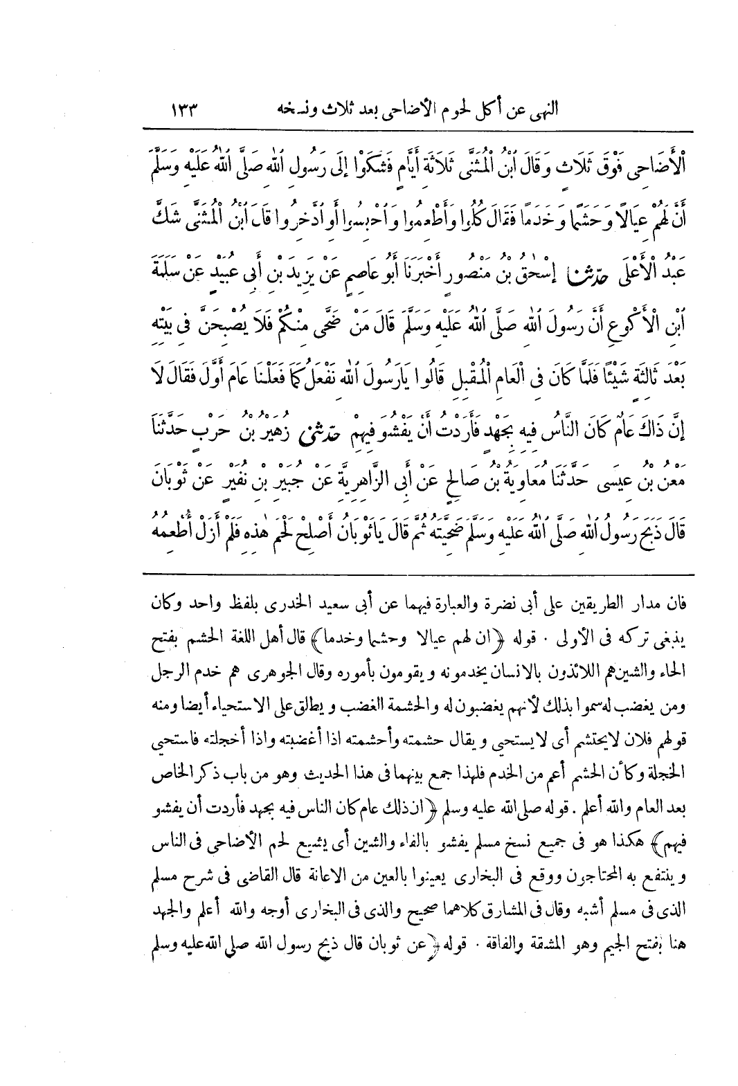 فَإِنَّ مَدَارَ الطَّرِيقَيْنِ عَلَى أَبِي نَضْرَةَ وَالْعِبَارَةُ فِيهِمَا عَنْ أَبِي سَعِيدٍ الْخُدْرِيِّ بِلَفْظٍ وَاحِدٍ وَكَانَ يَنْبَغِي تَرْكُهُ فِي الْأُولَى قَوْلُهُ (إِنَّ لَهُمْ عِيَالًا وَحَشَمًا وَخَدَمًا) قَالَ أَهْلُ اللُّغَةِ الْحَشَمُ بِفَتْحِ الْحَاءِ وَالشِّينِ هُمْ اللَّائِذُونَ بِالْإِنْسَانِ يَخْدُمُونَهُ وَيَقُومُونَ بِأُمُورِهِ وَقَالَ الْجَوْهَرِيُّ هُمْ خَدَمُ الرَّجُلِ وَمَنْ يَغْضَبُ لَهُ سُمُّوا بِذَلِكَ لِأَنَّهُمْ يَغْضَبُونَ لَهُ وَالْحِشْمَةُ الْغَضَبُ وَيُطْلَقُ عَلَى الِاسْتِحْيَاءِ أيضا ومنه قولهم فلان لايحتشم أَيْ لَا يَسْتَحِي وَيُقَالُ حَشَمْتُهُ وَأَحْشَمْتُهُ إِذَا أغضبته واذا أخجلته فاستحيى الْخَجْلَةَ وَكَأَنَّ الْحَشَمَ أَعَمُّ مِنَ الْخَدَمِ فَلِهَذَا جَمَعَ بَيْنَهُمَا فِي هَذَا الْحَدِيثِ وَهُوَ مِنْ بَابِ ذِكْرِ الْخَاصِّ بَعْدَ الْعَامِّ وَاللَّهُ أَعْلَمُ قَوْلُهُ صَلَّى اللَّهُ عَلَيْهِ وَسَلَّمَ
