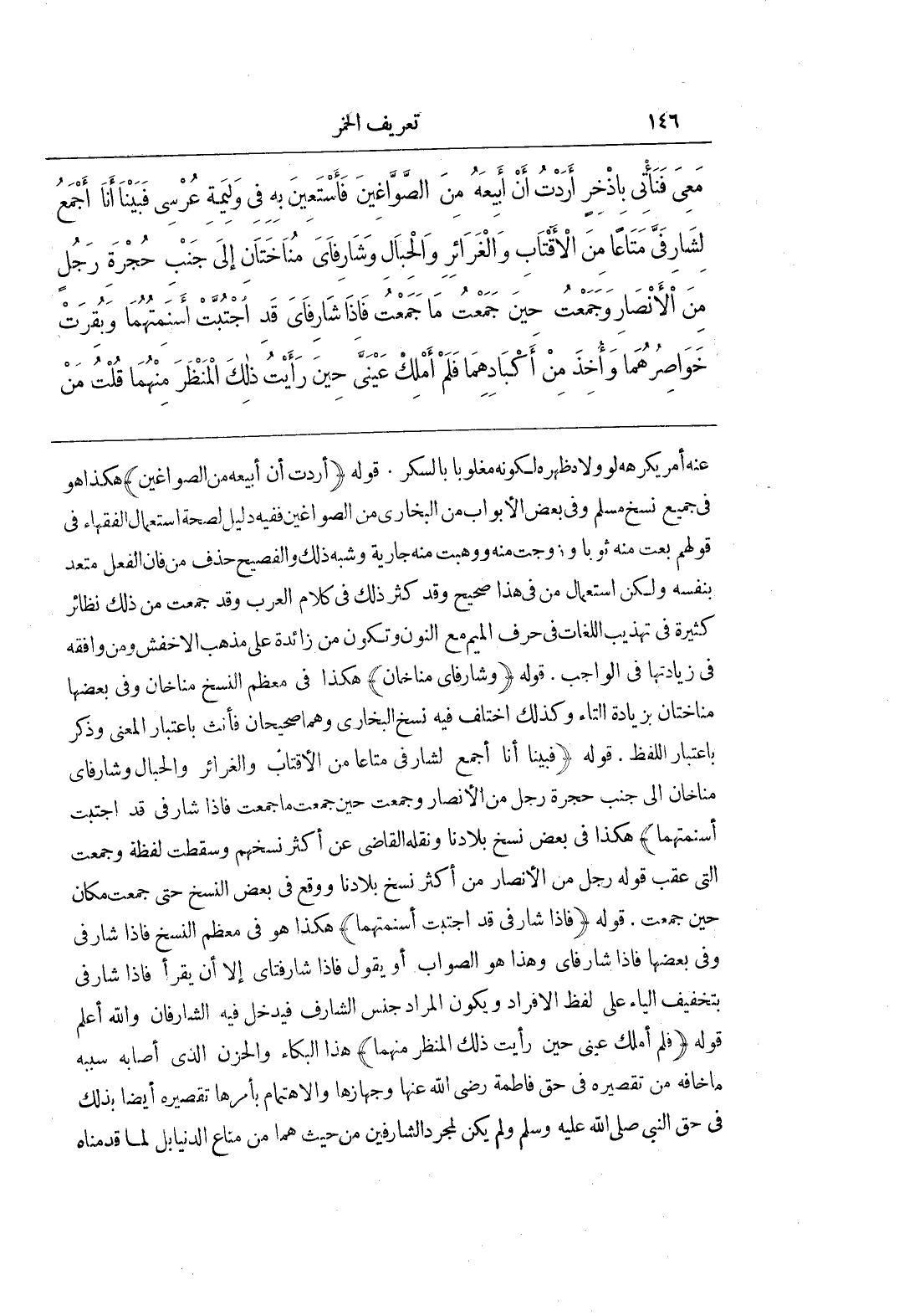 عَنْهُ أَمْرٌ يَكْرَهُهُ لَوْ وَلَّاهُ ظَهْرَهُ لِكَوْنِهِ مَغْلُوبًا بِالسُّكْرِ قَوْلُهُ (أَرَدْتُ أَنْ أَبِيعَهُ مِنَ الصَّوَّاغِينَ) هَكَذَا هُوَ فِي جَمِيعِ نُسَخِ مُسْلِمٍ وَفِي بَعْضِ الْأَبْوَابِ مِنَ الْبُخَارِيِّ مِنَ الصَّوَّاغِينَ فَفِيهِ دَلِيلٌ لِصِحَّةِ اسْتِعْمَالِ الْفُقَهَاءِ فِي قَوْلِهِمْ بِعْتُ مِنْهُ ثَوْبًا وَزَوَّجْتُ مِنْهُ وَوَهَبْتُ مِنْهُ جَارِيَةً وَشِبْهِ ذَلِكَ وَالْفَصِيحُ حَذْفُ مِنْ فَإِنَّ الْفِعْلَ مُتَعَدٍّ بِنَفْسِهِ وَلَكِنَّ اسْتِعْمَالَ مِنْ فِي هَذَا صَحِيحٌ وَقَدْ كَثُرَ ذَلِكَ فِي كَلَامِ الْعَرَبِ وَقَدْ جَمَعْتُ مِنْ ذَلِكَ نَظَائِرَ كَثِيرَةً فِي تَهْذِيبِ اللُّغَاتِ فِي حَرْفِ الْمِيمِ مَعَ النُّونِ وَتَكُونُ مِنْ زَائِدَةً عَلَى مَذْهَبِ الْأَخْفَشِ وَمَنْ وَافَقَهُ فِي زِيَادَتِهَا فِي الْوَاجِبِ قَوْلُهُ (وَشَارِفَايَ مُنَاخَانِ) هَكَذَا فِي مُعْظَمِ النُّسَخِ مُنَاخَانِ وَفِي بَعْضِهَا مُنَاخَتَانِ بِزِيَادَةِ التَّاءِ وَكَذَلِكَ اخْتَلَفَ فِيهِ نُسَخُ الْبُخَارِيِّ وَهُمَا صَحِيحَانِ فَأَنَّثَ بِاعْتِبَارِ الْمَعْنَى وَذَكَّرَ بِاعْتِبَارِ اللَّفْظِ قَوْلُهُ (فَبَيْنَا أَنَا أجمع لشار فى مَتَاعًا مِنَ الْأَقْتَابِ وَالْغَرَائِرِ وَالْحِبَالِ وَشَارِفَايَ مُنَاخَانِ إِلَى جَنْبِ حُجْرَةِ رَجُلٍ مِنَ الْأَنْصَارِ وَجَمَعْتُ حِينَ جَمَعْتُ مَا جَمَعْتُ فَإِذَا شَارِفَيَّ قَدِ اجْتُبَّتْ أَسْنِمَتُهُمَا) هَكَذَا فِي بَعْضَ نُسَخِ بِلَادِنَا وَنَقَلَهُ الْقَاضِي عَنْ أَكْثَرِ نُسَخِهِمْ وَسَقَطَتْ لَفْظَةُ وَجَمَعْتُ الَّتِي عَقِبَ قَوْلِهِ رَجُلٌ مِنَ الْأَنْصَارِ مِنْ أَكْثَرِ نُسَخِ بِلَادِنَا وَوَقَعَ فِي بَعْضِ النُّسَخِ حَتَّى جَمَعْتُ مَكَانَ حِينَ جَمَعْتُ قَوْلُهُ (فاذا شار فى قَدِ اجْتُبَّتْ أَسْنِمَتُهُمَا) هَكَذَا هُوَ فِي مُعْظَمِ النسخ فاذا شارفى وفى بعضها فاذاشارفاى وَهَذَا هُوَ الصَّوَابُ أَوْ يَقُولُ فَإِذَا شَارِفَتَايَ إِلَّا أَنْ يَقْرَأَ فَإِذَا شَارِفِي بِتَخْفِيفِ الْيَاءِ عَلَى لَفْظِ الْإِفْرَادِ وَيَكُونُ الْمُرَادُ جِنْسَ الشَّارِفِ فَيَدْخُلُ فِيهِ الشَّارِفَانِ وَاللَّهُ أَعْلَمُ قَوْلُهُ (فَلَمْ أَمْلِكْ عَيْنَيَّ حِينَ رَأَيْتُ ذَلِكَ الْمَنْظَرَ مِنْهُمَا) هَذَا الْبُكَاءُ وَالْحُزْنُ الَّذِي أَصَابَهُ سَبَبُهُ مَا خَافَهُ مِنْ تَقْصِيرِهِ فِي حَقِّ فَاطِمَةَ رَضِيَ اللَّهُ عَنْهَا وَجِهَازِهَا وَالِاهْتِمَامِ بِأَمْرِهَا تَقْصِيرُهُ أَيْضًا بِذَلِكَ فِي حَقِّ النَّبِيِّ صَلَّى اللَّهُ عَلَيْهِ وَسَلَّمَ وَلَمْ يَكُنْ لِمُجَرَّدِ الشَّارِفَيْنِ مِنْ حَيْثُ هما من متاع الدنيابل لما قدمناه