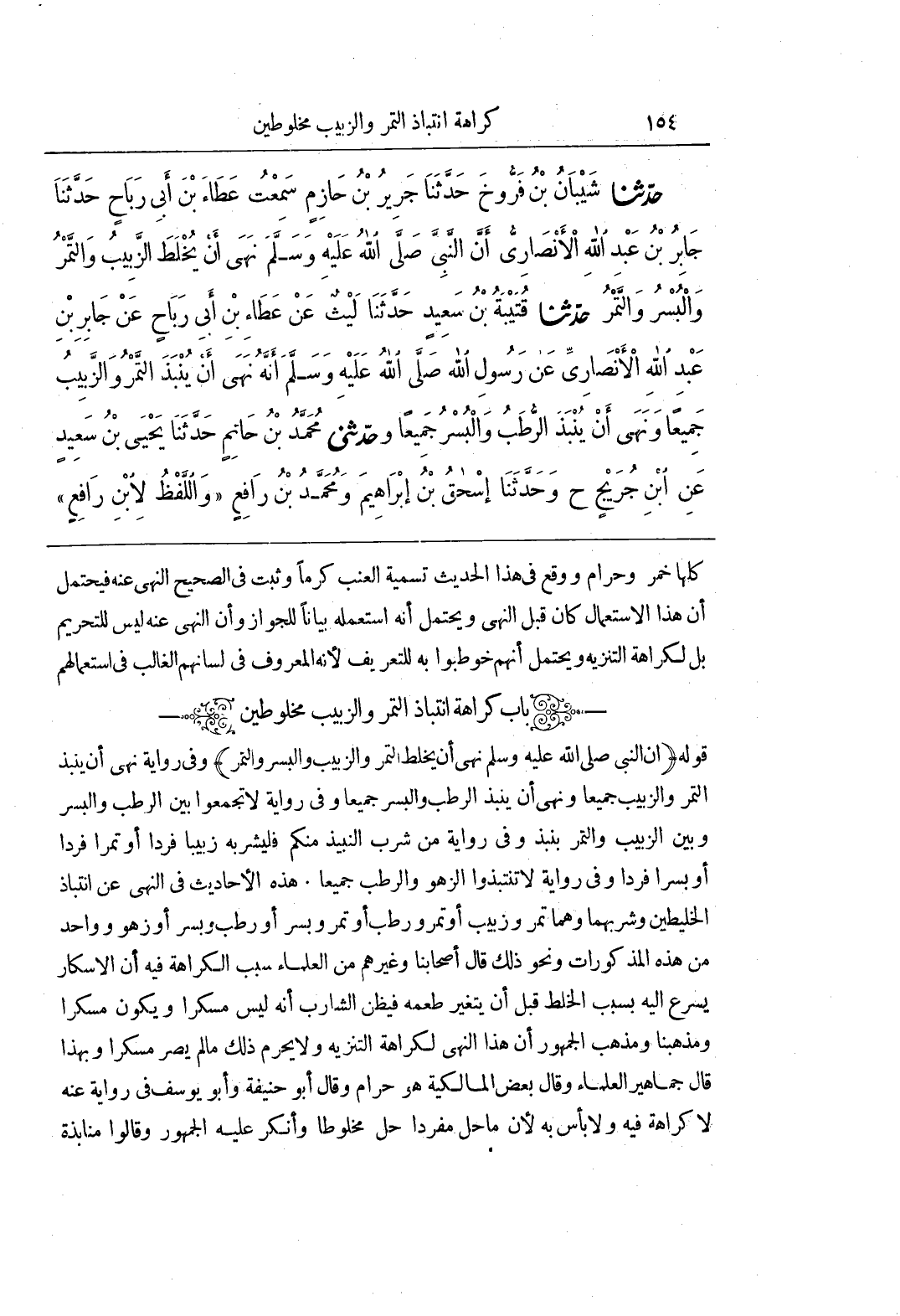 [1988] لَا تَنْتَبِذُوا الزَّهْوَ وَالرُّطَبَ جَمِيعًا هَذِهِ الْأَحَادِيثُ فِي النَّهْيِ عَنِ انْتِبَاذِ الْخَلِيطَيْنِ وشربهما وهما تمر وزبيب أوتمر وَرُطَبٌ أَوْ تَمْرٌ وَبُسْرٌ أَوْ رُطَبٌ وَبُسْرٌ أَوْ زَهْوٌ وَوَاحِدٌ مِنْ هَذِهِ الْمَذْكُورَاتِ وَنَحْوُ ذَلِكَ قَالَ أَصْحَابُنَا وَغَيْرُهُمْ مِنَ الْعُلَمَاءِ سَبَبُ الْكَرَاهَةِ فِيهِ أَنَّ الْإِسْكَارَ يُسْرِعُ إِلَيْهِ بِسَبَبِ الْخَلْطِ قَبْلَ أَنْ يَتَغَيَّرَ طَعْمُهُ فَيَظُنُّ الشَّارِبُ أَنَّهُ لَيْسَ مُسْكِرًا وَيَكُونُ مُسْكِرًا وَمَذْهَبُنَا وَمَذْهَبُ الجمهور أن هذا النهى لكراهة التنزيه ولايحرم ذلك مالم يَصِرْ مُسْكِرًا وَبِهَذَا قَالَ جَمَاهِيرُ الْعُلَمَاءِ وَقَالَ بعض المالكية هو حرام وقال أبوحنيفة وأبو يوسف فى رواية عنه لاكراهة فيه ولابأس بِهِ لِأَنَّ مَا حَلَّ مُفْرَدًا حَلَّ مَخْلُوطًا وَأَنْكَرَ عَلَيْهِ الْجُمْهُورُ وَقَالُوا مُنَابَذَةٌ