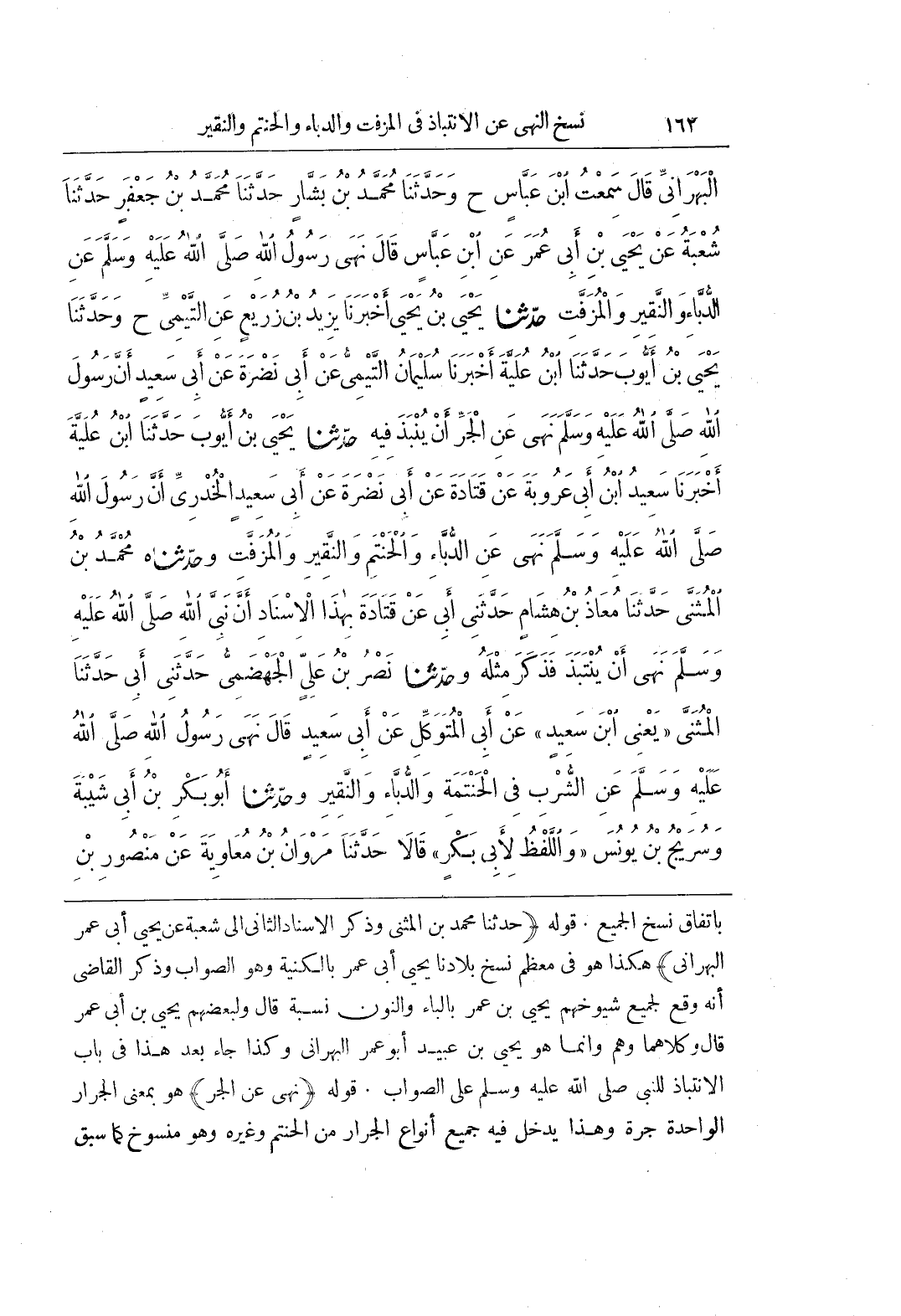 باتفاق نسخ الجميع قَوْلُهُ (حَدَّثَنَا مُحَمَّدُ بْنُ الْمُثَنَّى وَذَكَرَ الْإِسْنَادَ الثَّانِي إِلَى شُعْبَةَ عَنْ يَحْيَى أَبِي عُمَرَ الْبَهْرَانِيِّ) هَكَذَا هُوَ فِي مُعْظَمِ نُسَخِ بِلَادِنَا يَحْيَى أَبِي عُمَرَ بِالْكُنْيَةِ وَهُوَ الصَّوَابُ وَذَكَرَ الْقَاضِي أَنَّهُ وَقَعَ لِجَمِيعِ شُيُوخِهِمْ يَحْيَى بْنُ عُمَرَ بِالْبَاءِ وَالنُّونِ نِسْبَةً قَالَ وَلِبَعْضِهِمْ يَحْيَى بْنُ أَبِي عُمَرَ قَالَ وَكِلَاهُمَا وَهَمٌ وَإِنَّمَا هُوَ يَحْيَى بْنُ عُبَيْدٍ أَبُو عُمَرَ الْبَهْرَانِيُّ وَكَذَا جَاءَ بَعْدَ هَذَا فِي بَابِ الِانْتِبَاذِ لِلنَّبِيِّ صَلَّى اللَّهُ عَلَيْهِ وَسَلَّمَ عَلَى الصَّوَابِ