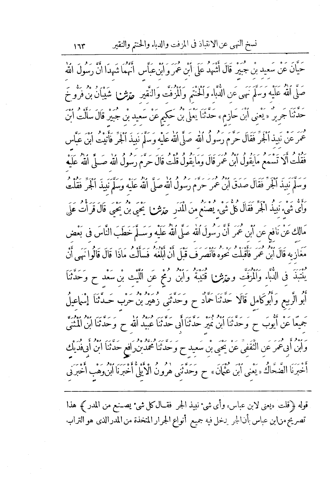 قَوْلُهُ (قُلْتُ يَعْنِي لِابْنِ عَبَّاسٍ وَأَيُّ شَيْءٍ نَبِيذُ الْجَرِّ فَقَالَ كُلُّ شَيْءٍ يُصْنَعُ مِنَ المدر) هذا تصريح من بن عَبَّاسٍ بِأَنَّ الْجَرَّ يَدْخُلُ فِيهِ جَمِيعُ أَنْوَاعِ الْجِرَارِ الْمُتَّخَذَةِ مِنَ الْمَدَرِ الَّذِي هُوَ التُّرَابُ