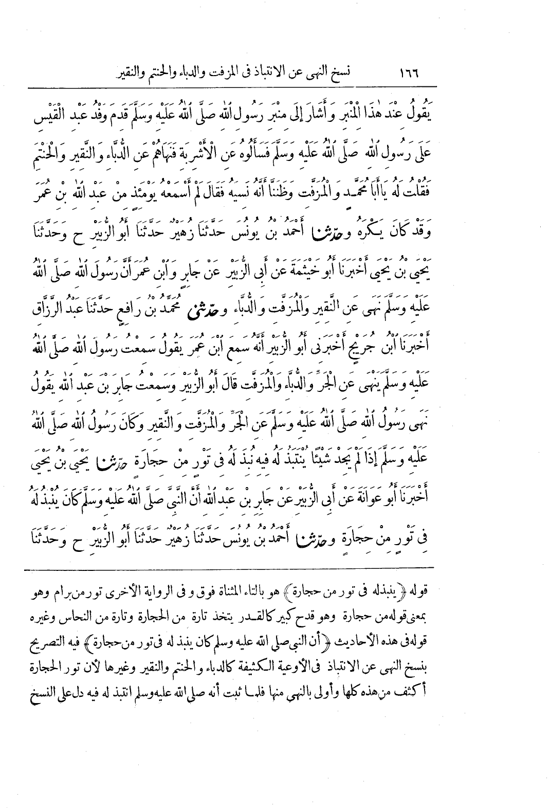 قَوْلُهُ فِي هَذِهِ الْأَحَادِيثِ أَنَّ النَّبِيَّ صَلَّى اللَّهُ عَلَيْهِ وَسَلَّمَ كَانَ يُنْبَذُ لَهُ فِي تَوْرٍ مِنْ حِجَارَةٍ فِيهِ التَّصْرِيحُ بِنَسْخِ النَّهْيِ عَنِ الِانْتِبَاذِ فِي الْأَوْعِيَةِ الْكَثِيفَةِ كَالدُّبَّاءِ وَالْحَنْتَمِ وَالنَّقِيرِ وَغَيْرِهَا لِأَنَّ تَوْرَ الْحِجَارَةِ أَكْثَفُ مِنْ هَذِهِ كُلِّهَا وَأَوْلَى بِالنَّهْيِ مِنْهَا فَلَمَّا ثَبَتَ أَنَّهُ صَلَّى اللَّهُ عَلَيْهِ وَسَلَّمَ انْتَبَذَ لَهُ فِيهِ دَلَّ عَلَى النَّسْخِ
