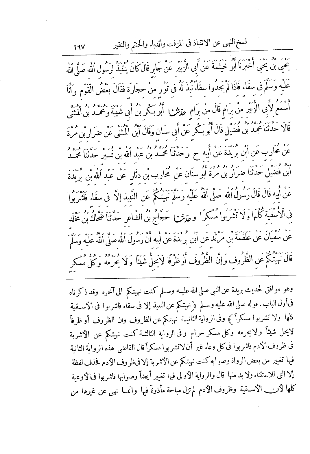 وَهُوَ مُوَافِقٌ لِحَدِيثِ بُرَيْدَةَ عَنِ النَّبِيِّ صَلَّى اللَّهُ عَلَيْهِ وَسَلَّمَ كُنْتُ نَهَيْتُكُمْ إِلَى آخِرِهِ وَقَدْ ذَكَرْنَاهُ فِي أَوَّلِ الْبَابِ قَوْلُهُ صَلَّى الله عليه وسلم (نهيتكم عن النبيذ إلافى سقاء فاشربوا فى الأسقية كلها ولاتشربوا مُسْكِرًا) وَفِي الرِّوَايَةِ الثَّانِيَةِ نَهَيْتُكُمْ عَنِ الظُّرُوفِ وإن الظروف أو ظرفا لايحل شيئا ولايحرمه وَكُلُّ مُسْكِرٍ حَرَامٌ وَفِي الرِّوَايَةِ الثَّالِثَةِ كُنْتُ نَهَيْتُكُمْ عَنِ الْأَشْرِبَةِ فِي ظُرُوفِ الْأَدَمِ فَاشْرَبُوا فى كل وعاء غير أن لاتشربوا مُسْكِرًا قَالَ الْقَاضِي هَذِهِ الرِّوَايَةُ الثَّانِيَةُ فِيهَا تَغْيِيرٌ مِنْ بَعْضِ الرُّوَاةِ وَصَوَابُهُ كُنْتُ نَهَيْتُكُمْ عن الأشربة إلافى ظُرُوفِ الْأَدَمِ فَحَذَفَ لَفْظَةَ إِلَّا الَّتِي لِلِاسْتِثْنَاءِ ولابد مِنْهَا قَالَ وَالرِّوَايَةُ الْأُولَى فِيهَا تَغْيِيرٌ أَيْضًا وَصَوَابُهَا فَاشْرَبُوا فِي الْأَوْعِيَةِ كُلِّهَا لِأَنَّ الْأَسْقِيَةَ وَظُرُوفَ الْأَدَمِ لَمْ تَزَلْ مُبَاحَةً مَأْذُونًا فِيهَا وَإِنَّمَا نَهَى عَنْ غَيْرِهَا مِنَ