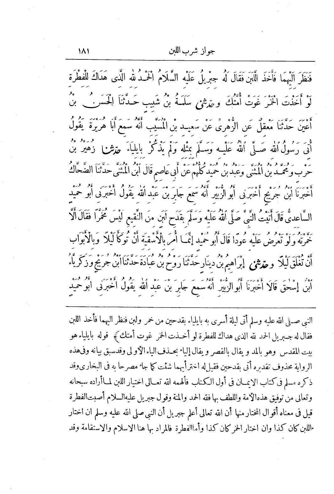 النَّبِيَّ صَلَّى اللَّهُ عَلَيْهِ وَسَلَّمَ أُتِيَ لَيْلَةَ أسرى به بايلياءبقدحين مِنْ خَمْرٍ وَلَبَنٍ فَنَظَرَ إِلَيْهِمَا فَأَخَذَ اللَّبَنَ فَقَالَ لَهُ جِبْرِيلُ الْحَمْدُ لِلَّهِ الَّذِي هَدَاكَ لِلْفِطْرَةِ لَوْ أَخَذْتَ الْخَمْرَ غَوَتْ أُمَّتُكَ) قَوْلُهُ بِإِيلِيَاءَ هُوَ بَيْتُ الْمَقْدِسِ وَهُوَ بِالْمَدِّ وَيُقَالُ بالقصر ويقال إلياء بحذف الياء الأولى وقدسبق بَيَانُهُ وَفِي هَذِهِ الرِّوَايَةِ مَحْذُوفٌ تَقْدِيرُهُ أُتِيَ بقدحين فقيل له اخترأيهما شِئْتَ كَمَا جَاءَ مُصَرَّحًا بِهِ فِي الْبُخَارِيِّ وَقَدْ ذَكَرَهُ مُسْلِمٌ فِي كِتَابِ الْإِيمَانِ فِي أَوَّلِ الْكِتَابِ فَأَلْهَمَهُ اللَّهُ تَعَالَى اخْتِيَارَ اللَّبَنِ لِمَا أَرَادَهُ سُبْحَانَهُ وَتَعَالَى مِنْ تَوْفِيقِ هَذِهِ الْأُمَّةِ وَاللُّطْفِ بِهَا فَلِلَّهِ الْحَمْدُ وَالْمِنَّةُ وَقَوْلُ جِبْرِيلَ عَلَيْهِ السَّلَامُ أَصَبْتَ الْفِطْرَةَ قِيلَ فِي مَعْنَاهُ أَقْوَالٌ الْمُخْتَارُ مِنْهَا أَنَّ اللَّهَ تَعَالَى أَعْلَمَ جِبْرِيلَ أَنَّ النَّبِيَّ صَلَّى اللَّهُ عَلَيْهِ وَسَلَّمَ إِنِ اخْتَارَ اللَّبَنَ كَانَ كَذَا وَإِنِ اخْتَارَ الْخَمْرَ كَانَ كَذَا وَأَمَّا الْفِطْرَةُ فَالْمُرَادُ بِهَا هُنَا الْإِسْلَامُ وَالِاسْتِقَامَةُ وَقَدْ