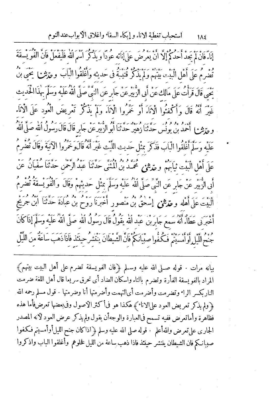 [2012] قَوْلُهُ صَلَّى اللَّهُ عَلَيْهِ وَسَلَّمَ (فَإِنَّ الْفُوَيْسِقَةَ تُضْرِمُ عَلَى أَهْلِ الْبَيْتِ بَيْتَهُمْ) الْمُرَادُ بِالْفُوَيْسِقَةِ الْفَأْرَةُ وَتُضْرِمُ بِالتَّاءِ وَإِسْكَانِ الضَّادِ أَيْ تُحْرِقُ سَرِيعًا قَالَ أَهْلُ اللُّغَةِ ضَرِمَتِ النَّارُ بِكَسْرِ الرَّاءِ وَتَضَرَّمَتْ وَأَضْرَمَتْ أَيْ الْتَهَمَتْ وَأَضْرَمْتُهَا أَنَا وَضَرَمْتُهَا قَوْلُ مُسْلِمٍ رَحِمَهُ اللَّهُ (وَلَمْ يَذْكُرْ تَعْرِيضَ الْعُودِ عَلَى الْإِنَاءِ) هَكَذَا هُوَ فِي أَكْثَرِ الْأُصُولِ وَفِي بَعْضِهَا تَعْرُضَ فَأَمَّا هَذِهِ فَظَاهِرَةٌ وَأَمَّا تَعْرُضَ فَفِيهِ تَسَمُّحٌ فِي الْعِبَارَةِ وَالْوَجْهُ أَنْ يَقُولَ وَلَمْ يَذْكُرْ عَرْضَ الْعُودِ لِأَنَّهُ الْمَصْدَرُ الْجَارِي عَلَى تَعْرُضَ وَاللَّهُ أَعْلَمُ قَوْلُهُ صَلَّى اللَّهُ عَلَيْهِ وَسَلَّمَ إِذَا كَانَ جُنْحُ اللَّيْلِ أَوْ أَمْسَيْتُمْ فَكُفُّوا صِبْيَانَكُمْ فَإِنَّ الشَّيْطَانَ يَنْتَشِرُ حِينَئِذٍ فَإِذَا ذَهَبَ سَاعَةً مِنَ اللَّيْلِ فَخَلُّوهُمْ وَأَغْلِقُوا الْبَابَ وَاذْكُرُوا