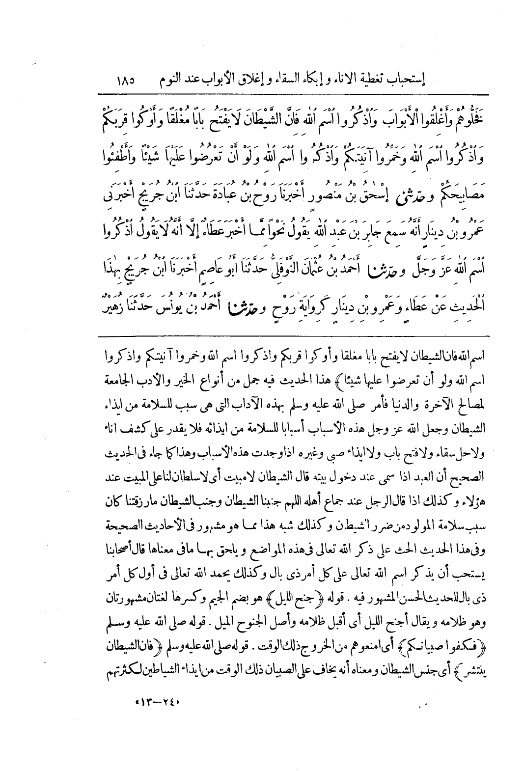 اسم الله فإن الشيطان لايفتح بَابًا مُغْلَقًا وَأَوْكُوا قِرَبَكُمْ وَاذْكُرُوا اسْمَ اللَّهِ وَخَمِّرُوا آنِيَتَكُمْ وَاذْكُرُوا اسْمَ اللَّهِ وَلَوْ أَنْ تَعْرُضُوا عَلَيْهَا شَيْئًا) هَذَا الْحَدِيثُ فِيهِ جُمَلٌ مِنْ أَنْوَاعِ الْخَيْرِ وَالْأَدَبِ الْجَامِعَةِ لِمَصَالِحِ الْآخِرَةِ وَالدُّنْيَا فَأَمَرَ صَلَّى اللَّهُ عَلَيْهِ وَسَلَّمَ بِهَذِهِ الْآدَابِ الَّتِي هِيَ سَبَبٌ لِلسَّلَامَةِ مِنْ إِيذَاءِ الشَّيْطَانِ وَجَعَلَ اللَّهُ عَزَّ وَجَلَّ هَذِهِ الْأَسْبَابَ أسبابا للسلامة من ايذائه فلايقدر على كشف اناء ولا حل سقاء ولافتح باب ولاايذاء صَبِيٍّ وَغَيْرِهِ إِذَا وُجِدَتْ هَذِهِ الْأَسْبَابُ وَهَذَا كَمَا جَاءَ فِي الْحَدِيثِ الصَّحِيحِ إِنَّ الْعَبْدَ إِذَا سَمَّى عِنْدَ دُخُولِ بَيْتِهِ قَالَ الشَّيْطَانُ لامبيت أى لاسلطان لَنَا عَلَى الْمَبِيتِ عِنْدَ هَؤُلَاءِ وَكَذَلِكَ إِذَا قَالَ الرَّجُلُ عِنْدَ جِمَاعِ أَهْلِهِ اللَّهُمَّ جَنِّبْنَا الشيطان وجنب الشيطان مارزقتنا كَانَ سَبَبَ سَلَامَةِ الْمَوْلُودِ مِنْ ضَرَرِ الشَّيْطَانِ وَكَذَلِكَ شِبْهُ هَذَا مِمَّا هُوَ مَشْهُورٌ فِي الْأَحَادِيثِ الصَّحِيحَةِ وَفِي هَذَا الْحَدِيثِ الْحَثُّ عَلَى ذِكْرِ اللَّهِ تَعَالَى فِي هَذِهِ الْمَوَاضِعِ وَيَلْحَقُ بِهَا مَا فِي مَعْنَاهَا قَالَ أَصْحَابُنَا يُسْتَحَبُّ أَنْ يُذْكَرَ اسْمُ اللَّهِ تَعَالَى عَلَى كُلِّ أَمْرٍ ذِي بَالٍ وَكَذَلِكَ يَحْمَدُ اللَّهَ تَعَالَى فِي أَوَّلِ كُلِّ أَمْرٍ ذِي بَالٍ لِلْحَدِيثِ الْحَسَنِ الْمَشْهُورِ فِيهِ قَوْلُهُ (جُنْحُ اللَّيْلِ) هُوَ بِضَمِّ الْجِيمِ وَكَسْرِهَا لُغَتَانِ مَشْهُورَتَانِ وَهُوَ ظَلَامُهُ وَيُقَالُ أَجْنَحَ اللَّيْلُ أَيْ أَقْبَلَ ظَلَامُهُ وَأَصْلُ الْجُنُوحِ الْمَيْلُ قَوْلُهُ صَلَّى اللَّهُ عَلَيْهِ وَسَلَّمَ (فَكُفُّوا صِبْيَانَكُمْ) أَيِ امْنَعُوهُمْ مِنَ الْخُرُوجِ ذَلِكَ الْوَقْتَ قَوْلُهُ صَلَّى اللَّهُ عَلَيْهِ وَسَلَّمَ (فَإِنَّ الشَّيْطَانَ يَنْتَشِرُ) أَيْ جِنْسُ الشَّيْطَانِ وَمَعْنَاهُ أَنَّهُ يُخَافُ عَلَى الصِّبْيَانِ ذَلِكَ الْوَقْتَ مِنْ إِيذَاءِ الشياطين لكثرتهم