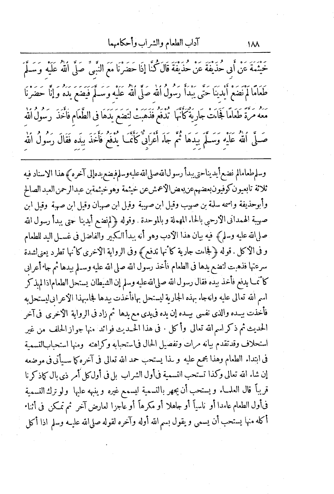 وَسَلَّمَ طَعَامًا لَمْ نَضَعْ أَيْدِيَنَا حَتَّى يَبْدَأَ رَسُولُ اللَّهِ صَلَّى اللَّهُ عَلَيْهِ وَسَلَّمَ فَيَضَعُ يَدَهُ إِلَى آخِرِهِ) هَذَا الْإِسْنَادُ فِيهِ ثَلَاثَةٌ تَابِعِيُّونَ كُوفِيُّونَ بَعْضُهُمْ عَنْ بَعْضٍ الْأَعْمَشُ عَنْ خَيْثَمَةَ وَهُوَ خَيْثَمَةُ بْنُ عَبْدِ الرَّحْمَنِ الْعَبْدُ الصالح وأبوحذيفة واسمه سلمة بن صهيب وقيل بن صهيبة وقيل بن صهبان وقيل بن صهبة وقيل بن صُهَيْبَةَ الْهَمْدَانِيُّ الْأَرْحَبِيُّ بِالْحَاءِ الْمُهْمَلَةِ وَبِالْمُوَحَّدَةِ وَقَوْلُهُ (لَمْ نَضَعْ أَيْدِيَنَا حَتَّى يَبْدَأَ رَسُولِ اللَّهِ صَلَّى اللَّهُ عَلَيْهِ وَسَلَّمَ) فِيهِ بَيَانُ هَذَا الْأَدَبِ وَهُوَ أَنَّهُ يَبْدَأُ الْكَبِيرُ وَالْفَاضِلُ فِي غَسْلِ الْيَدِ لِلطَّعَامِ وَفِي الْأَكْلِ قَوْلُهُ فَجَاءَتْ جَارِيَةٌ كَأَنَّهَا تَدْفَعُ) وَفِي الرِّوَايَةِ الْأُخْرَى كَأَنَّهَا تَطْرُدُ يَعْنِي لِشِدَّةِ سُرْعَتِهَا فَذَهَبَتْ لِتَضَعَ يَدَهَا فِي الطَّعَامِ فَأَخَذَ رَسُولُ اللَّهِ صَلَّى اللَّهُ عَلَيْهِ وَسَلَّمَ بِيَدِهَا ثُمَّ جَاءَ أَعْرَابِيٌّ كَأَنَّمَا يَدْفَعُ فَأَخَذَ بِيَدِهِ فَقَالَ رَسُولُ اللَّهِ صَلَّى اللَّهُ عَلَيْهِ وَسَلَّمَ إِنَّ الشَّيْطَانَ يَسْتَحِلُّ الطَّعَامَ إِذَا لَمْ يُذْكَرِ اسْمُ اللَّهِ تَعَالَى عَلَيْهِ وَإِنَّهُ جَاءَ بِهَذِهِ الْجَارِيَةِ لِيَسْتَحِلَّ بِهَا فَأَخَذْتُ بيدها فجاءبهذا الْأَعْرَابِيِّ لِيَسْتَحِلَّ بِهِ فَأَخَذْتُ بِيَدِهِ وَالَّذِي نَفْسِي بِيَدِهِ إِنَّ يَدَهُ فِي يَدِي مَعَ يَدِهَا ثُمَّ زَادَ فِي الرِّوَايَةِ الْأُخْرَى فِي آخِرِ الْحَدِيثِ ثُمَّ ذَكَرَ اسْمَ اللَّهِ تَعَالَى وَأَكَلَ فِي هَذَا الْحَدِيثِ فَوَائِدُ مِنْهَا جَوَازُ الْحَلِفِ مِنْ غَيْرِ اسْتِحْلَافٍ وَقَدْ تَقَدَّمَ بَيَانُهُ مَرَّاتٍ وَتَفْصِيلُ الْحَالِ فِي اسْتِحْبَابِهِ وَكَرَاهَتِهِ وَمِنْهَا اسْتِحْبَابُ التَّسْمِيَةِ فِي ابْتِدَاءِ الطَّعَامِ وَهَذَا مُجْمَعٌ عَلَيْهِ وهذا يستحب حمدالله تَعَالَى فِي آخِرِهِ كَمَا سَيَأْتِي فِي مَوْضِعِهِ إِنْ شَاءَ اللَّهُ تَعَالَى وَكَذَا تُسْتَحَبُّ التَّسْمِيَةُ فِي أَوَّلِ الشَّرَابِ بَلْ فِي أَوَّلِ كُلِّ أَمْرٍ ذِي بَالٍ كَمَا ذَكَرْنَا قَرِيبًا قَالَ الْعُلَمَاءُ وَيُسْتَحَبُّ أَنْ يَجْهَرَ بِالتَّسْمِيَةِ لِيُسْمِعَ غَيْرَهُ وَيُنَبِّهَهُ عَلَيْهَا وَلَوْ تَرَكَ التَّسْمِيَةَ فِي أَوَّلِ الطعام عامدا أو ناسيا أو جاهلا أومكرها أَوْ عَاجِزًا لِعَارِضٍ آخَرَ ثُمَّ تَمَكَّنَ فِي أَثْنَاءِ أَكْلِهِ مِنْهَا يُسْتَحَبُّ أَنْ يُسَمِّيَ وَيَقُولَ بِسْمِ اللَّهِ أَوَّلَهُ وَآخِرَهُ لِقَوْلِهِ صَلَّى اللَّهُ عَلَيْهِ وَسَلَّمَ إِذَا أَكَلَ