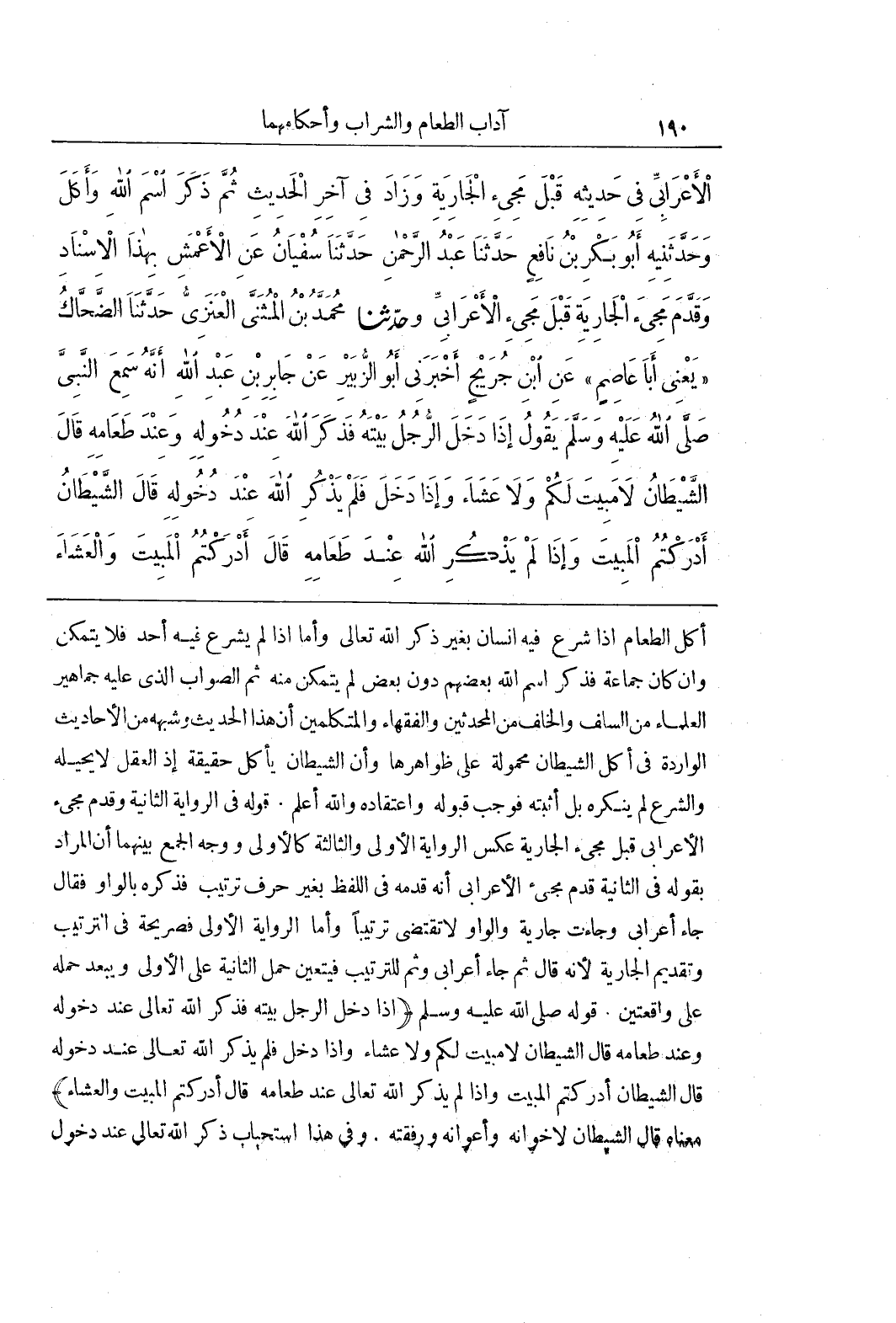 أَكْلِ الطَّعَامِ إِذَا شَرَعَ فِيهِ إِنْسَانٌ بِغَيْرِ ذِكْرِ اللَّهِ تَعَالَى وَأَمَّا إِذَا لَمْ يَشْرَعْ فيه أحد فلايتمكن وَإِنْ كَانَ جَمَاعَةٌ فَذَكَرَ اسْمَ اللَّهِ بَعْضُهُمْ دُونَ بَعْضٍ لَمْ يَتَمَكَّنْ مِنْهُ ثُمَّ الصَّوَابُ الَّذِي عَلَيْهِ جَمَاهِيرُ الْعُلَمَاءِ مِنَ السَّلَفِ وَالْخَلَفِ مِنَ الْمُحَدِّثِينَ وَالْفُقَهَاءِ وَالْمُتَكَلِّمِينَ أَنَّ هَذَا الْحَدِيثَ وَشِبْهَهُ مِنَ الْأَحَادِيثِ الْوَارِدَةِ فِي أَكْلِ الشَّيْطَانِ مَحْمُولَةٌ عَلَى ظَوَاهِرِهَا وَأَنَّ الشَّيْطَانَ يَأْكُلُ حَقِيقَةً إذ العقل لايحيله وَالشَّرْعُ لَمْ يُنْكِرْهُ بَلْ أَثْبَتَهُ فَوَجَبَ قَبُولُهُ وَاعْتِقَادُهُ وَاللَّهُ أَعْلَمُ قَوْلُهُ فِي الرِّوَايَةِ الثَّانِيَةِ وقدم مجئ الأعرابى قبل مجئ الْجَارِيَةِ عَكْسَ الرِّوَايَةِ الْأُولَى وَالثَّالِثَةُ كَالْأُولَى وَوَجْهُ الْجَمْعِ بَيْنَهُمَا أَنَّ الْمُرَادَ بِقَوْلِهِ فِي الثَّانِيَةِ قدم مجئ الْأَعْرَابِيِّ أَنَّهُ قَدَّمَهُ فِي اللَّفْظِ بِغَيْرِ حَرْفِ تَرْتِيبٍ فَذَكَرَهُ بِالْوَاوِ فَقَالَ جَاءَ أَعْرَابِيٌّ وَجَاءَتْ جارية والواو لاتقتضى تَرْتِيبًا وَأَمَّا الرِّوَايَةُ الْأُولَى فَصَرِيحَةٌ فِي التَّرْتِيبِ وَتَقْدِيمِ الْجَارِيَةِ لِأَنَّهُ قَالَ ثُمَّ جَاءَ أَعْرَابِيٌّ وَثُمَّ لِلتَّرْتِيبِ فَيَتَعَيَّنَ حَمْلُ الثَّانِيَةِ عَلَى الْأُولَى ويبعد حمله على واقعتين