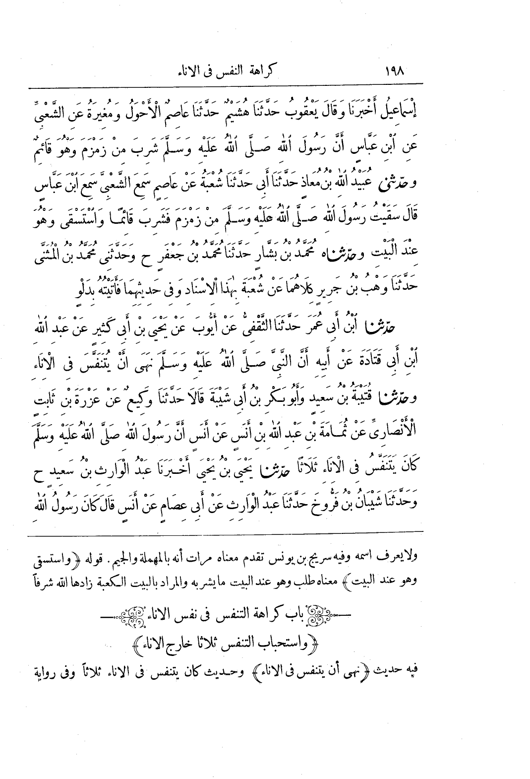 [2028] وَحَدِيثُ كَانَ يَتَنَفَّسُ فِي الْإِنَاءِ ثَلَاثًا وفى رواية