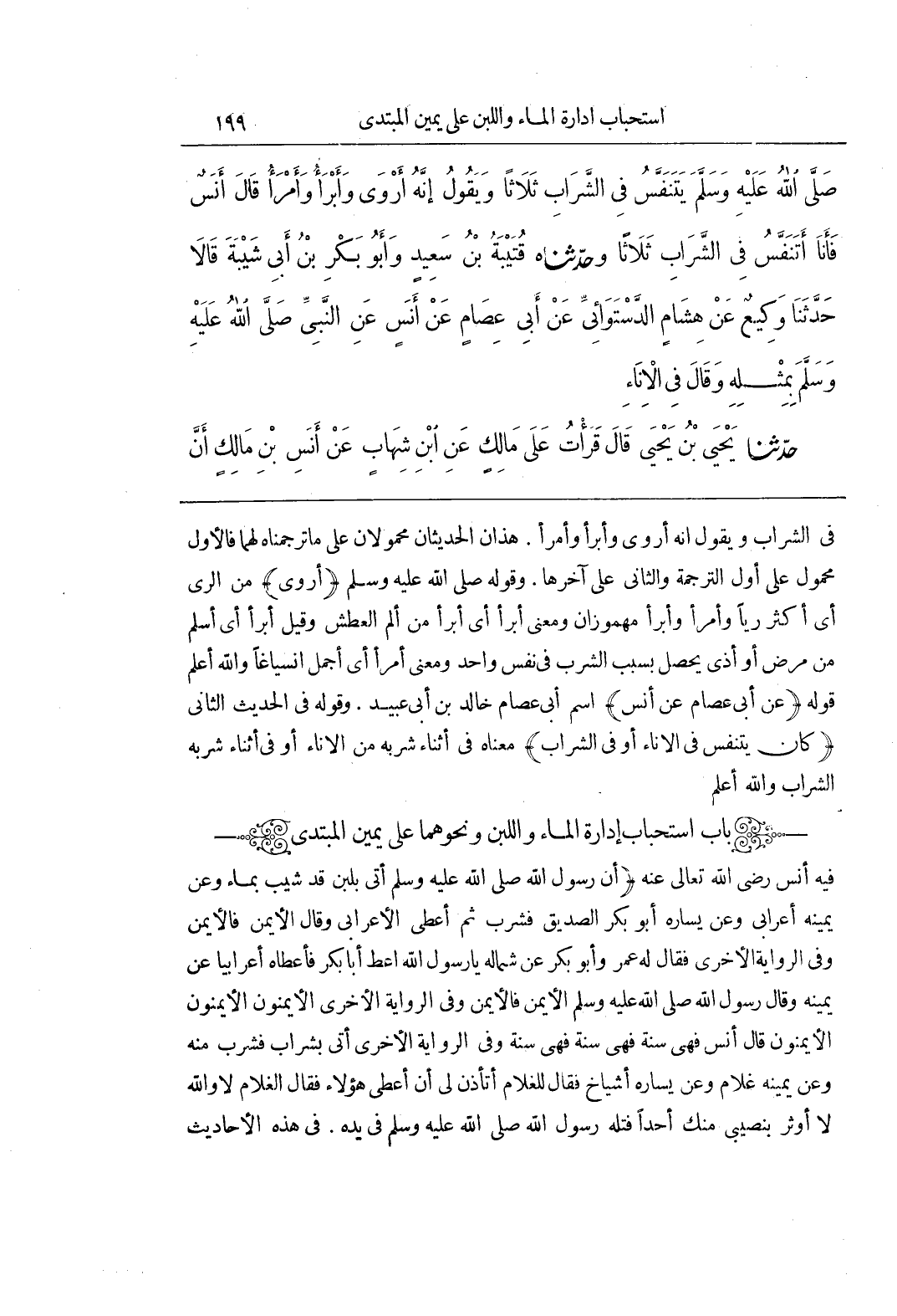 [2029] فِيهِ أَنَسٌ رَضِيَ اللَّهُ تَعَالَى عَنْهُ (أَنَّ رَسُولَ اللَّهِ صَلَّى اللَّهُ عَلَيْهِ وَسَلَّمَ أُتِيَ بِلَبَنٍ قَدْ شِيبَ بِمَاءٍ وَعَنْ يَمِينِهِ أَعْرَابِيٌّ وعن يساره أبوبكر الصِّدِّيقُ فَشَرِبَ ثُمَّ أَعْطَى الْأَعْرَابِيَّ وَقَالَ الْأَيْمَنَ فَالْأَيْمَنَ وَفِي الرِّوَايَةِ الْأُخْرَى فَقَالَ لَهُ عُمَرُ وأبو بكر عن شماله يارسول اللَّهِ أَعْطِ أَبَا بَكْرٍ فَأَعْطَاهُ أَعْرَابِيًّا عَنْ يَمِينِهِ وَقَالَ رَسُولُ اللَّهِ صَلَّى اللَّهُ عَلَيْهِ وَسَلَّمَ الْأَيْمَنَ فَالْأَيْمَنَ وَفِي الرِّوَايَةِ الْأُخْرَى الْأَيْمَنُونَ الْأَيْمَنُونَ الْأَيْمَنُونَ قَالَ أَنَسٌ فَهِيَ سُنَّةٌ فَهِيَ سُنَّةٌ فَهِيَ سُنَّةٌ