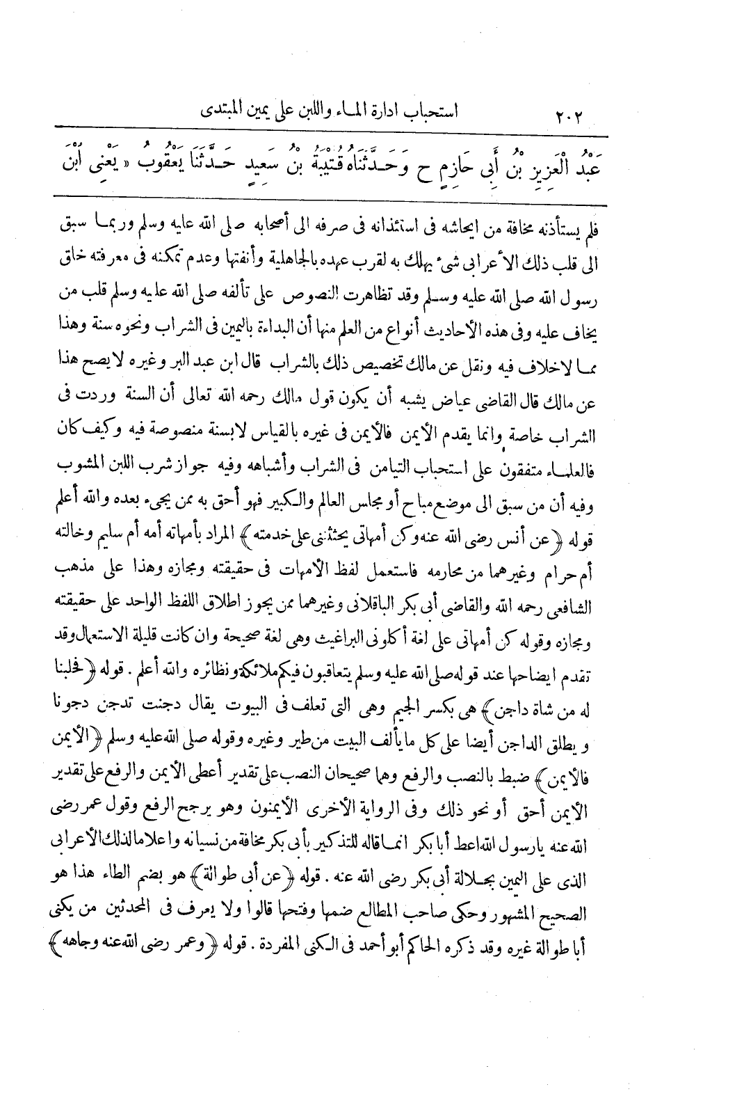 فَلَمْ يَسْتَأْذِنْهُ مَخَافَةَ مِنْ إِيحَاشِهِ فِي اسْتِئْذَانِهِ فِي صَرْفِهِ إِلَى أَصْحَابِهِ صَلَّى اللَّهُ عَلَيْهِ وَسَلَّمَ وَرُبَّمَا سَبَقَ إِلَى قَلْبِ ذَلِكَ الْأَعْرَابِيِّ شئ يَهْلِكُ بِهِ لِقُرْبِ عَهْدِهِ بِالْجَاهِلِيَّةِ وَأَنَفَتِهَا وَعَدَمِ تَمَكُّنِهِ فِي مَعْرِفَتِهِ خُلُقِ رَسُولِ اللَّهِ صَلَّى اللَّهُ عَلَيْهِ وَسَلَّمَ وَقَدْ تَظَاهَرَتِ النُّصُوصُ عَلَى تَأَلُّفِهِ صَلَّى اللَّهُ عَلَيْهِ وَسَلَّمَ قَلْبَ مَنْ يَخَافُ عَلَيْهِ وَفِي هَذِهِ الْأَحَادِيثِ أَنْوَاعٌ مِنَ الْعِلْمِ مِنْهَا أَنَّ الْبُدَاءَةَ بِالْيَمِينِ فِي الشَّرَابِ ونحوه سنة وهذا مما لاخلاف فِيهِ وَنُقِلَ عَنْ مَالِكٍ تَخْصِيصُ ذَلِكَ بِالشَّرَابِ قال بن عبد البر وغيره لايصح هَذَا عَنْ مَالِكٍ قَالَ الْقَاضِي عِيَاضٌ يُشْبِهُ أَنْ يَكُونَ قَوْلُ مَالِكٍ رَحِمَهُ اللَّهُ تَعَالَى أَنَّ السُّنَّةَ وَرَدَتْ فِي الشَّرَابِ خَاصَّةً وَإِنَّمَا يقدم الأيمن فالأيمن فى غيره بالقياس لابسنة مَنْصُوصَةٍ فِيهِ وَكَيْفَ كَانَ فَالْعُلَمَاءُ مُتَّفِقُونَ عَلَى اسْتِحْبَابِ التَّيَامُنِ فِي الشَّرَابِ وَأَشْبَاهِهِ وَفِيهِ جَوَازُ شُرْبِ اللَّبَنِ الْمَشُوبِ وَفِيهِ أَنَّ مَنْ سَبَقَ إِلَى مَوْضِعٍ مُبَاحٍ أَوْ مَجْلِسِ الْعَالِمِ وَالْكَبِيرِ فهو أحق به ممن يجئ بعده والله أعلم قَوْلُهُ (عَنْ أَنَسٍ رَضِيَ اللَّهُ عَنْهُ وَكُنَّ أمهاتى يحثثنى عَلَى خِدْمَتِهِ) الْمُرَادُ بِأُمَّهَاتِهِ أُمُّهُ أُمُّ سُلَيْمٍ وَخَالَتُهُ أُمُّ حَرَامٍ وَغَيْرُهُمَا مِنْ مَحَارِمِهِ فَاسْتَعْمَلَ لَفْظَ الْأُمَّهَاتِ فِي حَقِيقَتِهِ وَمَجَازِهِ وَهَذَا عَلَى مَذْهَبِ الشَّافِعِيِّ رَحِمَهُ اللَّهُ وَالْقَاضِي أَبِي بَكْرٍ الْبَاقِلَّانِيِّ وَغَيْرِهِمَا مِمَّنْ يُجَوِّزُ إِطْلَاقَ اللَّفْظِ الْوَاحِدِ عَلَى حَقِيقَتِهِ وَمَجَازِهِ وَقَوْلُهُ كُنَّ أُمَّهَاتِي عَلَى لُغَةِ أَكَلُونِي الْبَرَاغِيثُ وَهِيَ لُغَةٌ صَحِيحَةٌ وَإِنْ كَانَتْ قَلِيلَةَ الِاسْتِعْمَالِ وَقَدْ تَقَدَّمَ إِيضَاحُهَا عِنْدَ قَوْلُهُ صَلَّى اللَّهُ عَلَيْهِ وَسَلَّمَ يَتَعَاقَبُونَ فِيكُمْ مَلَائِكَةٌ وَنَظَائِرُهُ وَاللَّهُ أَعْلَمُ قَوْلُهُ (فَحَلَبْنَا لَهُ مِنْ شَاةٍ دَاجِنٍ) هِيَ بِكَسْرِ الْجِيمِ وَهِيَ الَّتِي تُعْلَفُ فِي الْبُيُوتِ يُقَالُ دَجَنَتْ تَدْجُنُ دجونا ويطلق الداجن أيضا علىكل مَا يَأْلَفُ الْبَيْتَ مِنْ طَيْرٍ وَغَيْرِهِ وَقَوْلُهُ صَلَّى اللَّهُ عَلَيْهِ وَسَلَّمَ (الْأَيْمَنَ فَالْأَيْمَنَ) ضُبِطَ بِالنَّصْبِ وَالرَّفْعِ وَهُمَا صَحِيحَانِ النَّصْبُ عَلَى تَقْدِيرِ أعطى الْأَيْمَنَ وَالرَّفْعُ عَلَى تَقْدِيرِ الْأَيْمَنُ أَحَقُّ أَوْ نَحْوِ ذَلِكَ وَفِي الرِّوَايَةِ الْأُخْرَى الْأَيْمَنُونَ وَهُوَ يُرَجِّحُ الرَّفْعَ وَقَوْلُ عُمَرَ رَضِيَ اللَّهُ عَنْهُ يَا رَسُولَ اللَّهِ أَعْطِ أَبَا بَكْرٍ إِنَّمَا قَالَهُ لِلتَّذْكِيرِ بِأَبِي بَكْرٍ مَخَافَةً مِنْ نِسْيَانِهِ واعلاما لذلك الأعرابى الذى على اليمن بِجَلَالَةِ أَبِي بَكْرٍ رَضِيَ اللَّهُ عَنْهُ قَوْلُهُ (عَنْ أَبِي طُوَالَةَ) هُوَ بِضَمِّ الطَّاءِ هَذَا هُوَ الصَّحِيحُ الْمَشْهُورُ وَحَكَى صَاحِبُ الْمَطَالِعِ ضَمَّهَا وفتحها قالوا ولايعرف فِي الْمُحَدِّثِينَ مَنْ يُكْنَى أَبَا طُوَالَةَ غَيْرُهُ وقد ذكره الحاكم أبوأحمد فِي الْكُنَى الْمُفْرَدَةِ قَوْلُهُ (وَعُمَرُ رَضِيَ اللَّهُ عنه وجاهه)