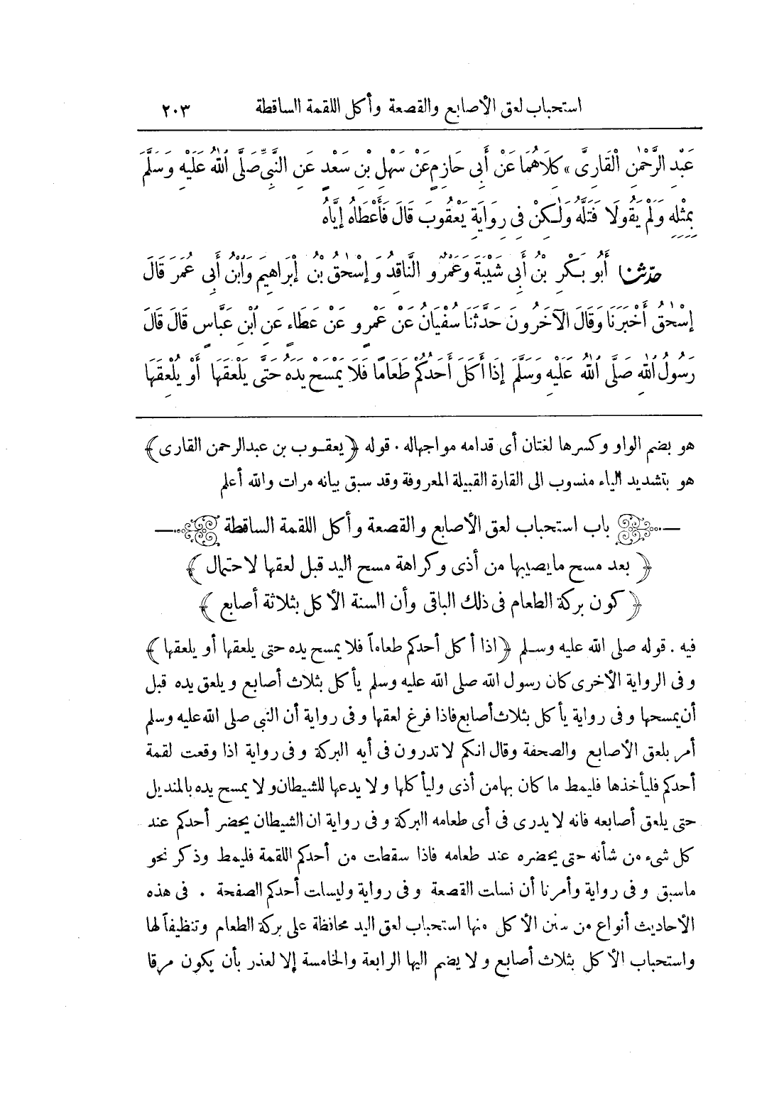(باب استحباب لعق الأصابعوالقصعة وأكل اللقمة الساقطة بعد مسح مايصيبها مِنْ أَذًى وَكَرَاهَةِ مَسْحِ الْيَدِ قَبْلَ لَعْقِهَا لاحتمال كون بركة الطعام فى ذلك الباقى وأن السنة الأكل بثلاثة أصابع فِيهِ)