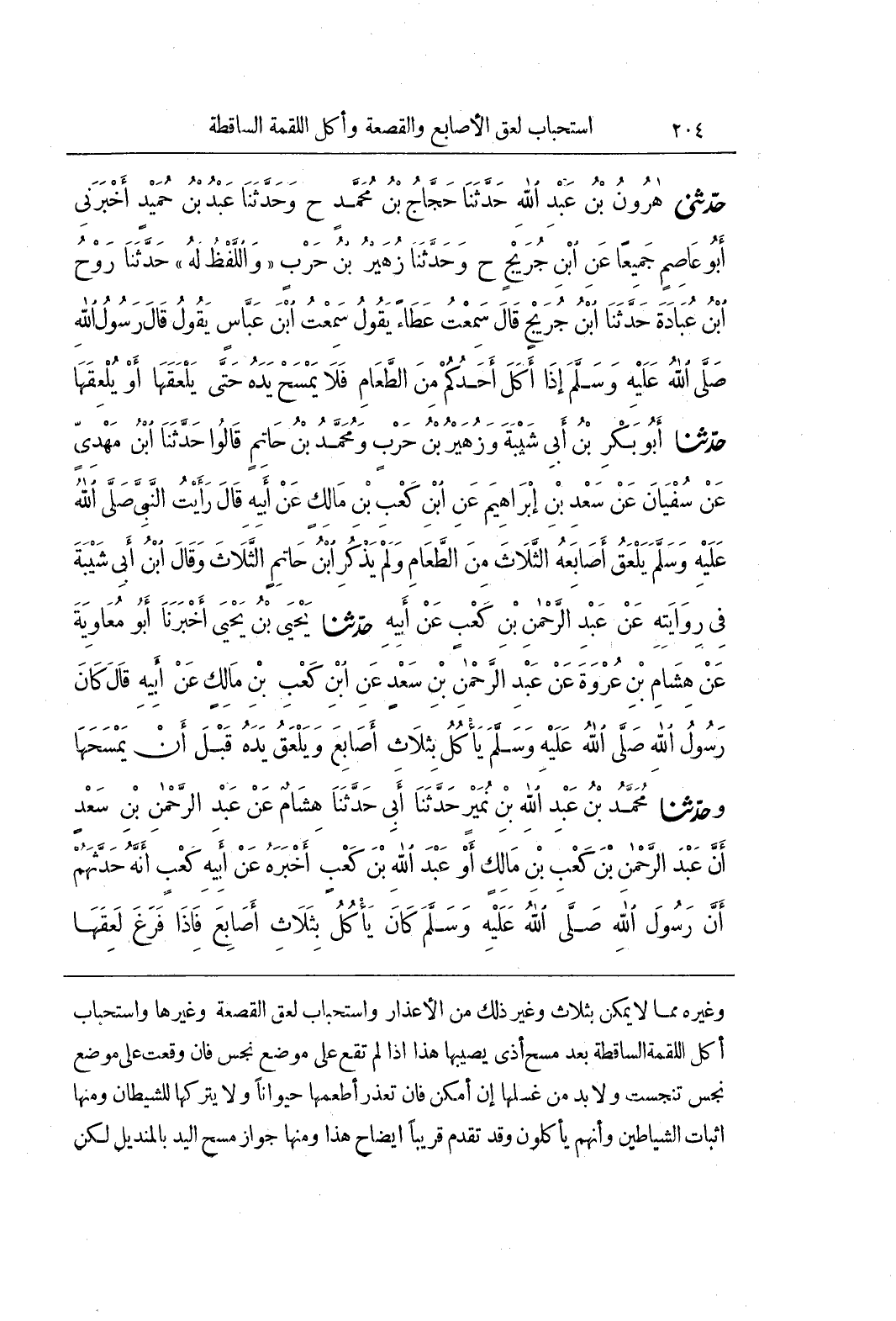 وغيره مما لايمكن بِثَلَاثٍ وَغَيْرِ ذَلِكَ مِنَ الْأَعْذَارِ وَاسْتِحْبَابُ لَعْقِ الْقَصْعَةِ وَغَيْرِهَا وَاسْتِحْبَابُ أَكْلِ اللُّقْمَةِ السَّاقِطَةِ بَعْدَ مَسْحِ أَذًى يُصِيبُهَا هَذَا إِذَا لَمْ تَقَعْ عَلَى مَوْضِعٍ نَجِسٍ فَإِنْ وَقَعَتْ عَلَى مَوْضِعٍ نجس تنجست ولابد مِنْ غَسْلِهَا إِنْ أَمْكَنَ فَإِنْ تَعَذَّرَ أَطْعَمَهَا حيوانا ولايتركها لِلشَّيْطَانِ وَمِنْهَا إِثْبَاتُ الشَّيَاطِينِ وَأَنَّهُمْ يَأْكُلُونَ وَقَدْ تَقَدَّمَ قَرِيبًا إِيضَاحُ هَذَا وَمِنْهَا جَوَازُ مَسْحِ الْيَدِ بِالْمِنْدِيلِ لَكِنَّ