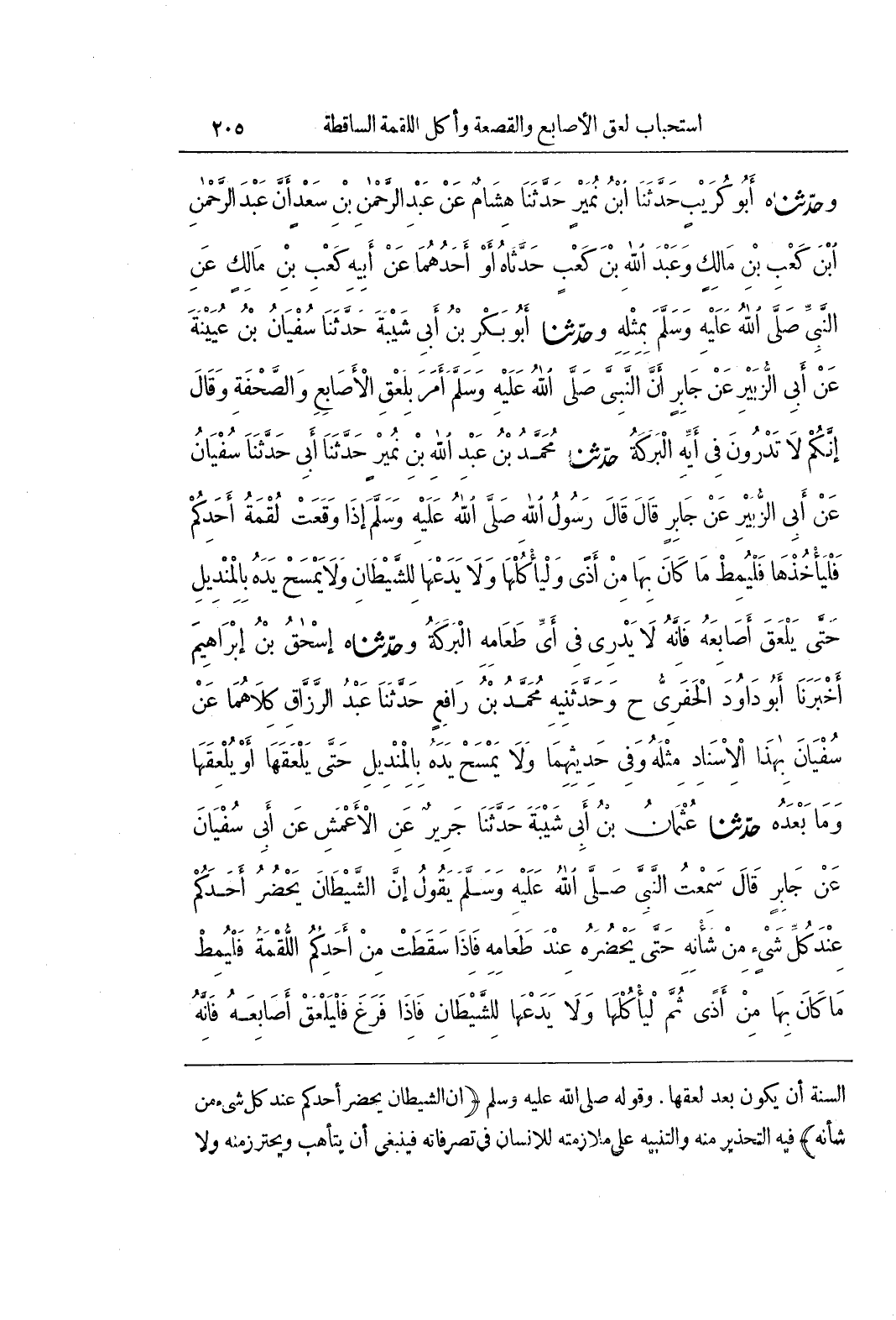 السُّنَّةَ أَنْ يَكُونَ بَعْدَ لَعْقِهَا وَقَوْلُهُ صَلَّى اللَّهُ عَلَيْهِ وَسَلَّمَ (إِنَّ الشَّيْطَانَ يَحْضُرُ أَحَدَكُمْ عِنْدَ كُلِّ شَيْءٍ مِنْ شَأْنِهِ) فِيهِ التَّحْذِيرُ مِنْهُ وَالتَّنْبِيهُ عَلَى مُلَازَمَتِهِ لِلْإِنْسَانِ فِي تَصَرُّفَاتِهِ فَيَنْبَغِي أَنْ يَتَأَهَّبَ وَيَحْتَرِزَ مِنْهُ وَلَا