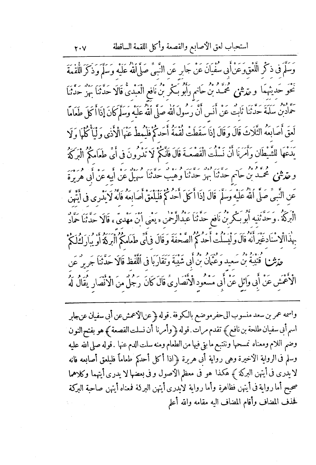 [2035] وَهِيَ رِوَايَةُ أَبِي هُرَيْرَةَ (إِذَا أكل أحدكم طعاما فليلعق أصابعه فانه لايدرى فِي أَيَّتِهِنَّ الْبَرَكَةُ) هَكَذَا هُوَ فِي مُعْظَمِ الْأُصُولِ وَفِي بَعْضِهَا لَا يَدْرِي أَيَّتَهُمَا وَكِلَاهُمَا صَحِيحٌ أَمَّا رِوَايَةُ فِي أَيَّتِهِنَّ فَظَاهِرَةٌ وَأَمَّا رواية لايدرى أَيَّتَهُنَّ الْبَرَكَةَ فَمَعْنَاهُ أَيَّتُهُنَّ صَاحِبَةُ الْبَرَكَةِ فَحَذَفَ الْمُضَافَ وَأَقَامَ الْمُضَافَ إِلَيْهِ مَقَامَهُ وَاللَّهُ أَعْلَمُ