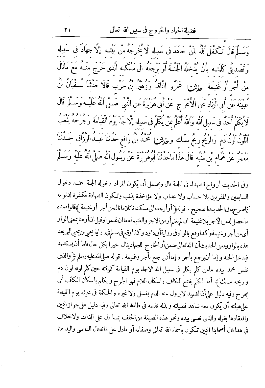 وَفِي الْحَدِيثِ أَرْوَاحُ الشُّهَدَاءِ فِي الْجَنَّةِ قَالَ وَيَحْتَمِلُ أَنْ يَكُونَ الْمُرَادُ دُخُولَهُ الْجَنَّةَ عِنْدَ دُخُولِ السَّابِقِينَ وَالْمُقَرَّبِينَ بِلَا حِسَابٍ وَلَا عَذَابٍ وَلَا مُؤَاخَذَةٍ بِذَنْبٍ وَتَكُونُ الشَّهَادَةُ مُكَفِّرَةً لِذُنُوبِهِ كَمَا صَرَّحَ بِهِ فِي الْحَدِيثِ الصَّحِيحِ قَوْلُهُ (أَوْ أَرْجِعَهُ إِلَى مَسْكَنِهِ نَائِلًا مَا نَالَ مِنَ أَجْرٍ أَوْ غَنِيمَةٍ) قَالُوا مَعْنَاهُ مَا حَصَلَ لَهُ مِنَ الْأَجْرِ بِلَا غَنِيمَةٍ إِنْ لَمْ يَغْنَمْ أَوْ مِنَ الْأَجْرِ وَالْغَنِيمَةِ مَعًا إِنْ غَنِمُوا وَقِيلَ إِنَّ أَوْ هُنَا بِمَعْنَى الْوَاوِ أَيْ مِنْ أَجْرٍ وَغَنِيمَةٍ وَكَذَا وَقَعَ بِالْوَاوِ فِي رِوَايَةِ أَبِي دَاوُدَ وَكَذَا وَقَعَ فِي مُسْلِمٍ فِي رِوَايَةِ يَحْيَى بْنِ يَحْيَى الَّتِي بَعْدَ هَذِهِ بِالْوَاوِ وَمَعْنَى الْحَدِيثِ أَنَّ اللَّهَ تَعَالَى ضَمِنَ أَنَّ الْخَارِجَ لِلْجِهَادِ يَنَالُ خَيْرًا بِكُلِّ حَالٍ فَإِمَّا أَنْ يُسْتَشْهَدَ فَيَدْخُلَ الْجَنَّةَ وَإِمَّا أَنْ يَرْجِعَ بِأَجْرٍ وَإِمَّا أَنْ يَرْجِعَ بِأَجْرٍ وَغَنِيمَةٍ قَوْلُهُ صَلَّى اللَّهُ عَلَيْهِ وَسَلَّمَ (وَالَّذِي نَفْسُ مُحَمَّدٍ بيده مامن كَلْمٍ يُكْلَمُ فِي سَبِيلِ اللَّهِ إِلَّا جَاءَ يَوْمَ الْقِيَامَةِ كَهَيْئَتِهِ حِينَ كُلِمَ لَوْنُهُ لَوْنُ دَمٍ وَرِيحُهُ مِسْكٌ) أَمَّا الْكَلْمُ بِفَتْحِ الْكَافِ وَإِسْكَانِ اللَّامِ فَهُوَ الْجُرْحُ وَيُكْلَمُ بِإِسْكَانِ الْكَافِ أَيْ يُجْرَحُ وَفِيهِ دَلِيلٌ عَلَى أَنَّ الشَّهِيدَ لايزول عنه الدم بغسل ولاغيره وَالْحِكْمَةُ فِي مَجِيئِهِ يَوْمَ الْقِيَامَةِ عَلَى هَيْئَتِهِ أَنْ يَكُونَ مَعَهُ شَاهِدَ فَضِيلَتِهِ وَبَذْلِهِ نَفْسَهُ فِي طَاعَةِ اللَّهِ تَعَالَى وَفِيهِ دَلِيلٌ عَلَى جَوَازِ الْيَمِينِ وَانْعِقَادِهَا بِقَوْلِهِ وَالَّذِي نَفْسِي بِيَدِهِ وَنَحْوِ هَذِهِ الصِّيغَةِ مِنَ الْحَلِفِ بِمَا يَدُلُّ عَلَى الذَّاتِ وَلَا خِلَافَ فِي هَذَا قَالَ أَصْحَابُنَا الْيَمِينُ تَكُونُ بِأَسْمَاءِ اللَّهِ تَعَالَى وَصِفَاتِهِ أَوْ مَا دَلَّ عَلَى ذَاتِهِ قَالَ الْقَاضِي واليد هنا