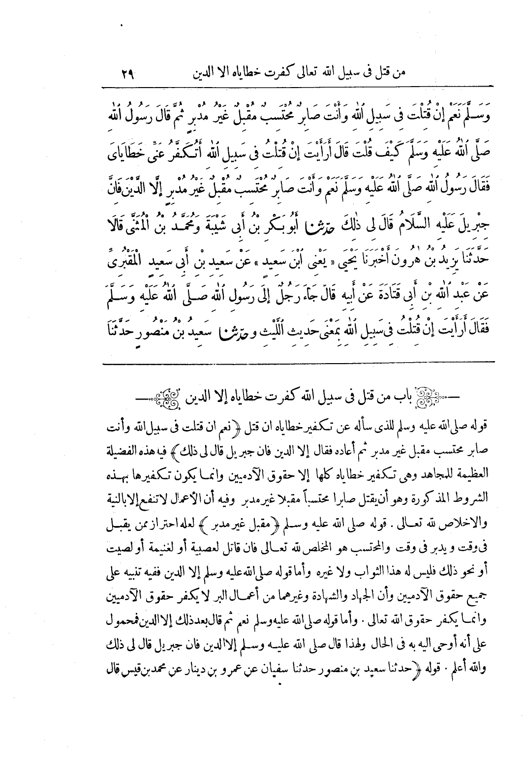 [1885] (نَعَمْ إِنْ قُتِلْتَ فِي سَبِيلِ اللَّهِ وَأَنْتَ صَابِرٌ مُحْتَسِبٌ مُقْبِلٌ غَيْرُ مُدْبِرٍ ثُمَّ أَعَادَهُ فَقَالَ إِلَّا الدَّيْنَ فَإِنَّ جِبْرِيلَ قَالَ لِي ذَلِكَ) فِيهِ هَذِهِ الْفَضِيلَةُ الْعَظِيمَةُ لِلْمُجَاهِدِ وهى تكفير خطاياه كلها إلاحقوق الْآدَمِيِّينَ وَإِنَّمَا يَكُونُ تَكْفِيرُهَا بِهَذِهِ الشُّرُوطِ الْمَذْكُورَةِ وَهُوَ أَنْ يُقْتَلَ صَابِرًا مُحْتَسِبًا مُقْبِلًا غَيْرَ مدبر وفيه أن الأعمال لاتنفع إلابالنية وَالْإِخْلَاصِ لِلَّهِ تَعَالَى قَوْلُهُ صَلَّى اللَّهُ عَلَيْهِ وَسَلَّمَ (مُقْبِلٌ غَيْرُ مُدْبِرٍ) لَعَلَّهُ احْتِرَازٌ مِمَّنْ يُقْبِلُ فِي وَقْتٍ وَيُدْبِرُ فِي وَقْتٍ وَالْمُحْتَسِبُ هُوَ الْمُخْلِصُ لِلَّهِ تَعَالَى فَإِنْ قَاتَلَ لِعَصَبِيَّةٍ أَوْ لِغَنِيمَةٍ أَوْ لِصِيتٍ أَوْ نَحْوِ ذَلِكَ فليس له هذا الثواب ولاغيره وَأَمَّا قَوْلُهُ صَلَّى اللَّهُ عَلَيْهِ وَسَلَّمَ أَلَا الدَّيْنَ فَفِيهِ تَنْبِيهٌ عَلَى جَمِيعِ حُقُوقِ الْآدَمِيِّينَ وَأَنَّ الْجِهَادَ وَالشَّهَادَةَ وَغَيْرَهُمَا مِنْ أَعْمَالِ الْبِرِّ لَا يُكَفِّرُ حُقُوقَ الْآدَمِيِّينَ وَإِنَّمَا يُكَفِّرُ حُقُوقَ اللَّهُ تَعَالَى وَأَمَّا قَوْلُهُ صَلَّى اللَّهُ عَلَيْهِ وَسَلَّمَ نَعَمْ ثُمَّ قَالَ بَعْدَ ذَلِكَ إِلَّا الدَّيْنَ فَمَحْمُولٌ عَلَى أَنَّهُ أُوحِيَ إِلَيْهِ بِهِ فِي الْحَالِ وَلِهَذَا قَالَ صَلَّى اللَّهُ عَلَيْهِ وسلم إلاالدين فَإِنَّ جِبْرِيلَ قَالَ لِي ذَلِكَ وَاللَّهُ أَعْلَمُ