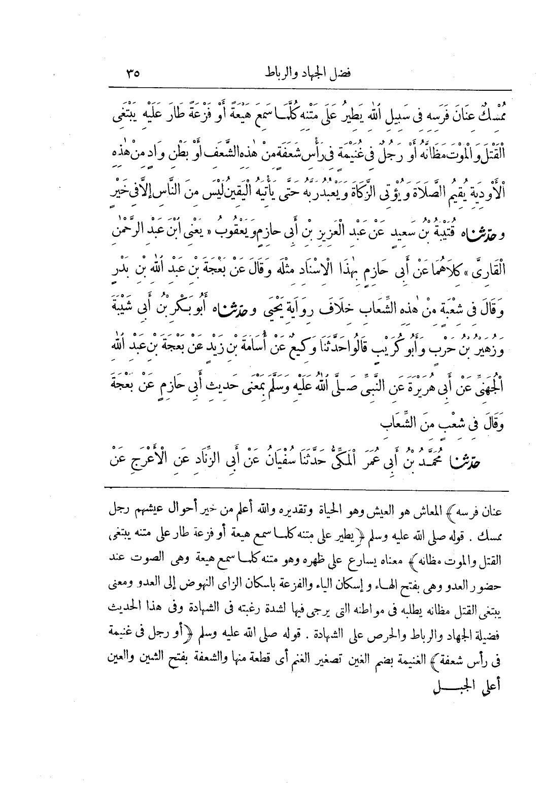 عِنَانَ فَرَسِهِ) الْمَعَاشُ هُوَ الْعَيْشُ وَهُوَ الْحَيَاةُ وَتَقْدِيرُهُ وَاللَّهُ أَعْلَمُ مِنْ خَيْرِ أَحْوَالِ عَيْشِهِمْ رَجُلٌ مُمْسِكٌ قَوْلُهُ صَلَّى اللَّهُ عَلَيْهِ وَسَلَّمَ (يَطِيرُ عَلَى مَتْنِهِ كُلَّمَا سَمِعَ هَيْعَةً أَوْ فَزْعَةً طَارَ عَلَى مَتْنِهِ يَبْتَغِي الْقَتْلَ وَالْمَوْتَ مَظَانَّهُ) مَعْنَاهُ يُسَارِعُ عَلَى ظَهْرِهِ وَهُوَ مَتْنُهُ كُلَّمَا سَمِعَ هَيْعَةً وَهِيَ الصَّوْتُ عِنْدَ حُضُورِ العدو وهى بفتح الهاء وإسكان الياء والفزعة بِإِسْكَانِ الزَّايِ وَهِيَ النُّهُوضُ إِلَى الْعَدُوِّ وَمَعْنَى يَبْتَغِي الْقَتْلَ مَظَانَّهُ يَطْلُبُهُ فِي مَوَاطِنِهِ الَّتِي يُرْجَى فِيهَا لِشِدَّةِ رَغْبَتِهِ فِي الشَّهَادَةِ وَفِي هذا الحديث فضيلة الجهاد والرباط وَالْحِرْصُ عَلَى الشَّهَادَةِ قَوْلُهُ صَلَّى اللَّهُ عَلَيْهِ وَسَلَّمَ (أَوْ رَجُلٌ فِي غُنَيْمَةٍ فِي رَأْسِ شَعَفَةٍ) الْغُنَيْمَةُ بِضَمِّ الْغَيْنِ تَصْغِيرُ الْغَنَمِ أَيْ قطعة منها والشعفة بِفَتْحِ الشِّينِ وَالْعَيْنِ أَعْلَى الْجَبَلِ