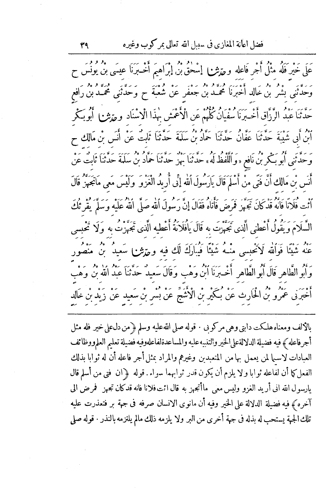 [1894] قَوْلُهُ (إِنَّ فتى من أسلم قال يارسول اللَّهِ إِنِّي أُرِيدَ الْغَزْوَ وَلَيْسَ مَعِي مَا أَتَجَهَّزُ بِهِ قَالَ ائْتِ فُلَانًا فَإِنَّهُ قَدْ كَانَ تَجَهَّزَ فَمَرِضَ إِلَى آخِرِهِ) فِيهِ فَضِيلَةُ الدلالة على الخير وفيه أن مانوى الْإِنْسَانُ صَرْفَهُ فِي جِهَةِ بِرٍّ فَتَعَذَّرَتْ عَلَيْهِ تِلْكَ الْجِهَةُ يُسْتَحَبُّ لَهُ بَذْلُهُ فِي جِهَةٍ أُخْرَى مِنَ الْبِرِّ وَلَا يَلْزَمُهُ ذَلِكَ مَا لَمْ يَلْتَزِمْهُ بِالنَّذْرِ قَوْلُهُ صَلَّى