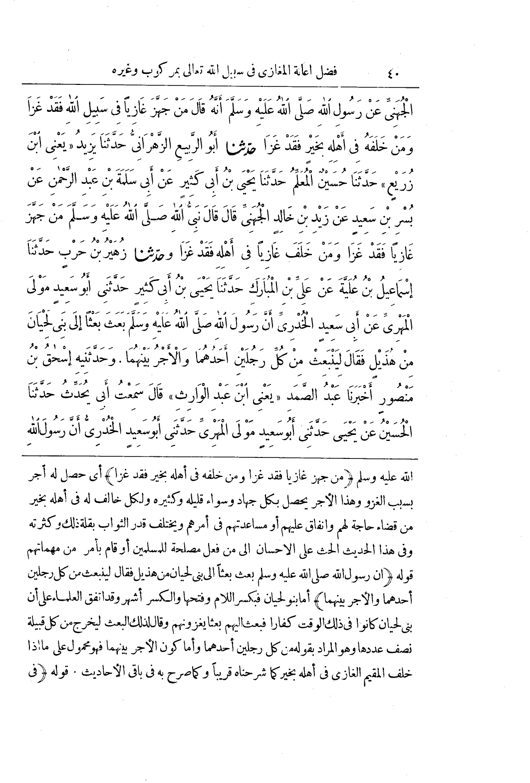 [1895] (مَنْ جَهَّزَ غَازِيًا فَقَدْ غَزَا وَمَنْ خَلَفَهُ فِي أَهْلِهِ بِخَيْرٍ فَقَدْ غَزَا) أَيْ حَصَلَ لَهُ أَجْرٌ بِسَبَبِ الْغَزْوِ وَهَذَا الْأَجْرُ يَحْصُلُ بِكُلِّ جِهَادٍ وَسَوَاءٌ قَلِيلُهُ وَكَثِيرُهُ وَلِكُلِّ خَالِفٍ لَهُ فِي أَهْلِهِ بِخَيْرٍ مِنْ قَضَاءِ حَاجَةٍ لَهُمْ وَإِنْفَاقٍ عَلَيْهِمْ أَوْ مُسَاعَدَتِهِمْ فِي أَمْرِهِمْ وَيَخْتَلِفُ قَدْرُ الثَّوَابِ بِقِلَّةِ ذَلِكَ وَكَثْرَتِهِ وَفِي هَذَا الْحَدِيثِ الْحَثُّ عَلَى الْإِحْسَانِ إِلَى مَنْ فَعَلَ مَصْلَحَةً لِلْمُسْلِمِينَ أَوْ قَامَ بِأَمْرٍ مِنْ مُهِمَّاتِهِمْ قَوْلُهُ